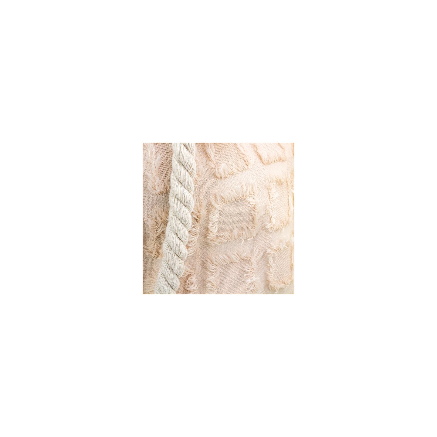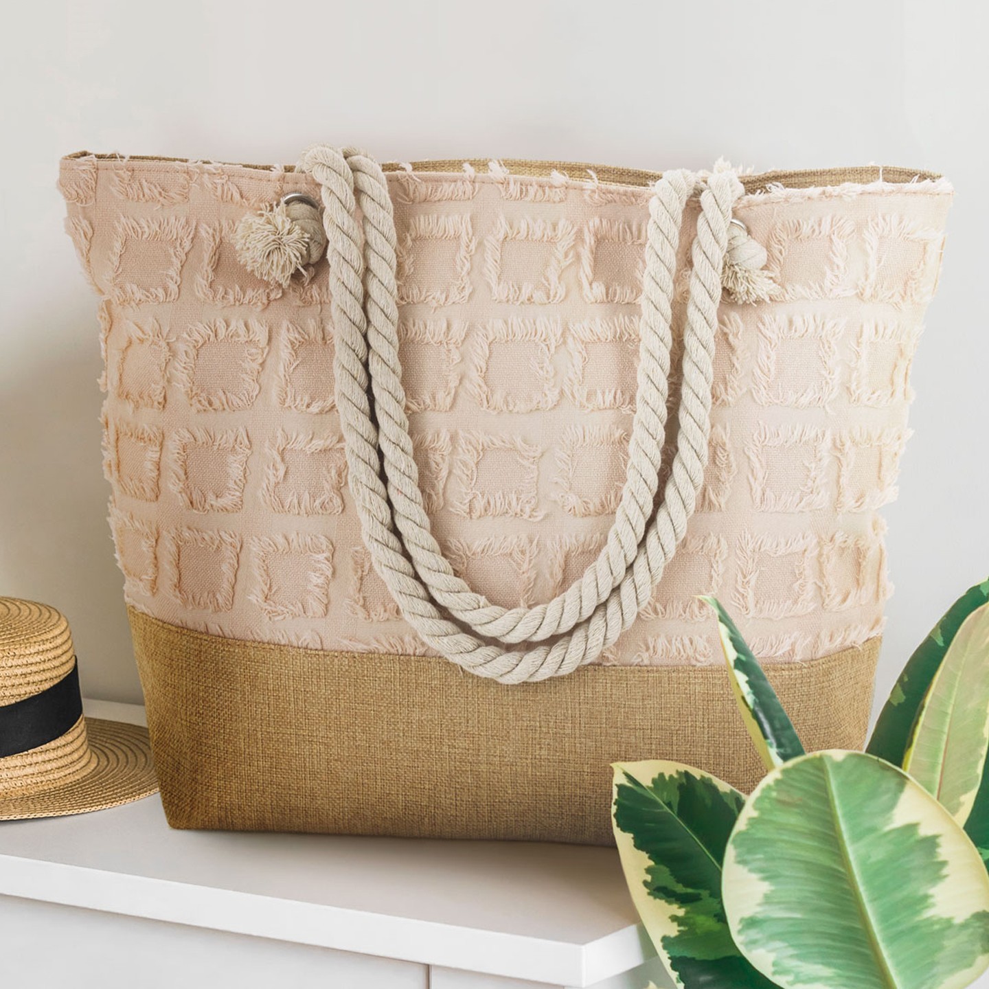 Su diseño único incorpora detalles en relieve con cuadros deshilachados y un sutil efecto de pelillos en la parte superior, aportando un toque sofisticado y artesanal. La base en tejido resistente refuerza su durabilidad, mientras que las asas largas de cordón grueso de algodón trenzado garantizan un agarre firme y cómodo, perfecto para llevarlo al hombro o en la mano.