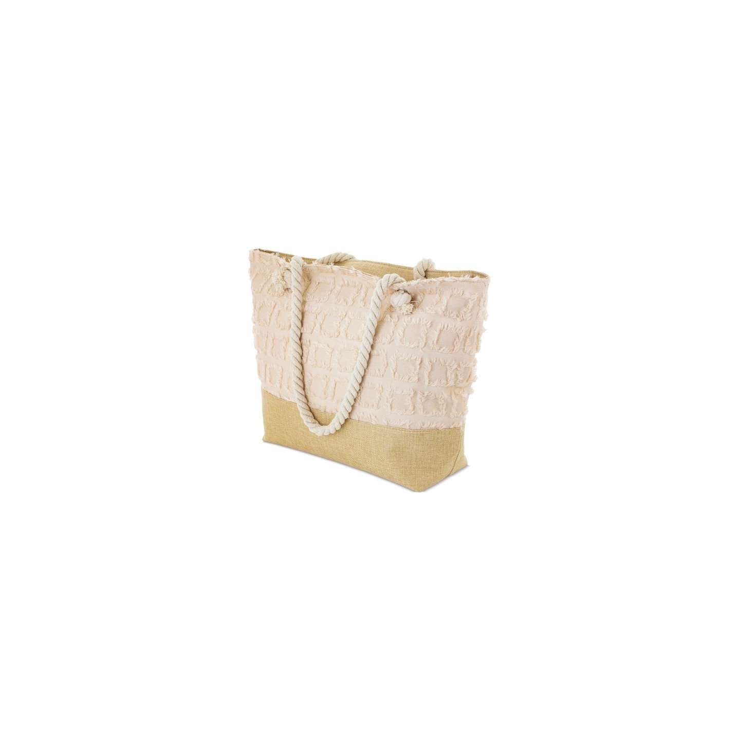 Bolso eco-friendly en Poliéster reciclado y algodón, con asas de cordón grueso y cierre de cremallera. Diseño en relieve, ideal para playa, compras o uso diario