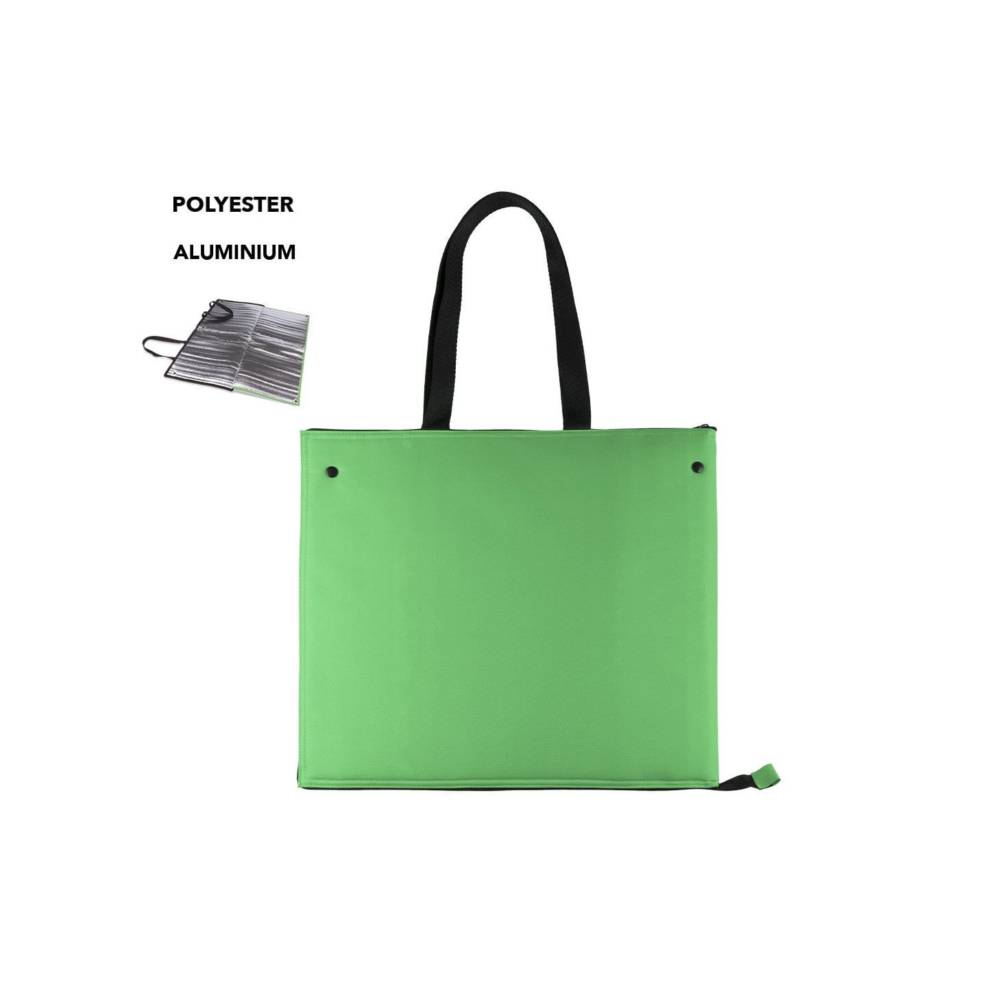 Bolsa nevera en poliéster 600D con cierre de cremallera y asas de transporte. Interior isotermo en acabado de aluminio para mantener frescos los alimentos y bebidas. Ideal para viajes, picnic y eventos al aire libre.