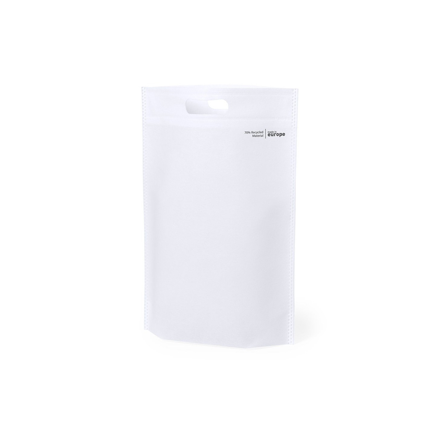 Bolsa Planet, fabricada en non-woven reciclado de 70g/m2, con acabado termosellado, fuelle en la base, asa reforzada y distintivo eco/made in Europe. Ideal para promover la sostenibilidad.