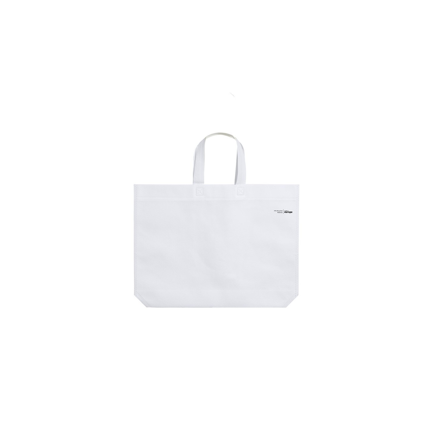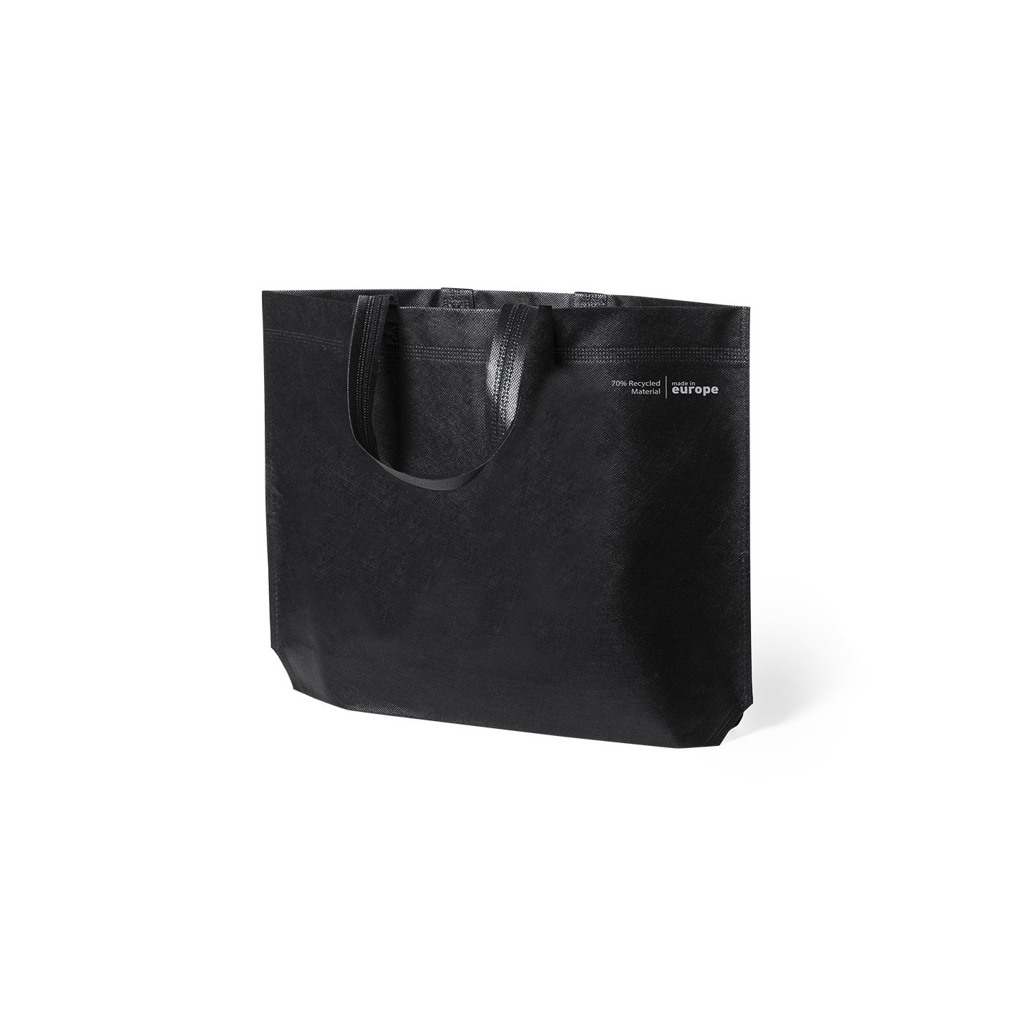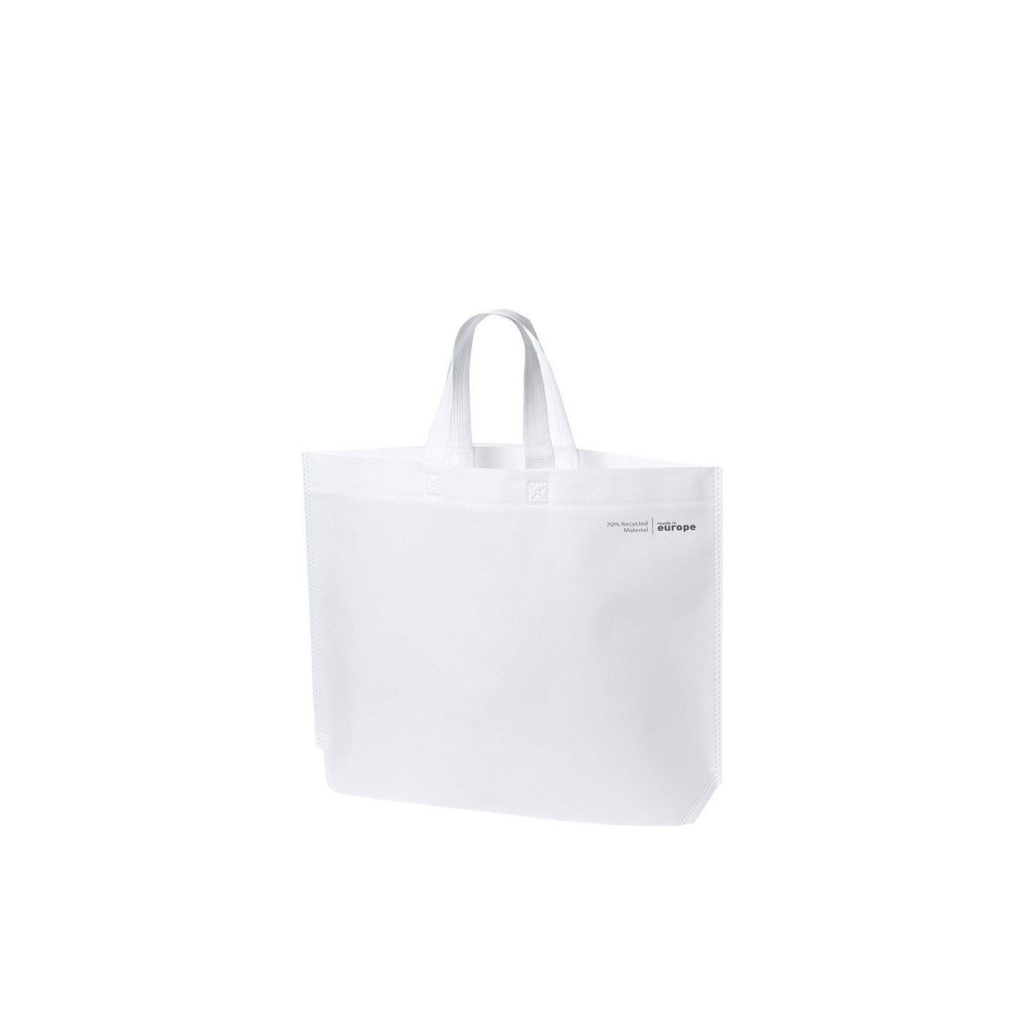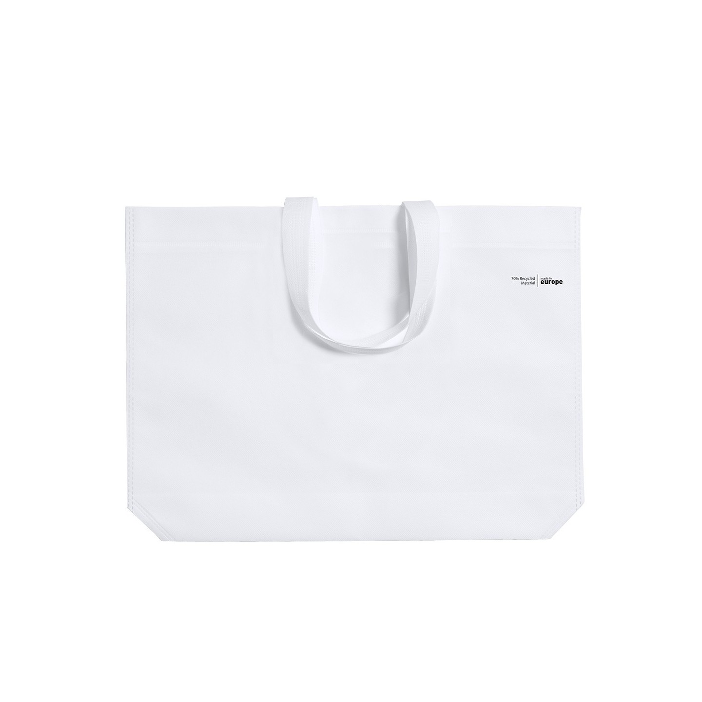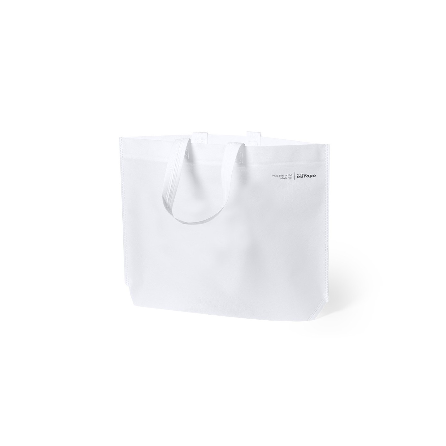 Bolsa nature de non-woven reciclado de 70g/m2 con acabado termosellado, fuelle, asas largas y distintivo eco/made in. Fabricación europea.