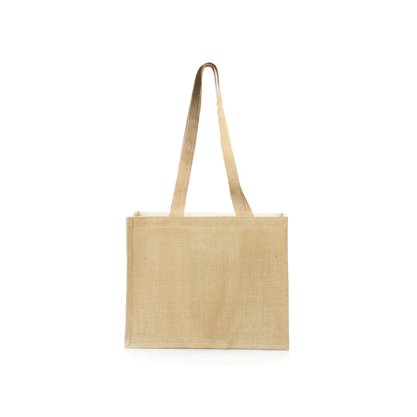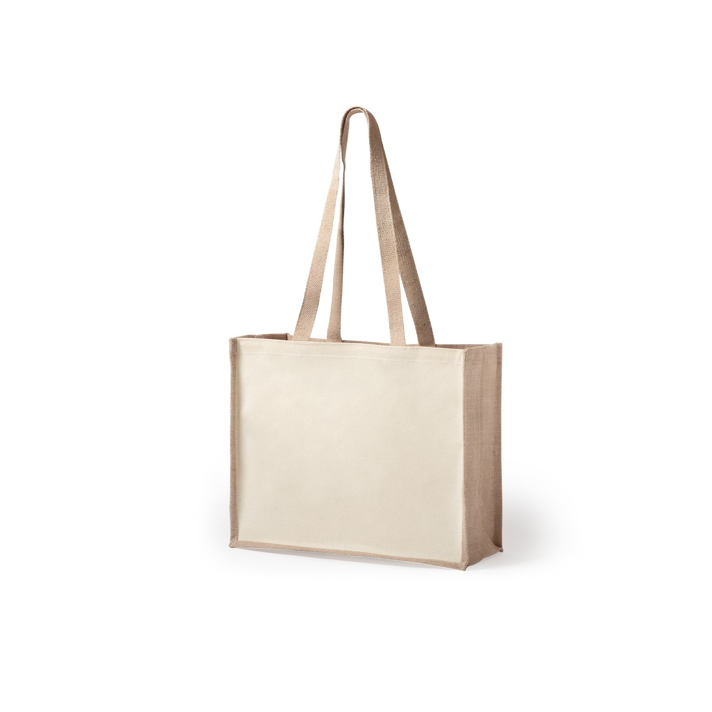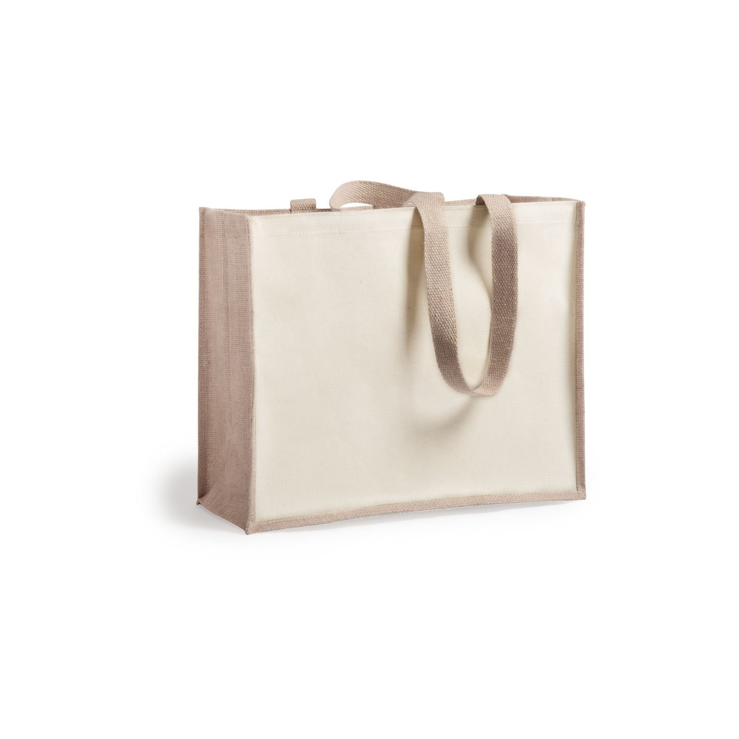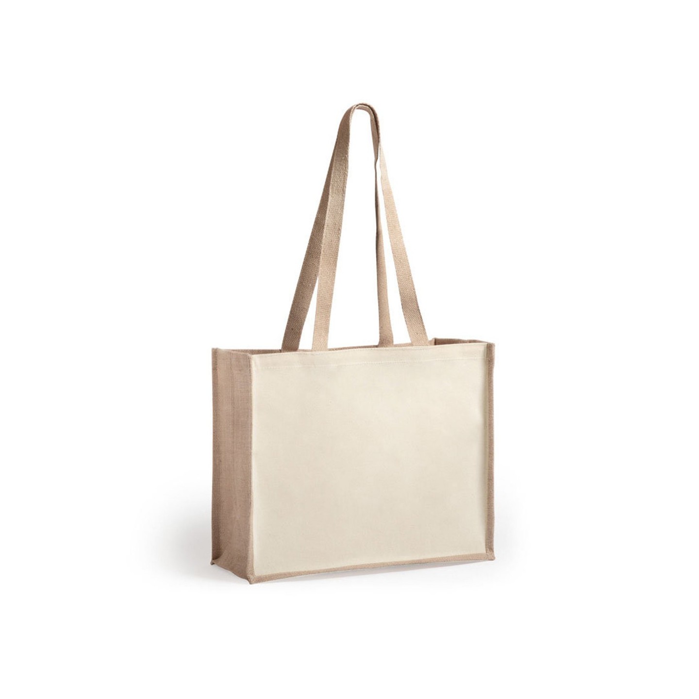 Bolsa de yute y algodón laminado, resistente hasta 12 kg de peso. Asas largas reforzadas y tamaño de 39x31,5+16cm. Ideal para compras y uso diario.