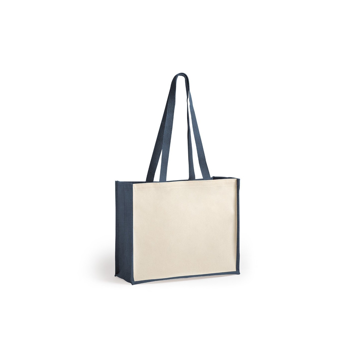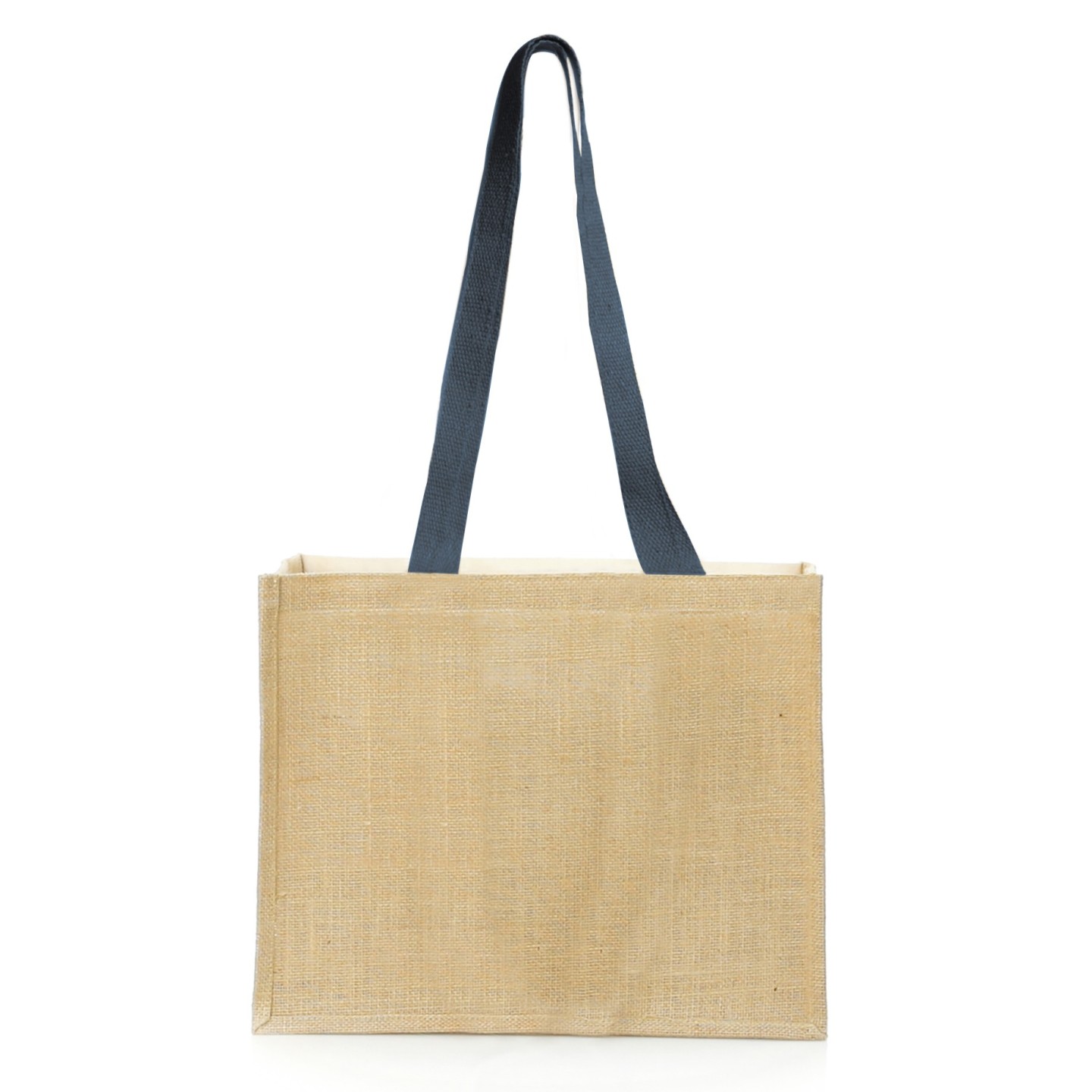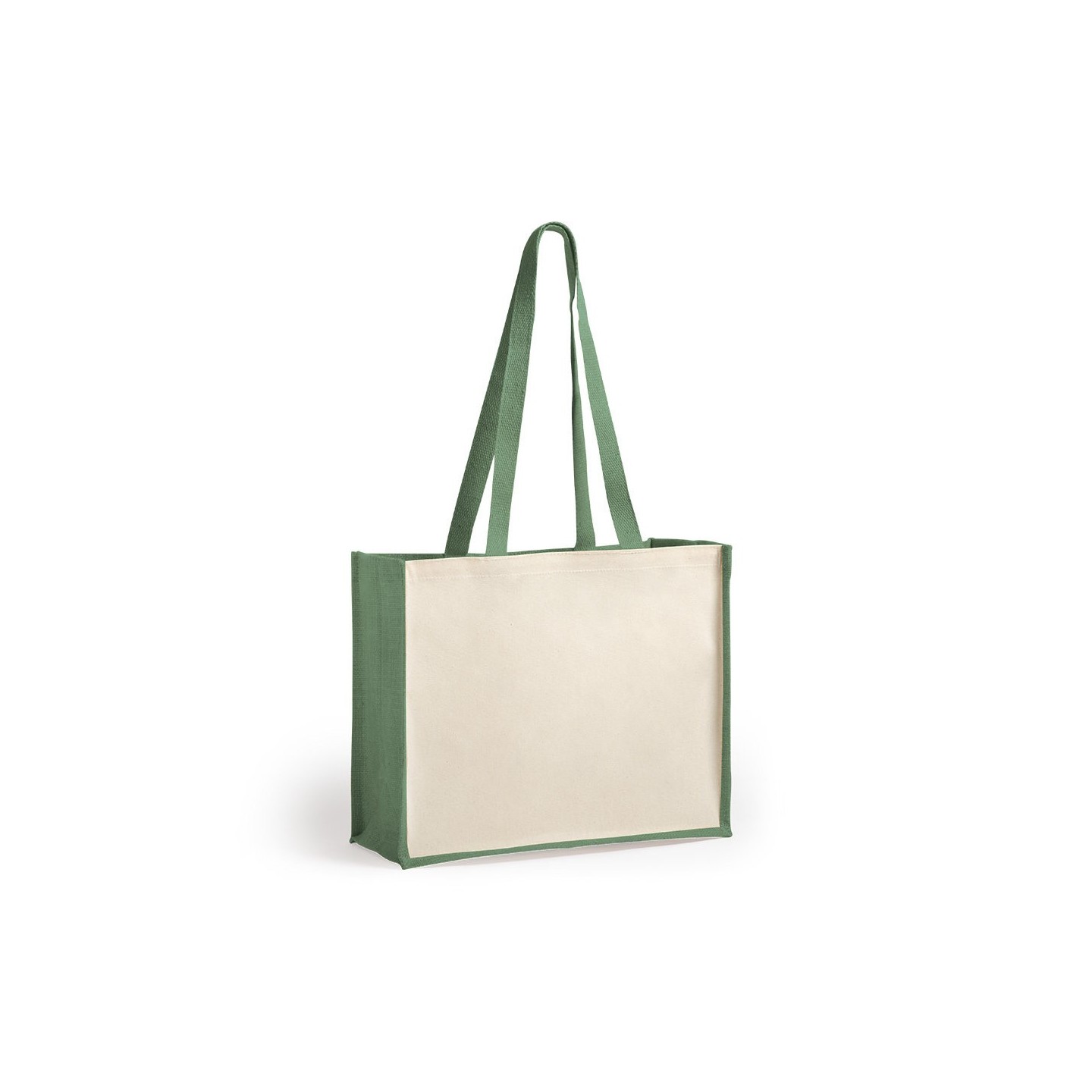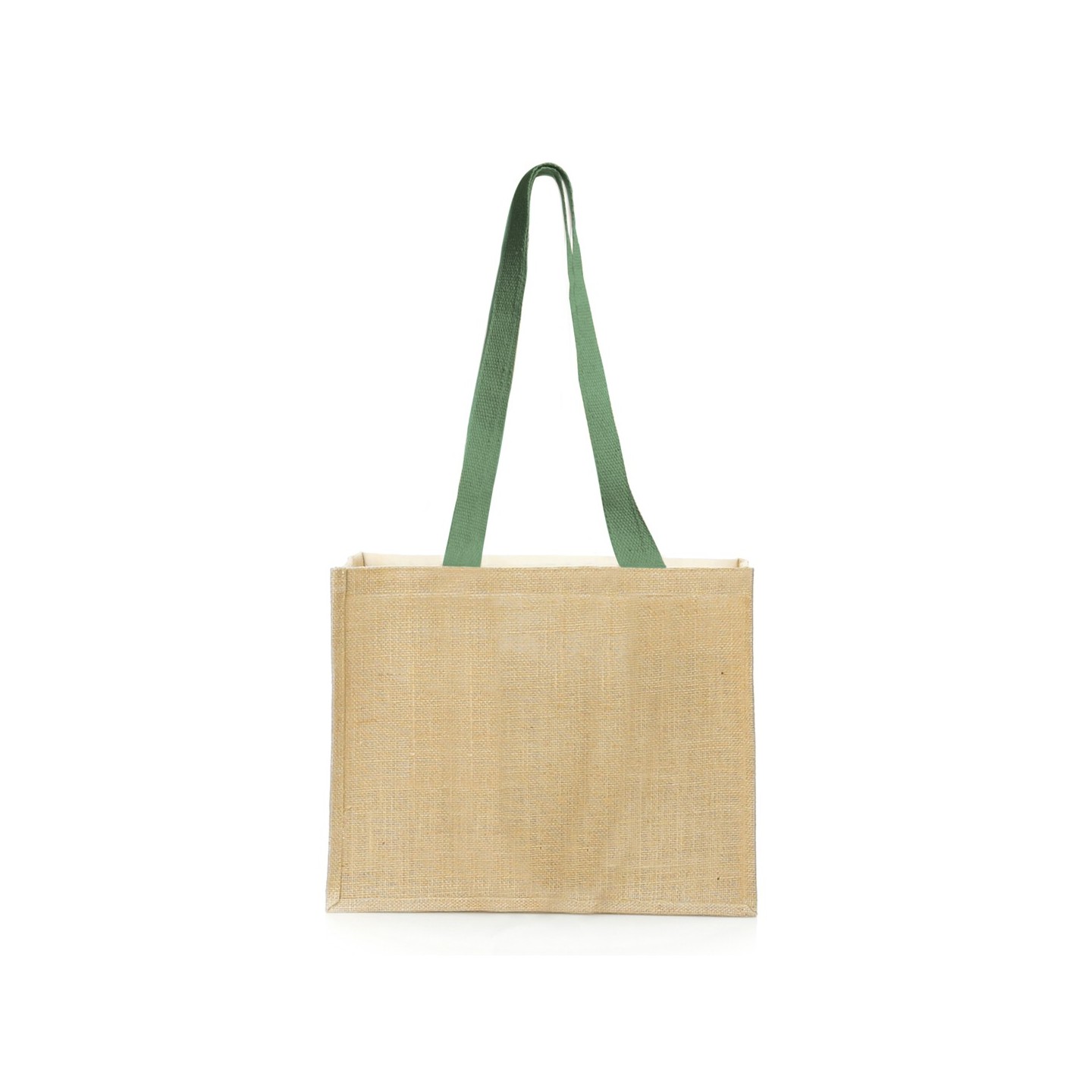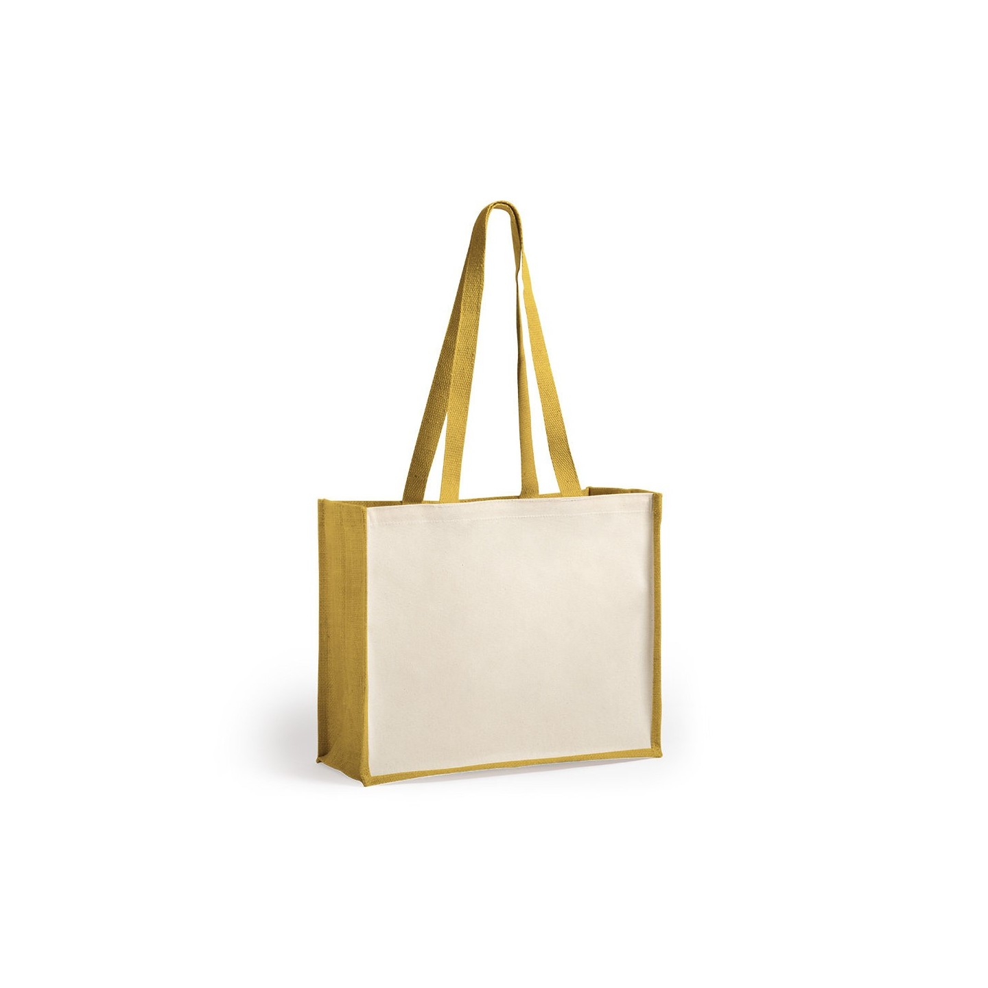 Bolsa de yute y algodón laminado, resistente hasta 12 kg de peso. Asas largas reforzadas y tamaño de 39x31,5+16cm. Ideal para compras y uso diario.