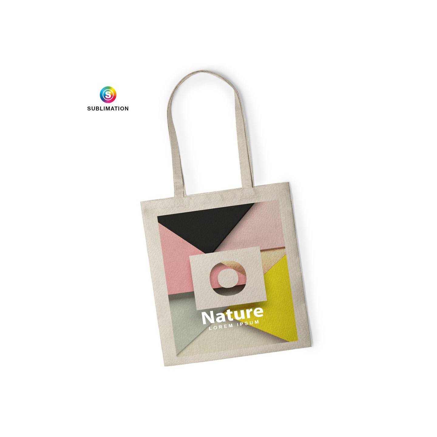 La bolsa de poliéster para sublimación es perfecta para imprimir diseños personalizados. Las asas largas reforzadas y su resistencia de hasta 8 kg la hacen muy práctica.