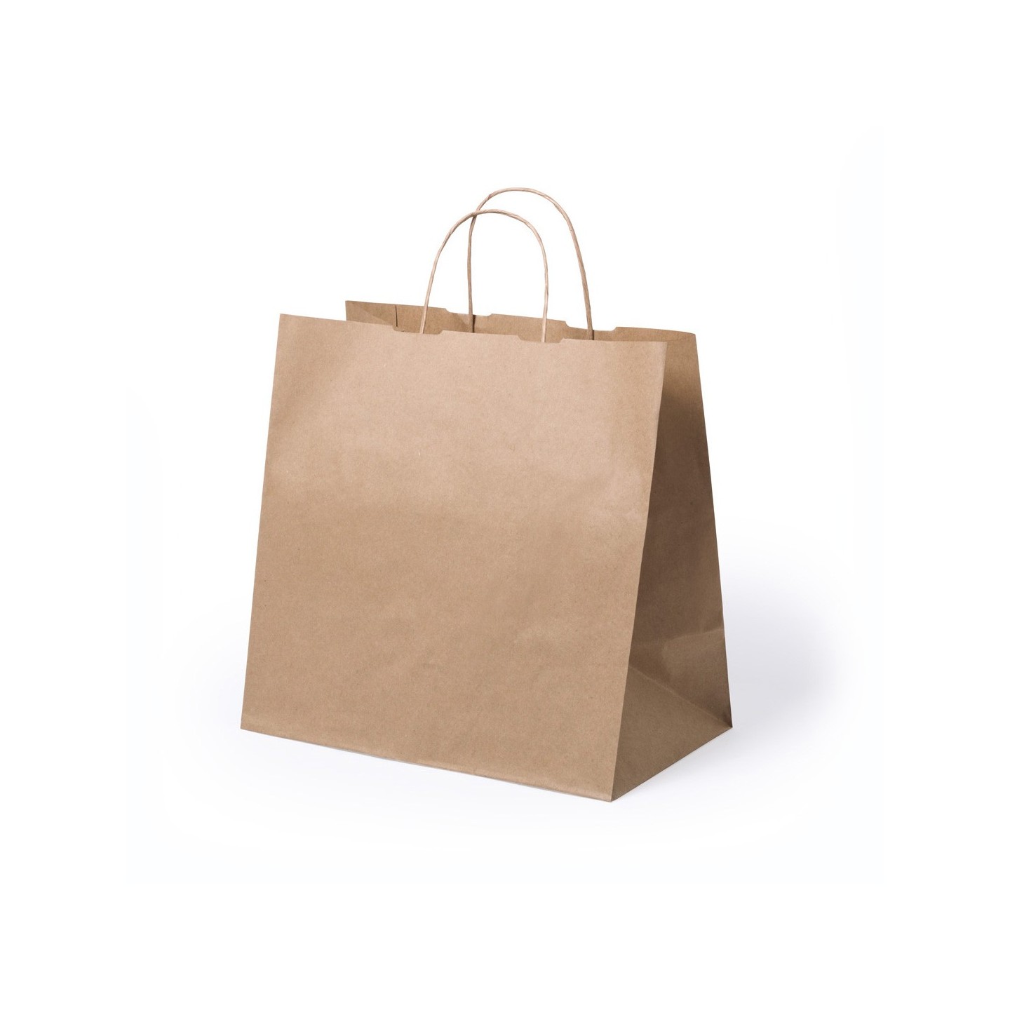 Bolsa Take Away de papel natural de 80g/m2 con asas cortas reforzadas y fuelle. Ideal para llevar tus compras y resistente hasta 5kg de peso.