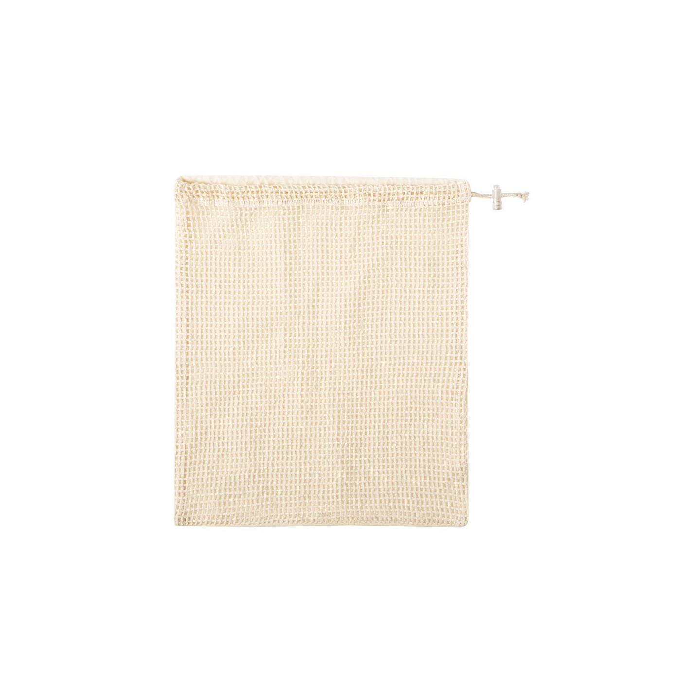 Bolsa de redecilla de algodón crudo de 120g/m2, con cierre de cordón y una cara lisa para impresión. Ideal para personalizar con tu marca.