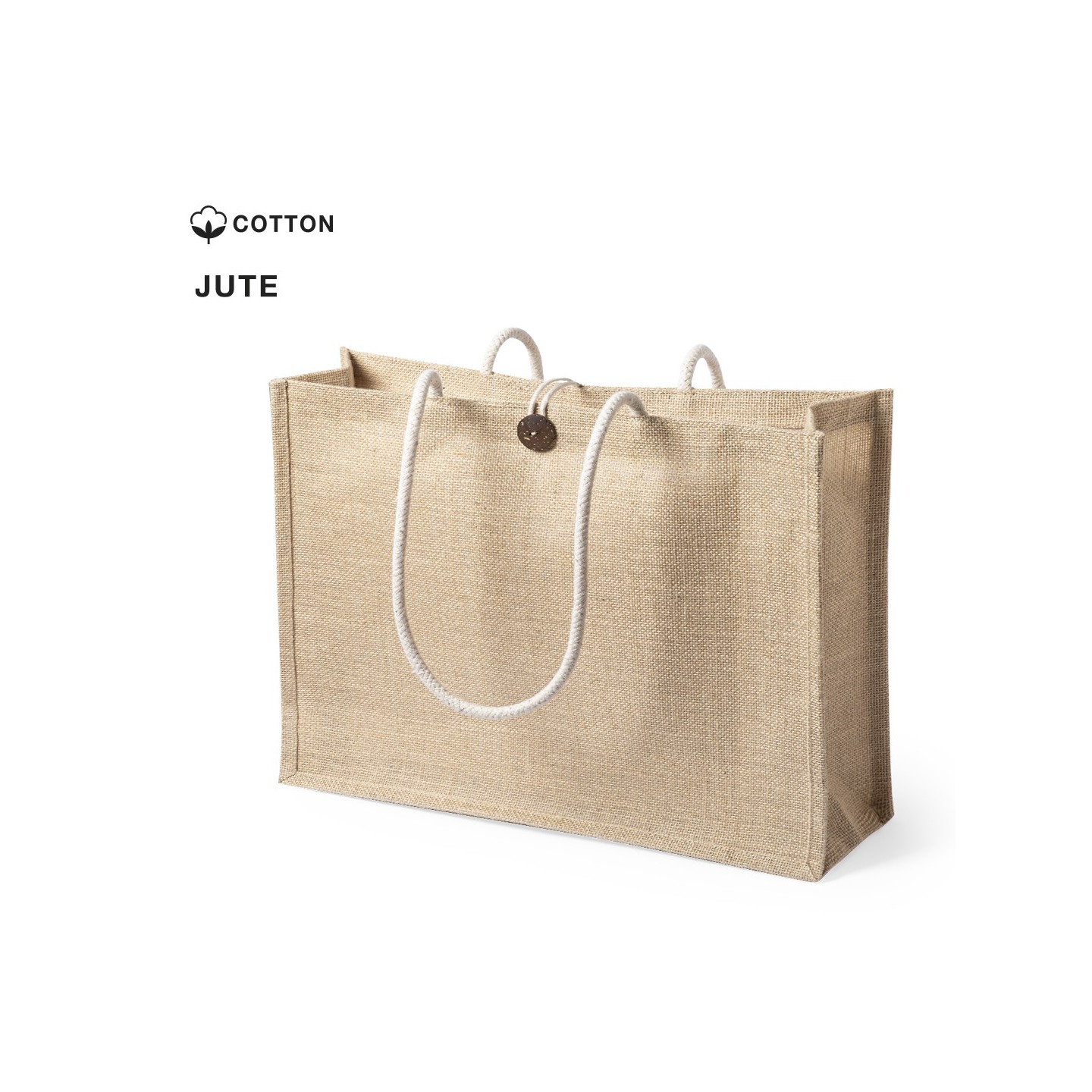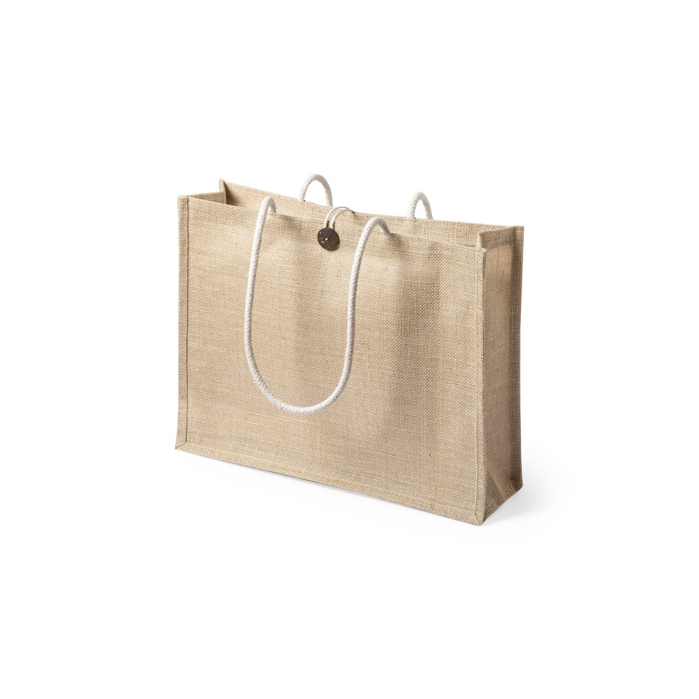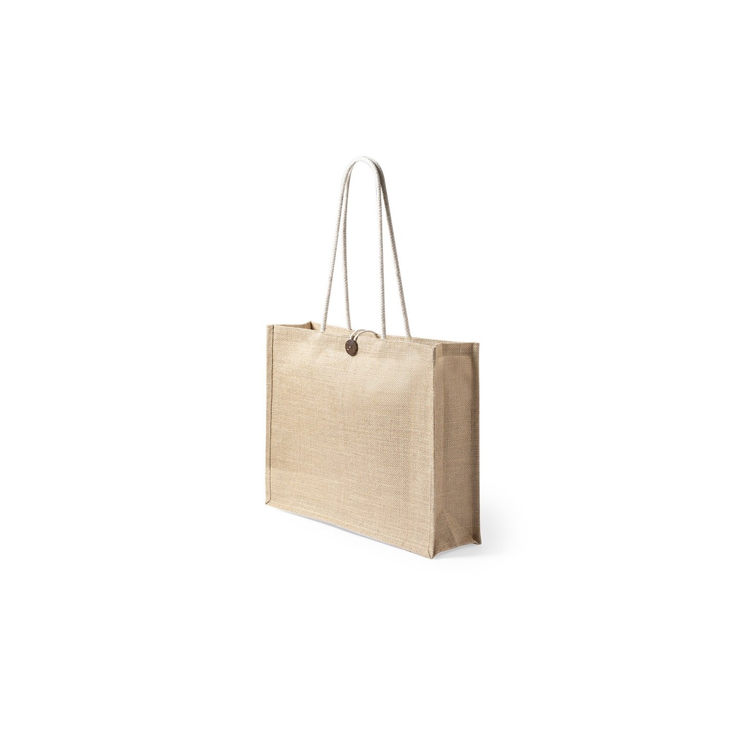 Bolsa de yute laminado con cierre de botón y asas de algodón. Resistente y con capacidad para hasta 10kg. Ideal para compras y uso diario.