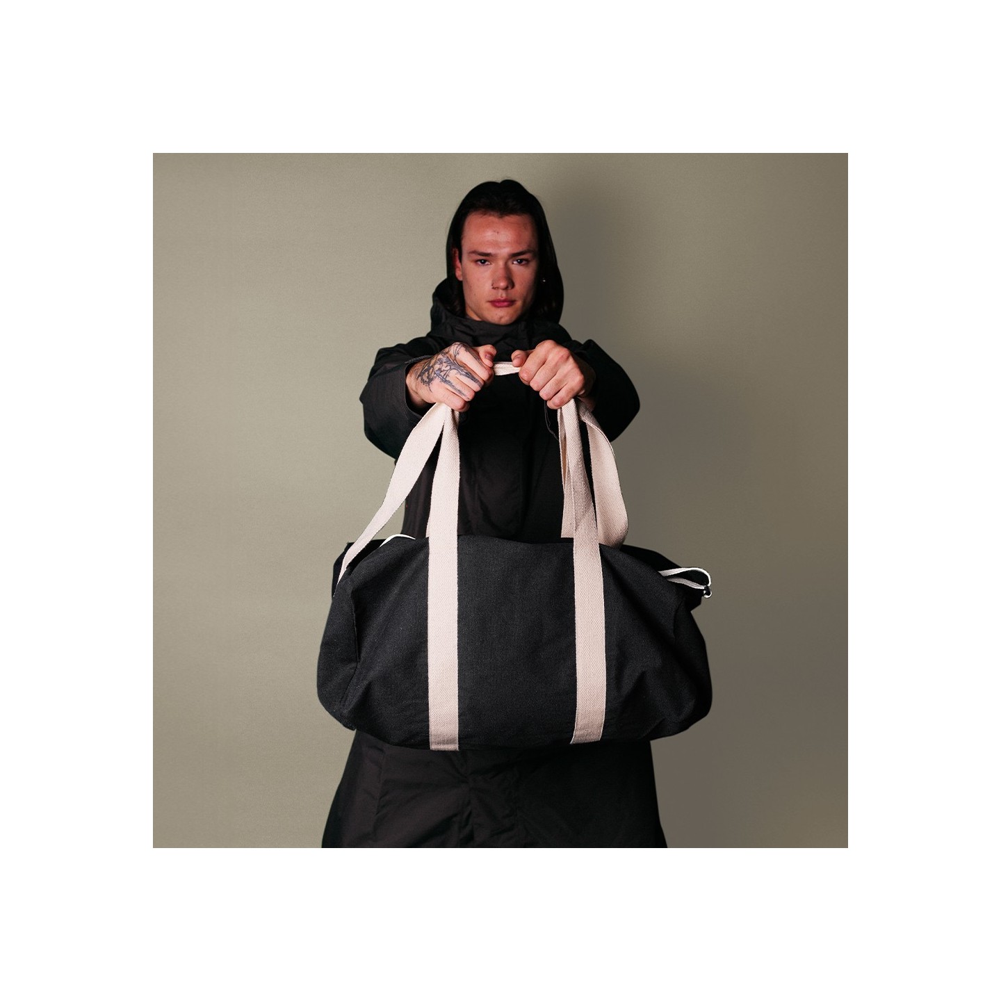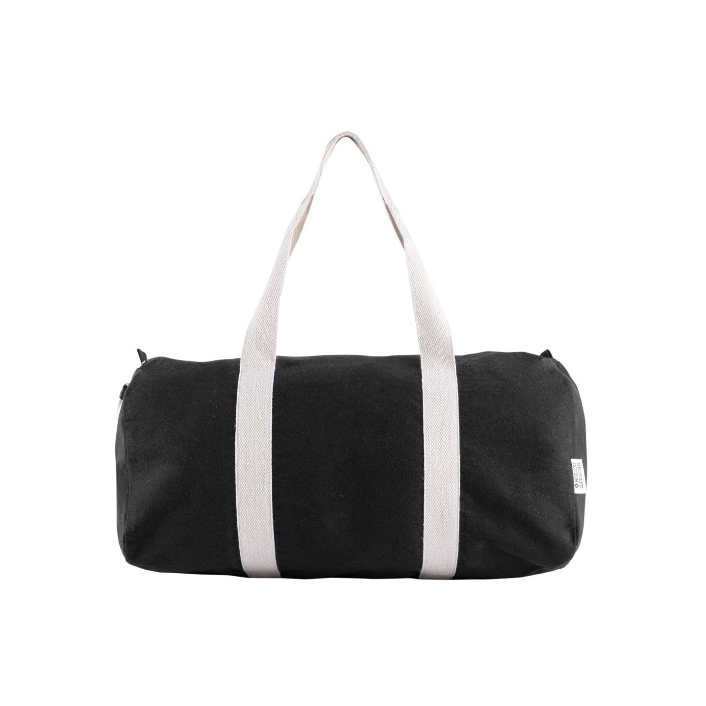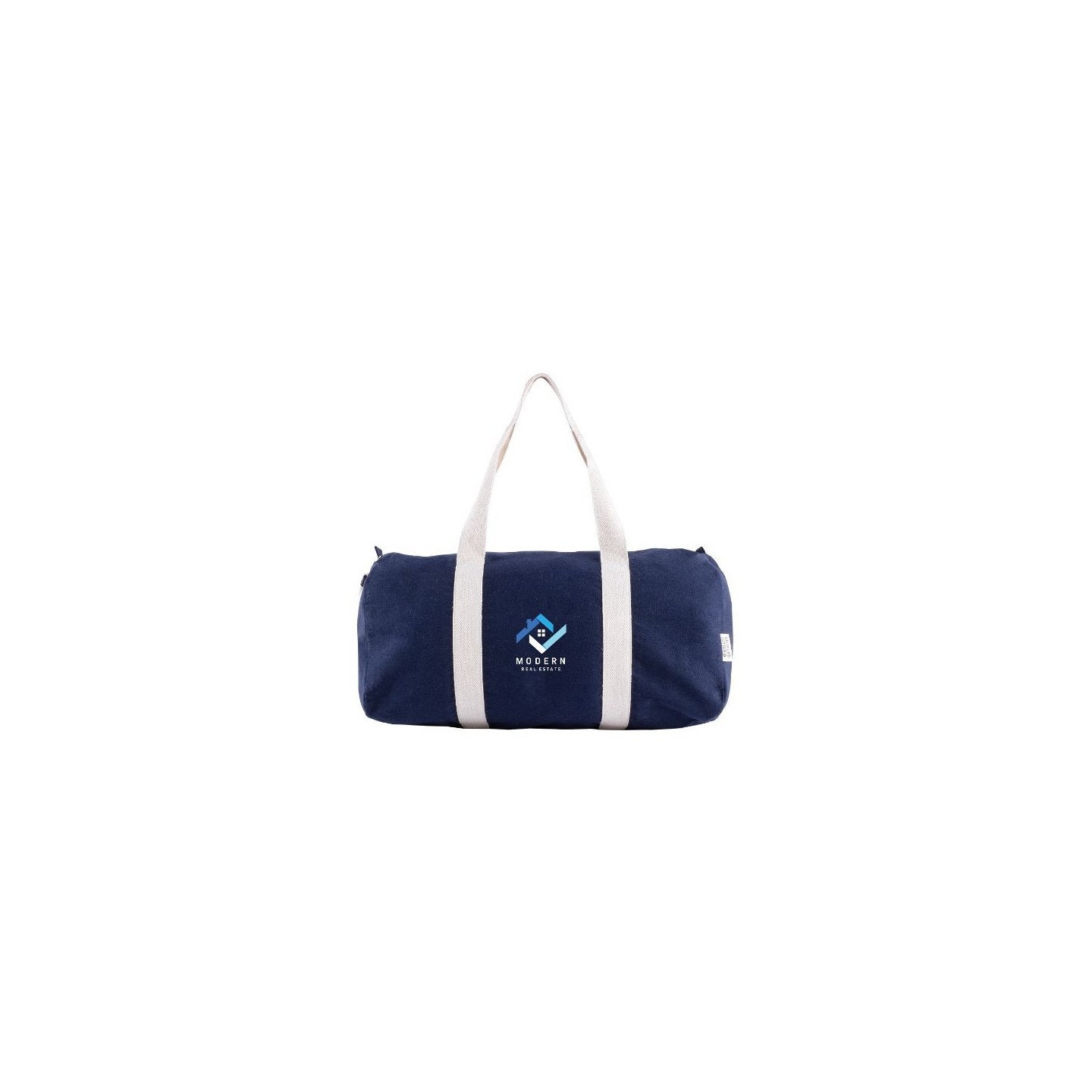 Bolsa de deporte personalizable, fabricada en algodón reciclado canvas con cierre de cremallera, asas ajustables y certificación GRS. Ideal para empresas.