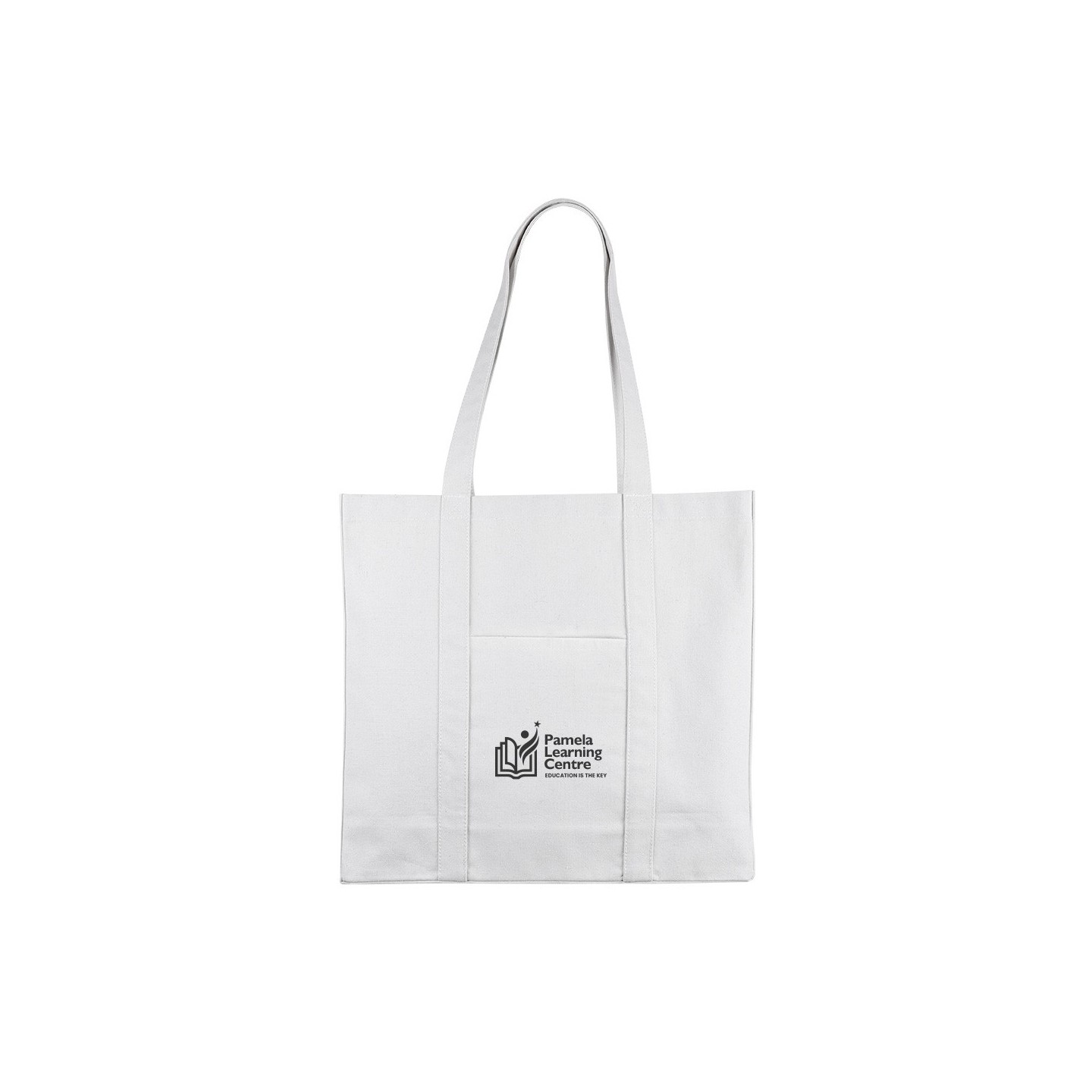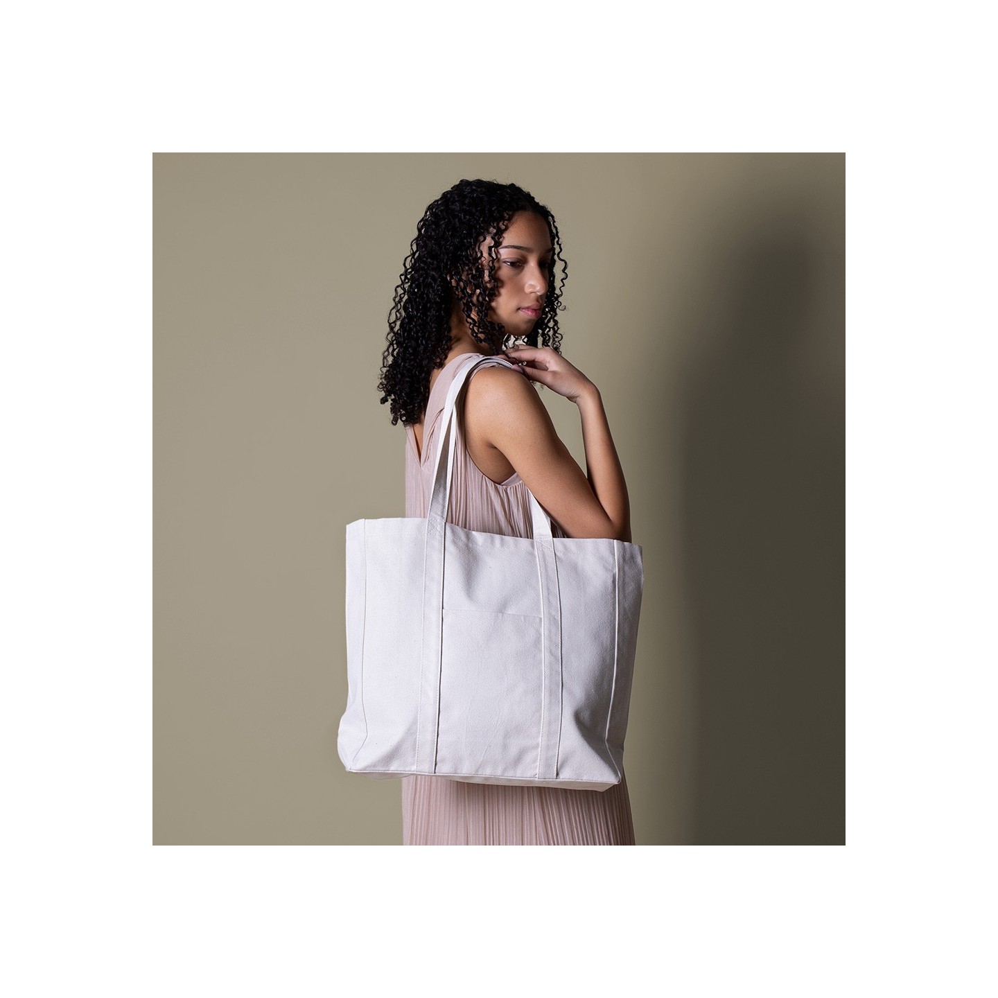 Bolsa WAVE reutilizable de canvas reciclado con bolsillo exterior, cierre de corchete y asas largas reforzadas. Personalizable con tu logotipo. Medidas: 39 x 12 x 38,5 cm.
