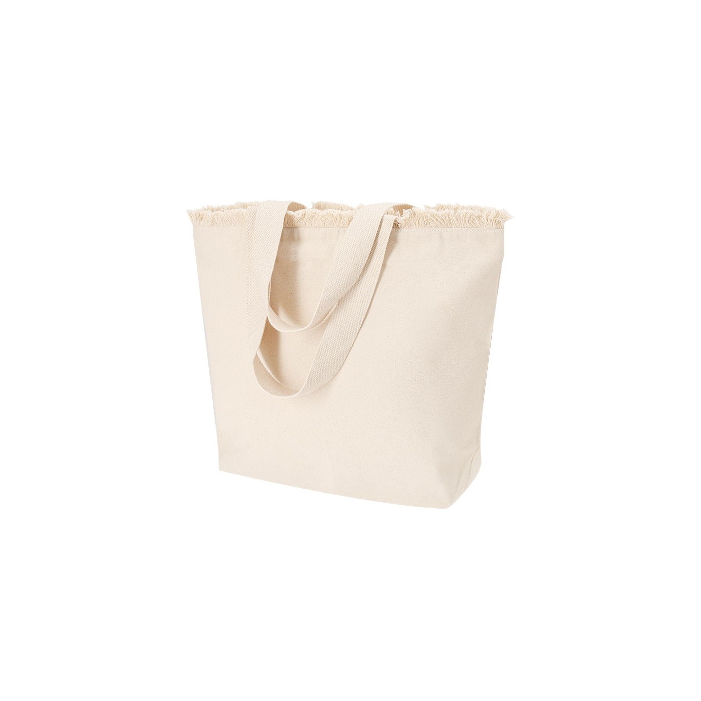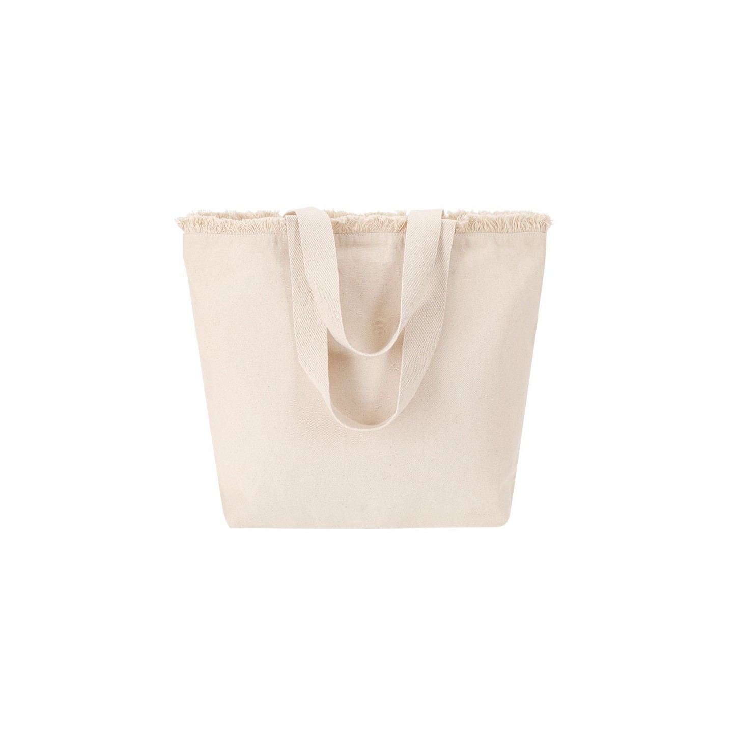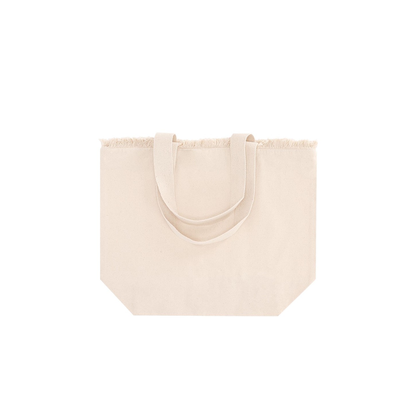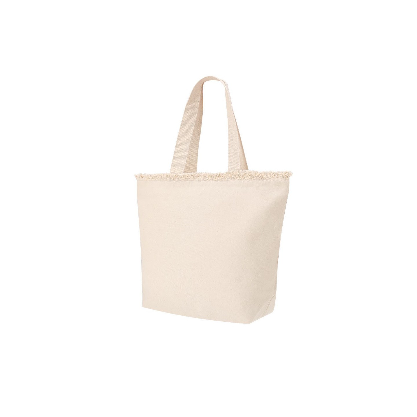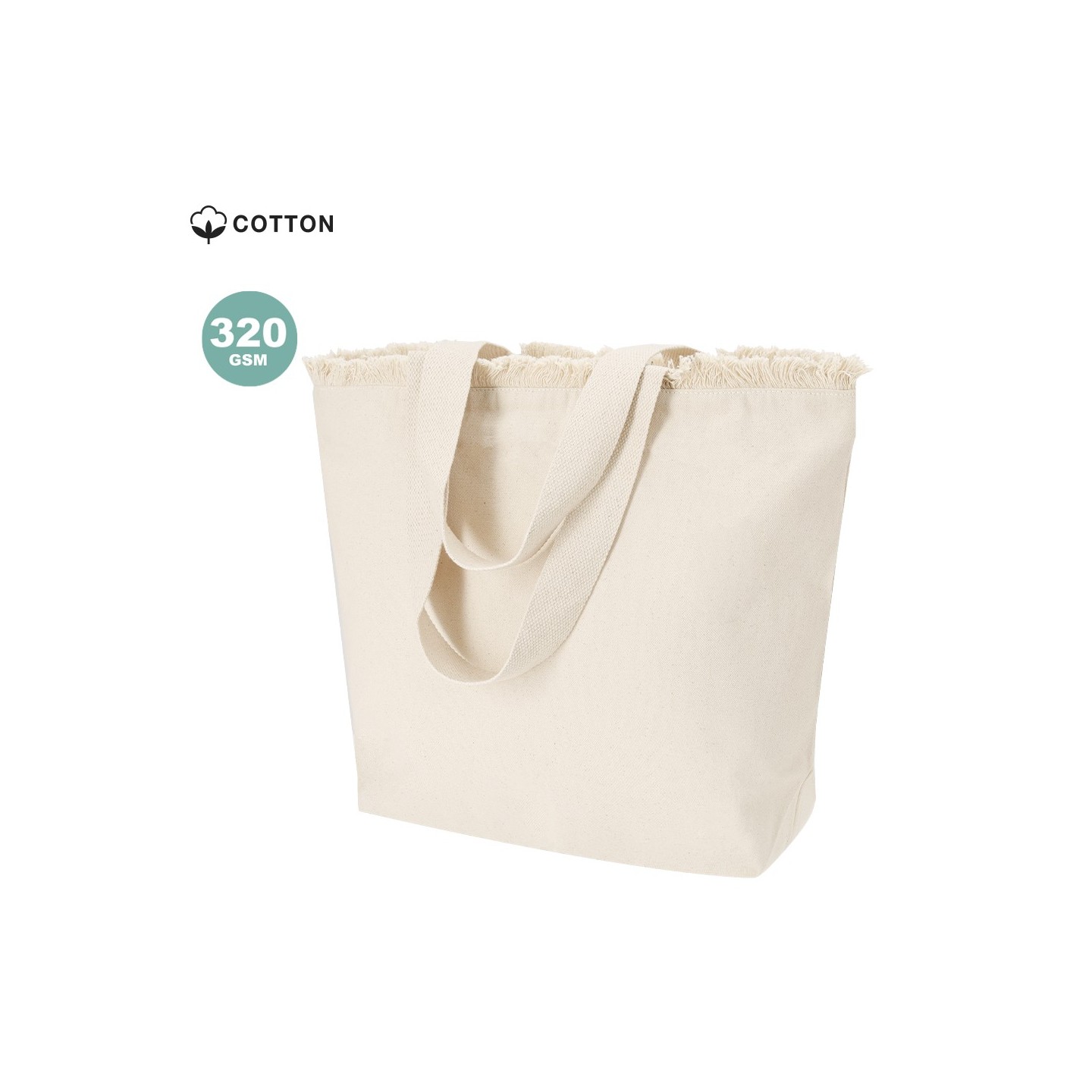 Bolsa con flecos de algodón reciclado de 320 g/m2, asas largas reforzadas y cierre de cremallera. Ideal para personalizar con tu logo. Práctica y moderna.