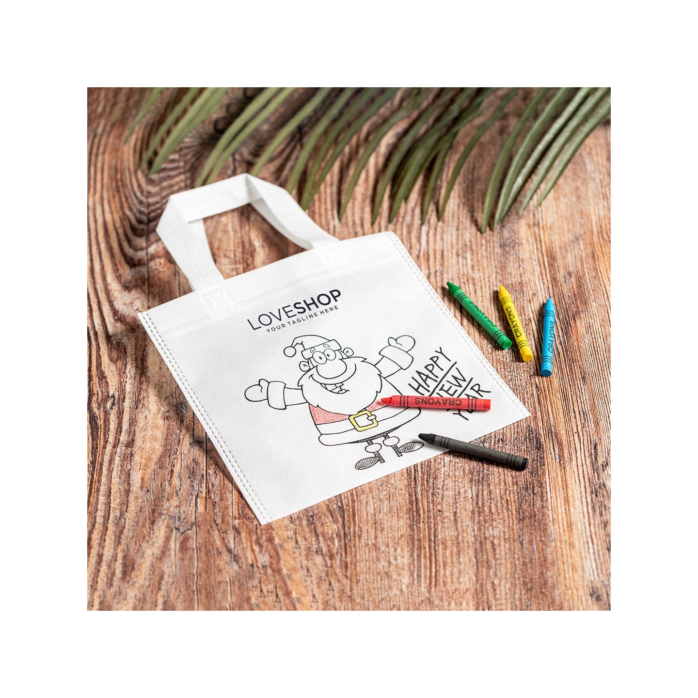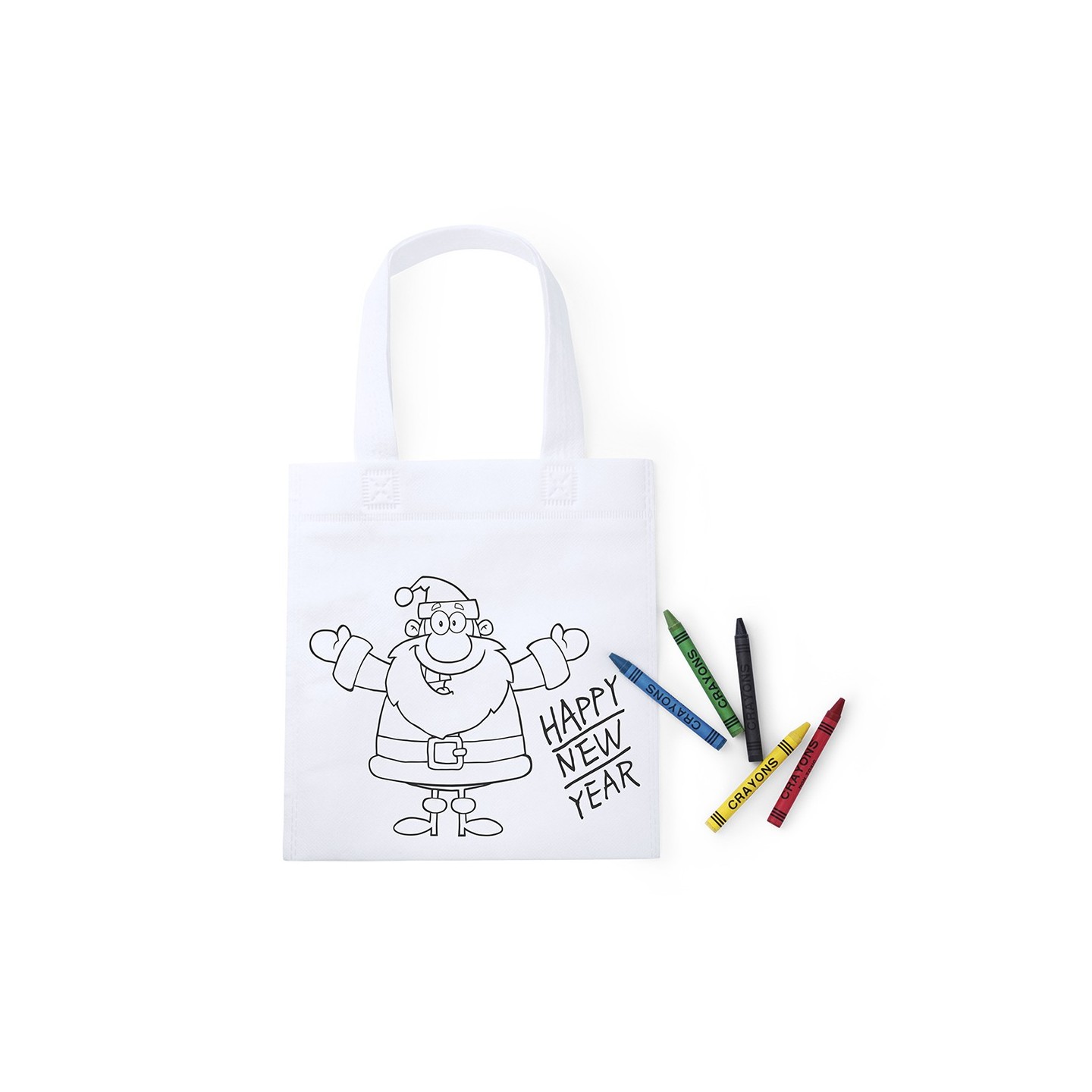 Bolsa de non-woven blanca para colorear con 5 ceras cilíndricas. Con asas medianas y acabado termosellado. Ideal para personalizar y llevar a cualquier parte.