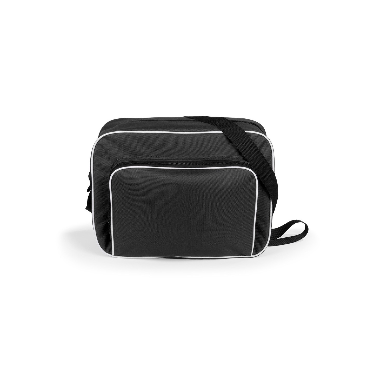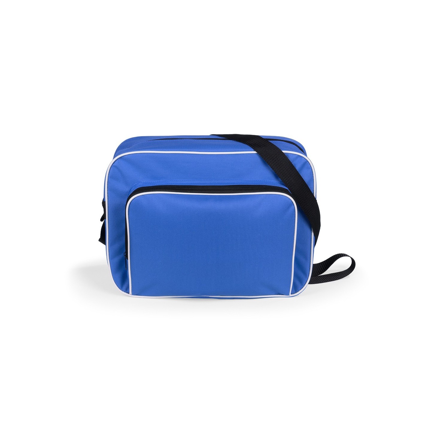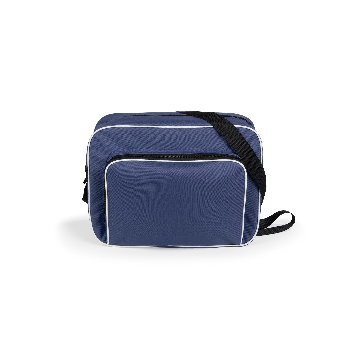 Bolso multiusos en poliéster 600D con diseño bicolor y ribetes de refuerzo en blanco. Compartimento y bolsillo con cierre, cinta bandolera ajustable y base antideslizante.