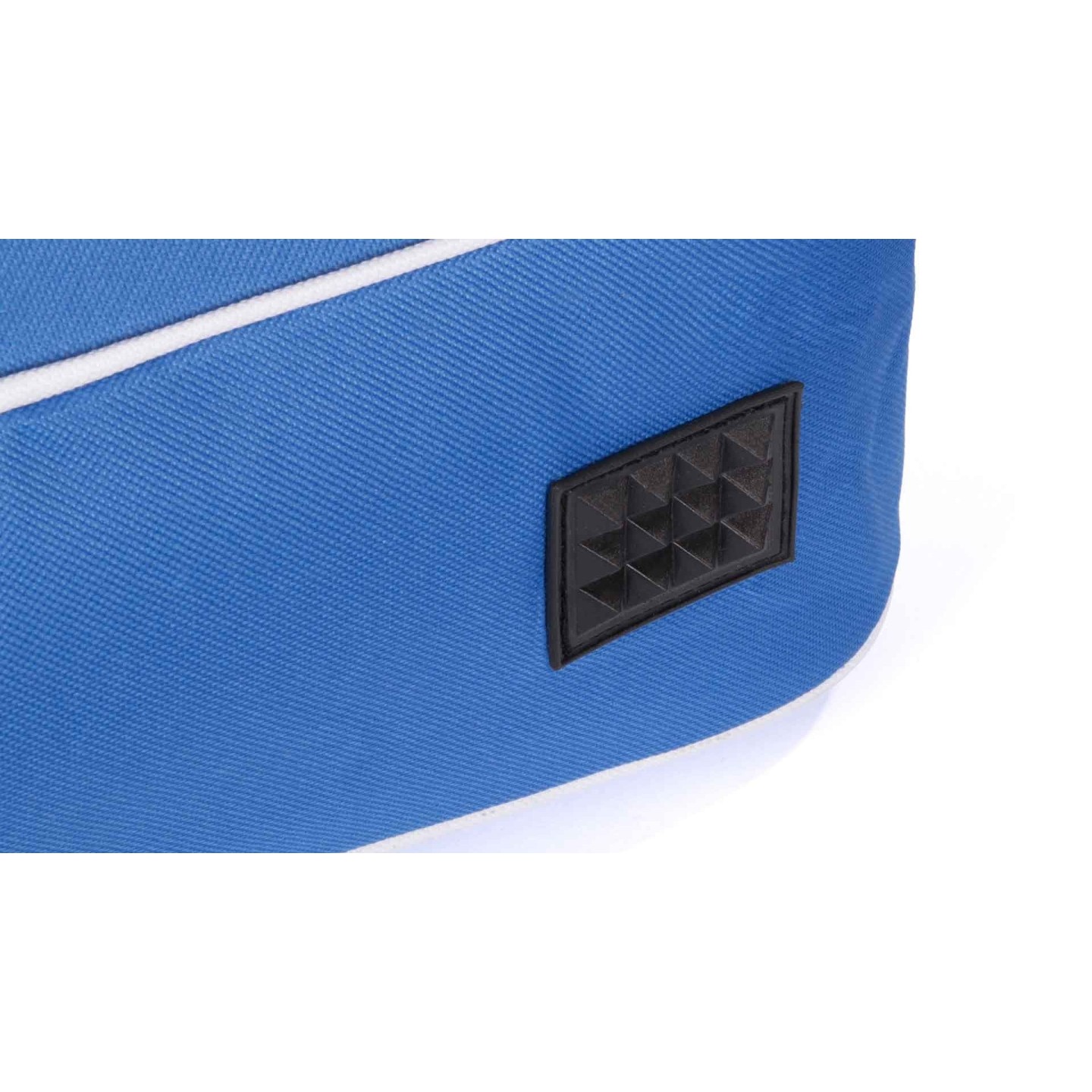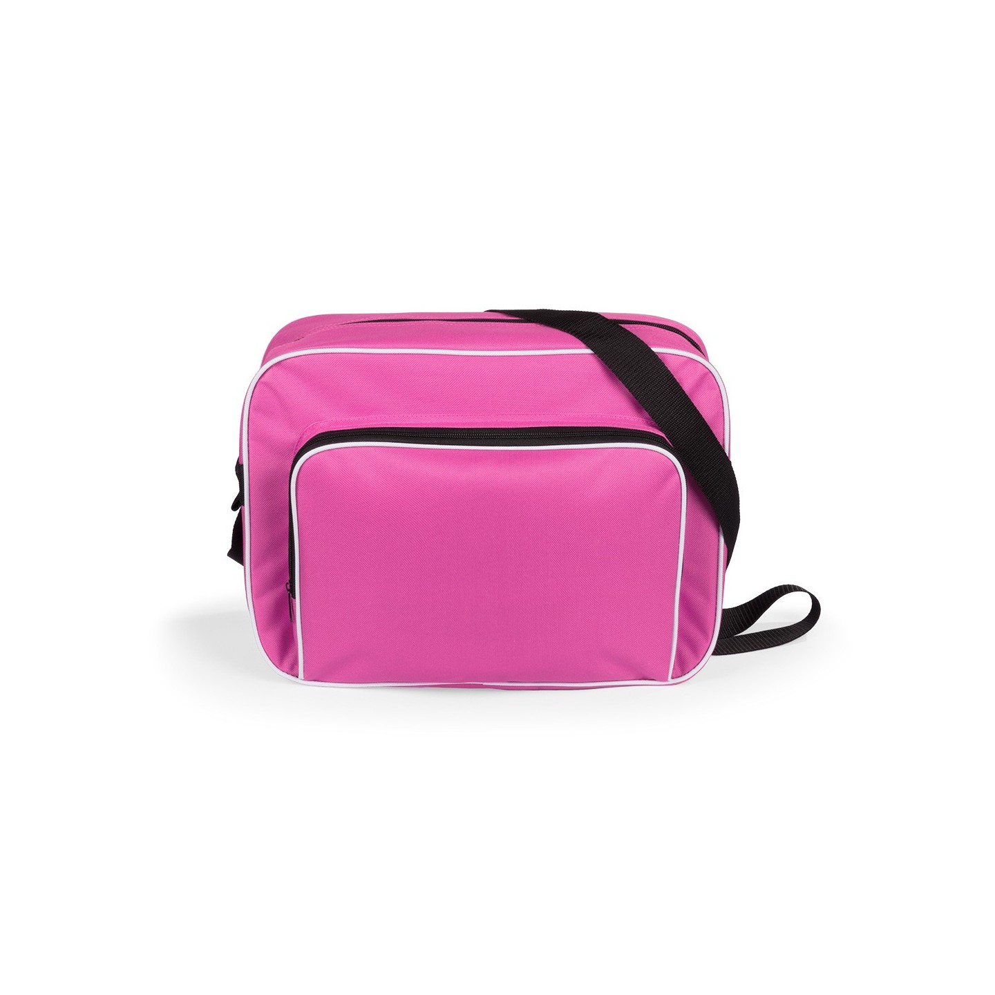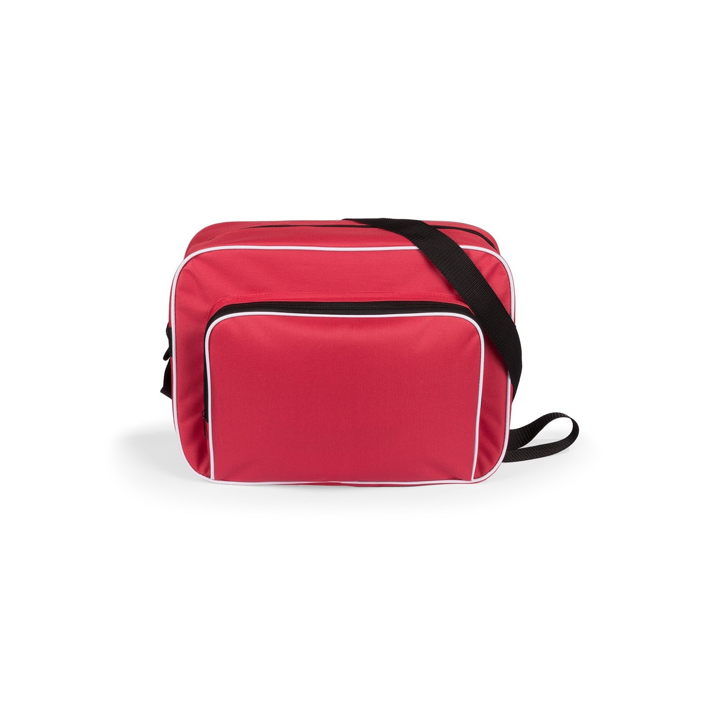 Bolso multiusos en poliéster 600D con diseño bicolor y ribetes de refuerzo en blanco. Compartimento y bolsillo con cierre, cinta bandolera ajustable y base antideslizante.