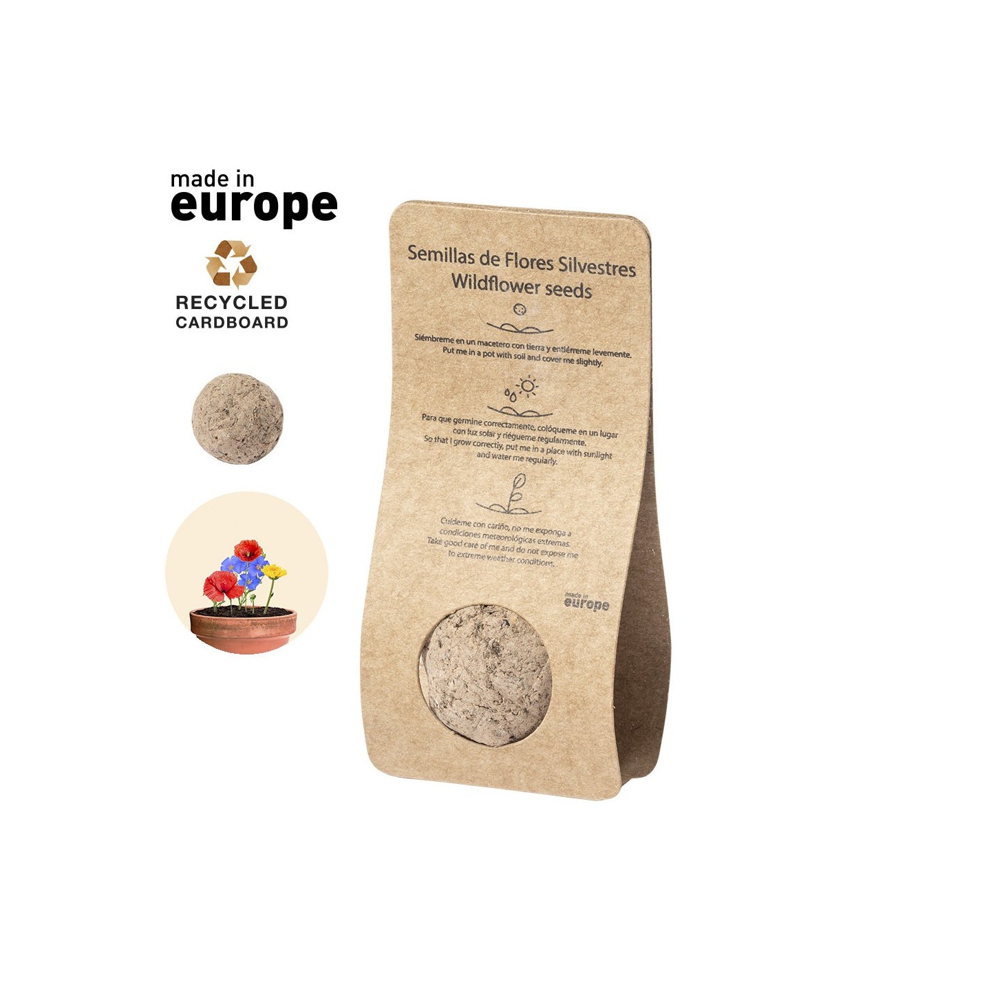 Cada bombón viene cuidadosamente presentado en un estuche de cartón reciclado, que no solo refleja nuestro compromiso con la sostenibilidad, sino que también contiene instrucciones detalladas de plantado. Este estuche es tu puerta hacia la creación de un espacio natural que florecerá con el tiempo.