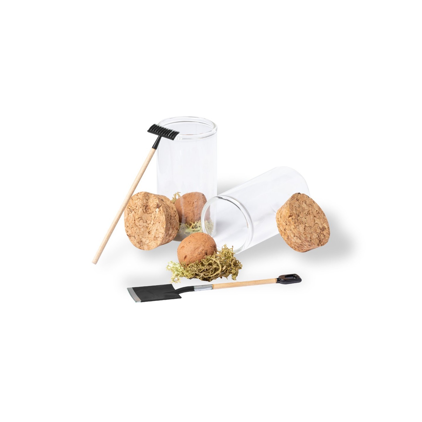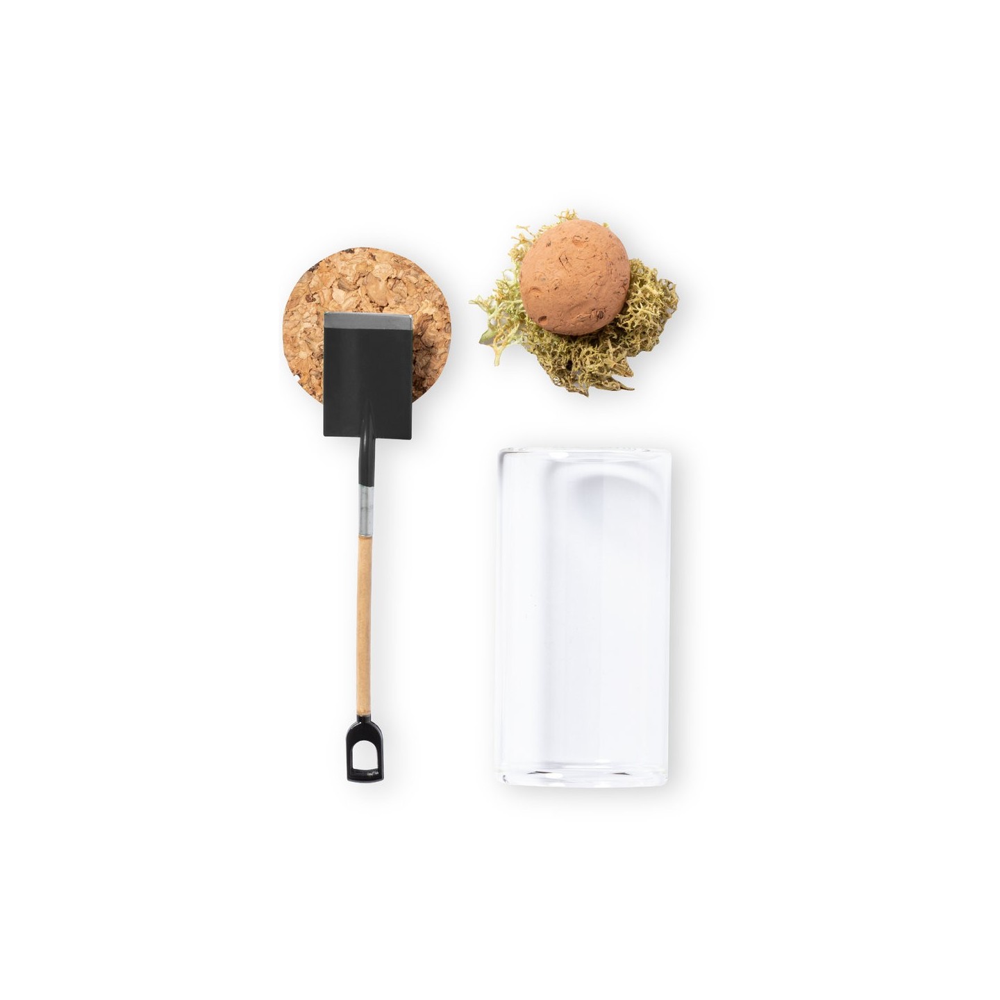 Cada bombón viene presentado en un elegante bote de cristal, sellado con un tapón de corcho natural. Este envase no solo protege el bombón, sino que también representa un pequeño ecosistema en sí mismo.