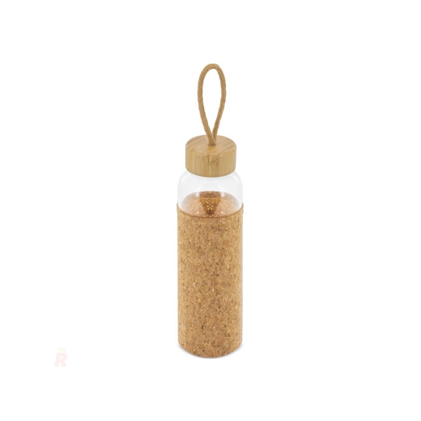 Botella de cristal con tapón de bambú, asa de cuerda trenzada y funda de corcho. Diseño elegante y eco-friendly, ideal para el día a día. Presentación en caja.