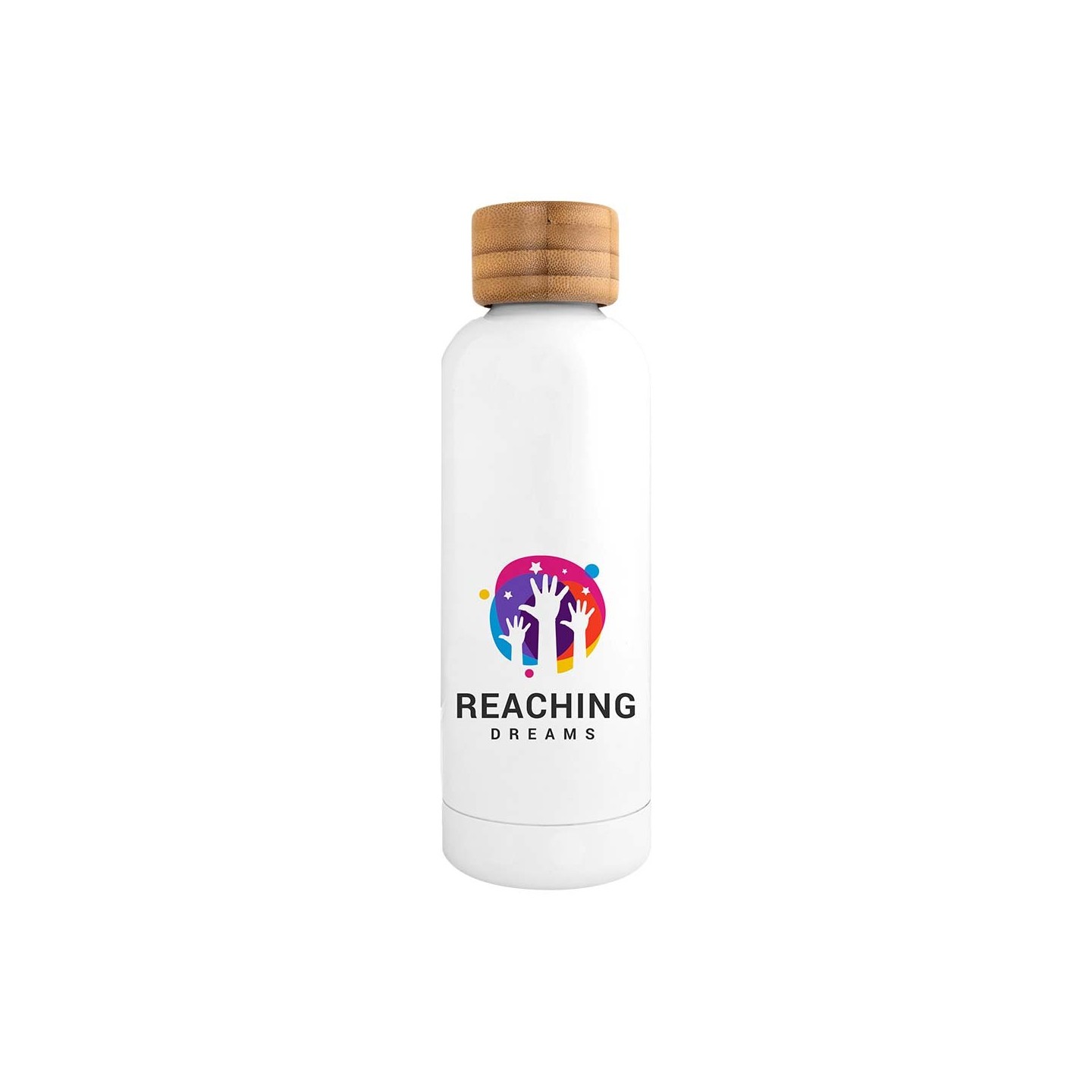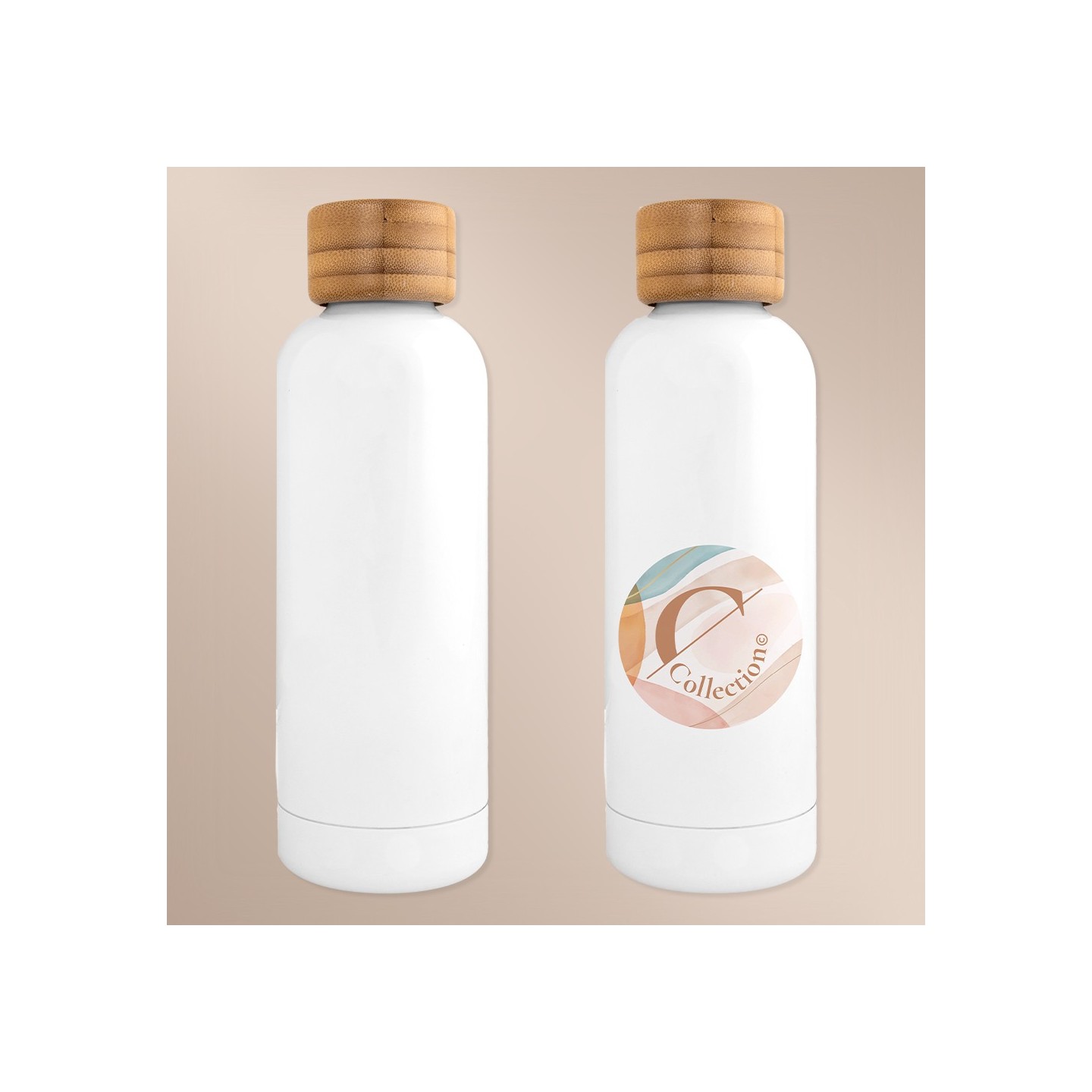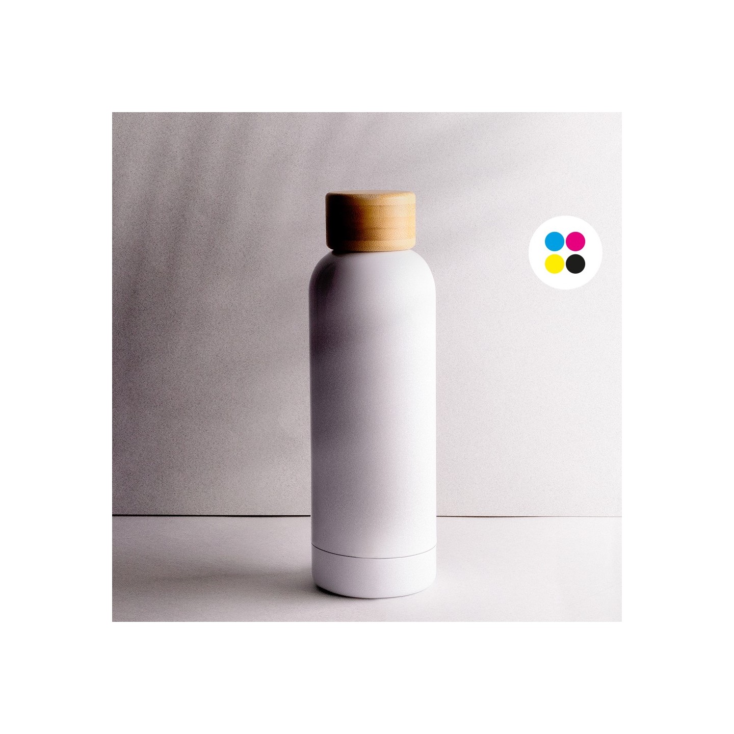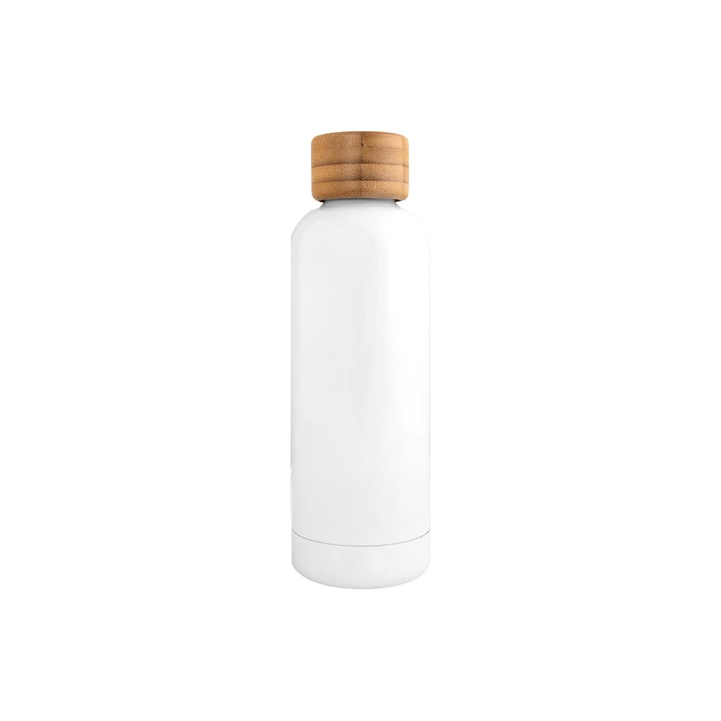 La Botella Curve Sublimación dispone de doble pared y 500 ml. Tapón de bambú, ideal para personalización. Frías 24h, calientes 12h. Certificación LFGB