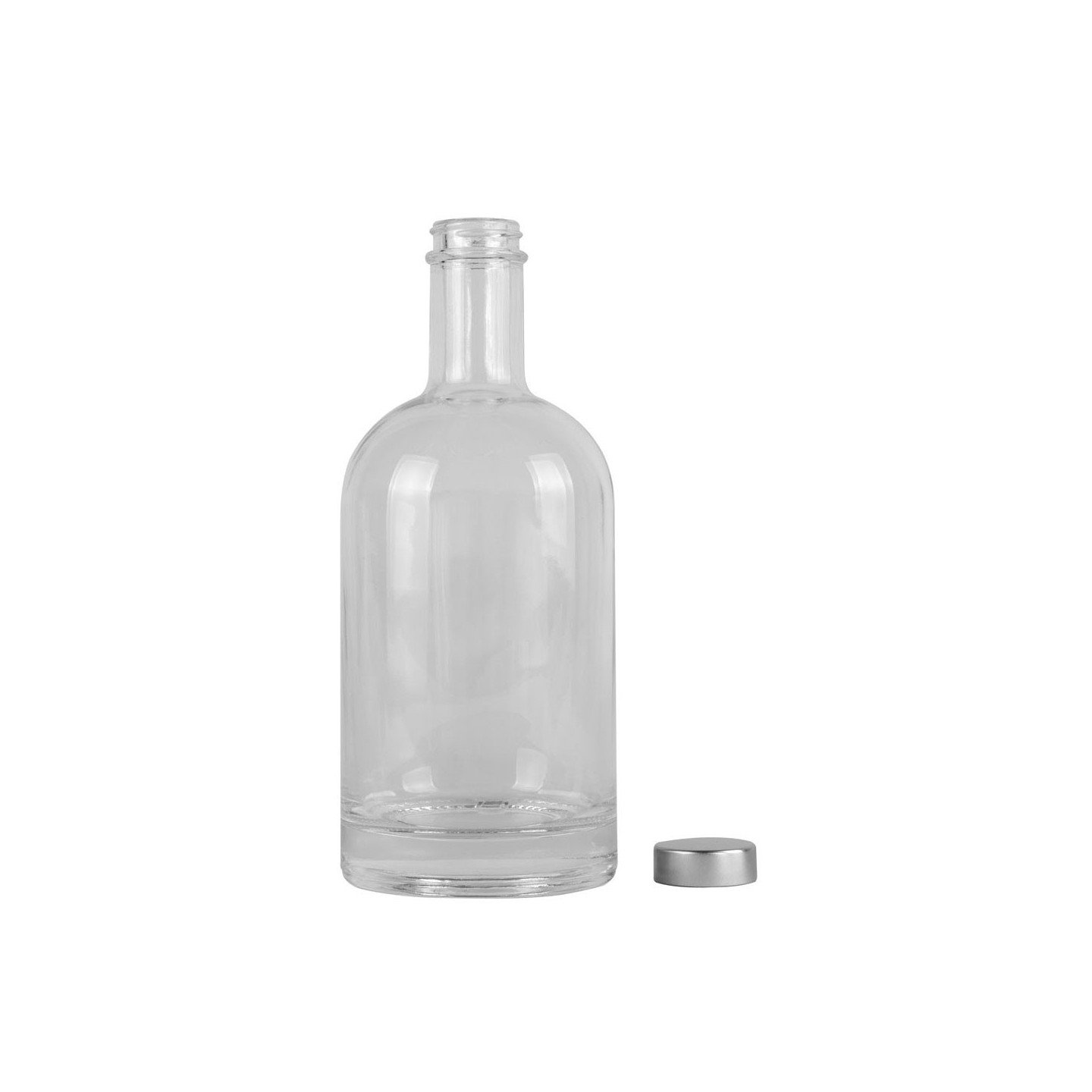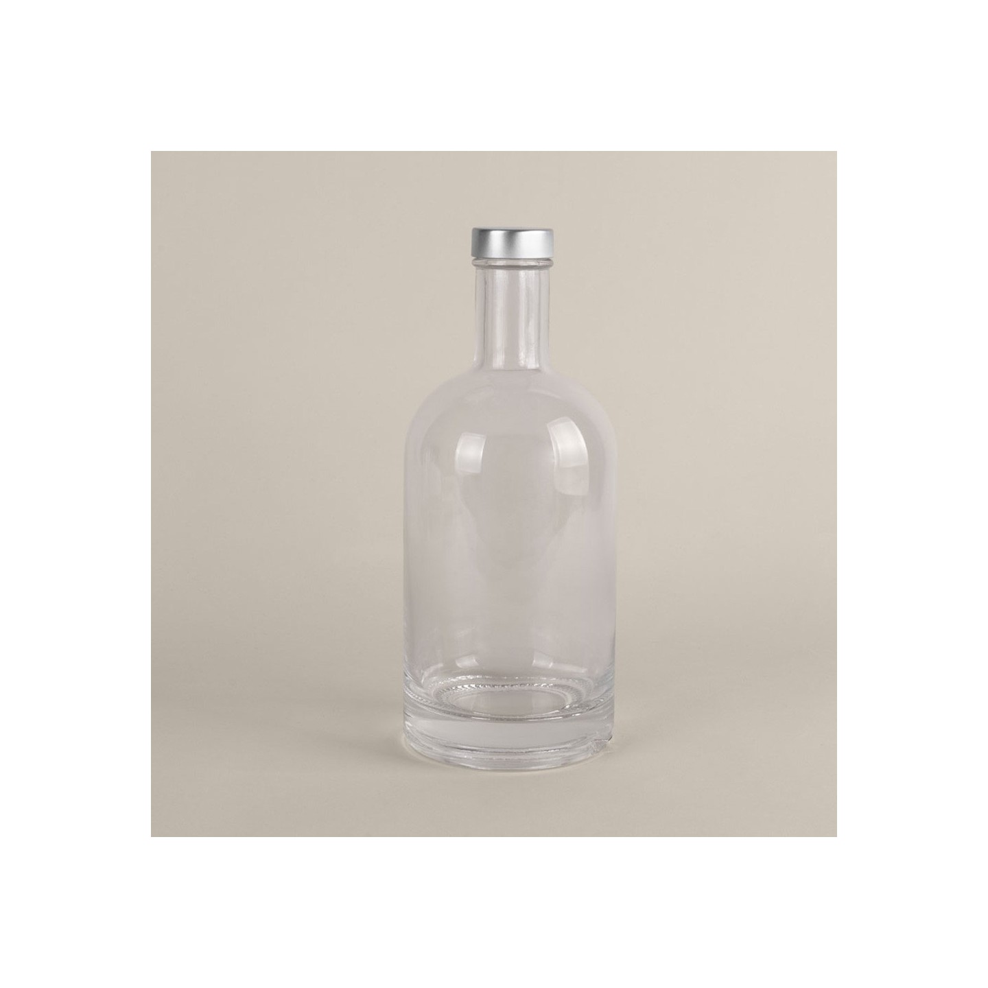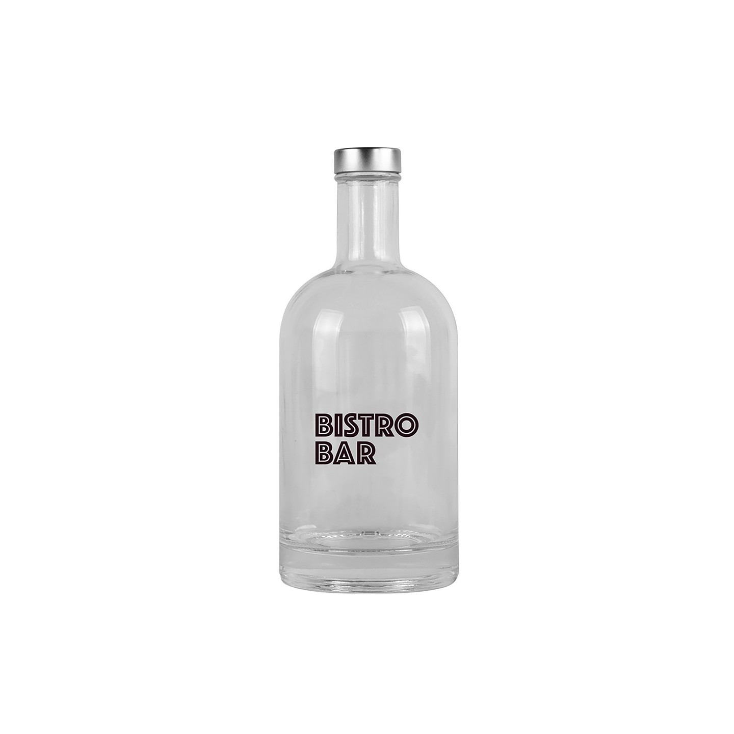 La botella para licores LIQUEUR de cristal de 750 ml, con tapón de aluminio, es ideal para personalizar con tu logotipo. Elegante y segura para bebidas, perfecta para promociones.