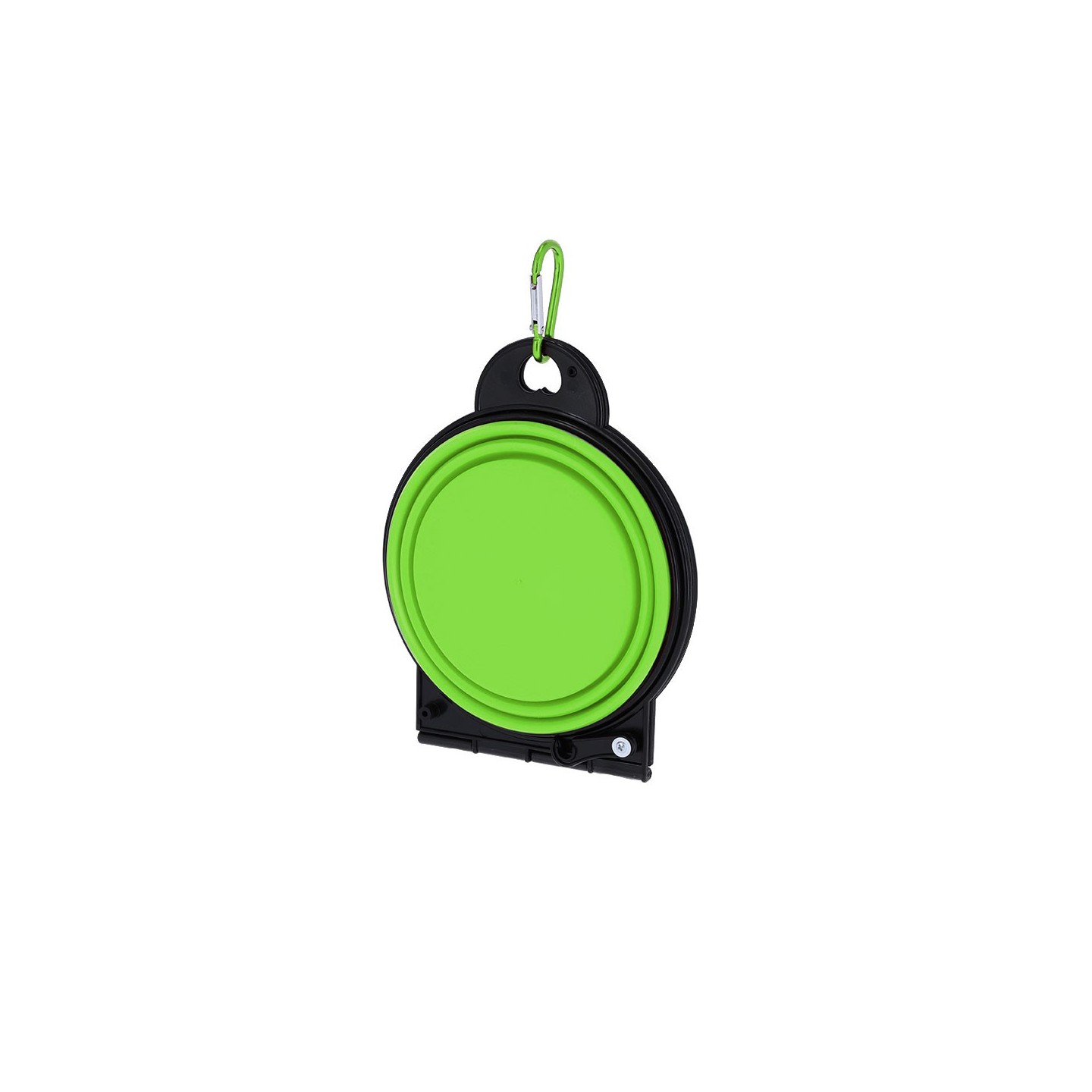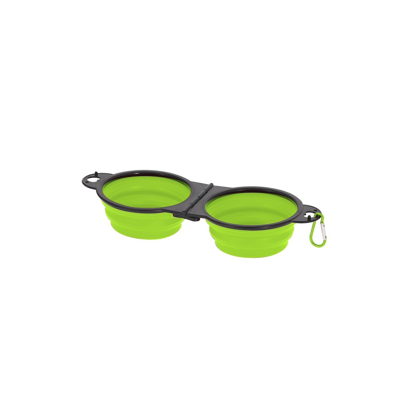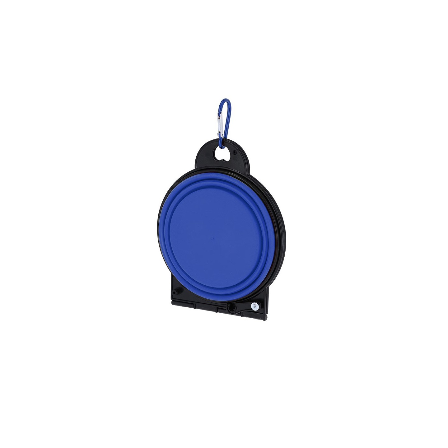Bowl plegable MALKING para mascotas, fabricado en resistente TPE con dos compartimentos de 450 ml. Incluye mosquetón. Compacto, funcional y personalizable.