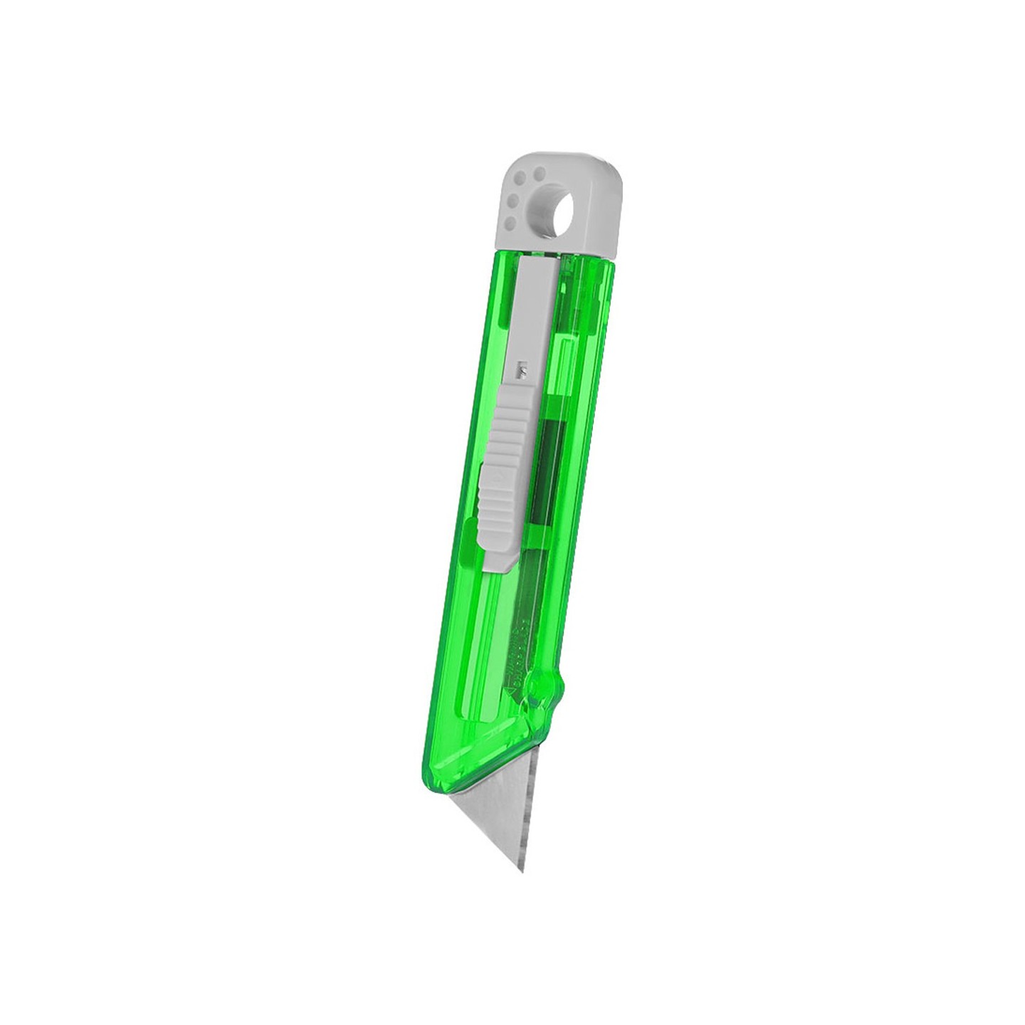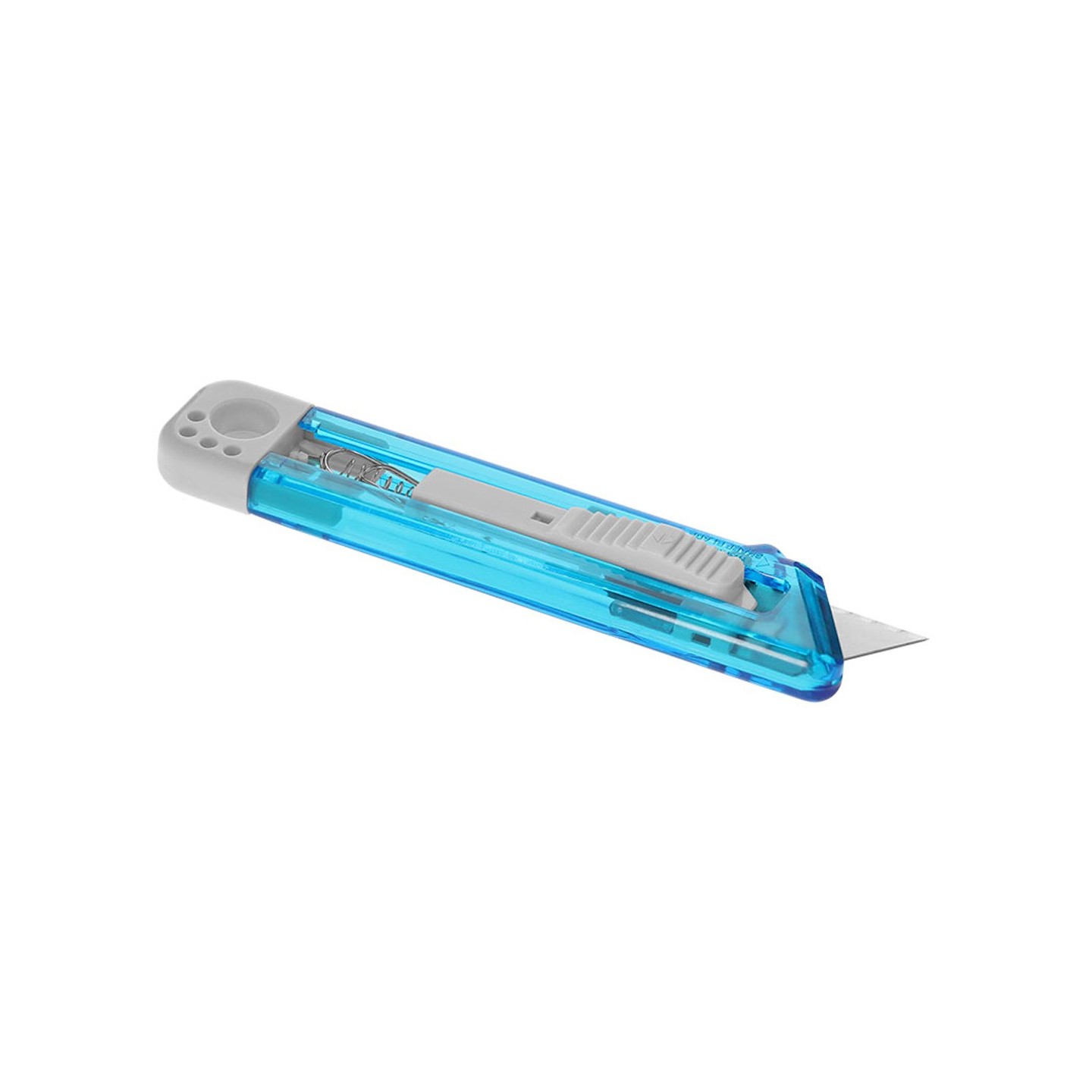 Cúter personalizable de PS translúcido con mecanismo de retracción automática. Hoja de acero de 6 x 1,9 cm, práctico y ligero, ideal para promocionar tu marca.