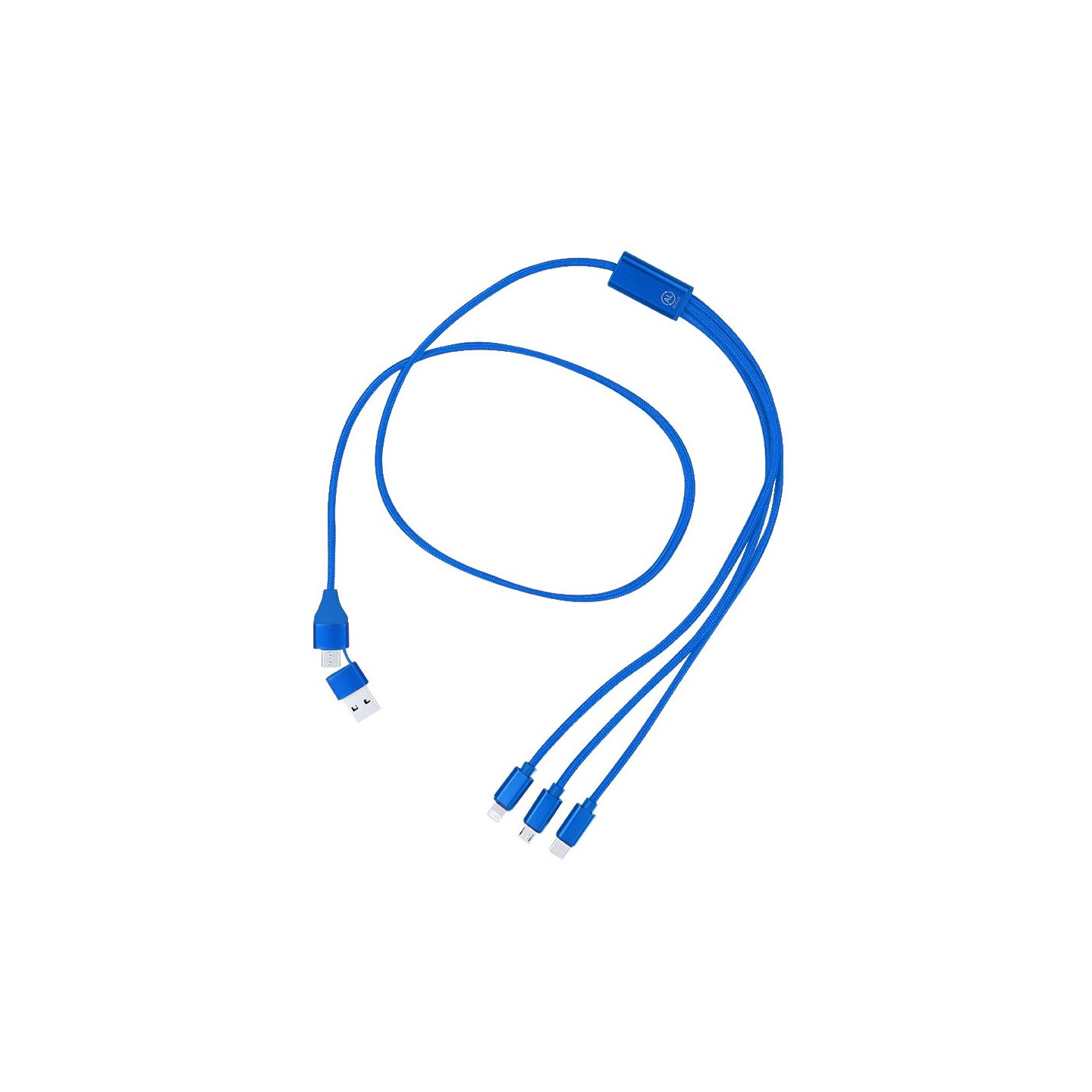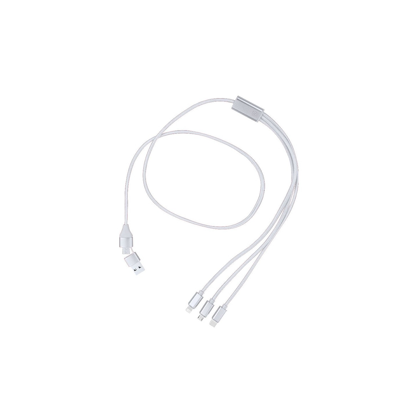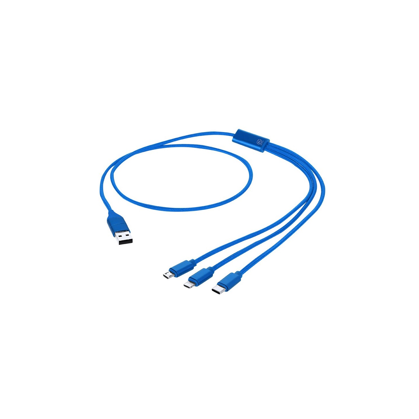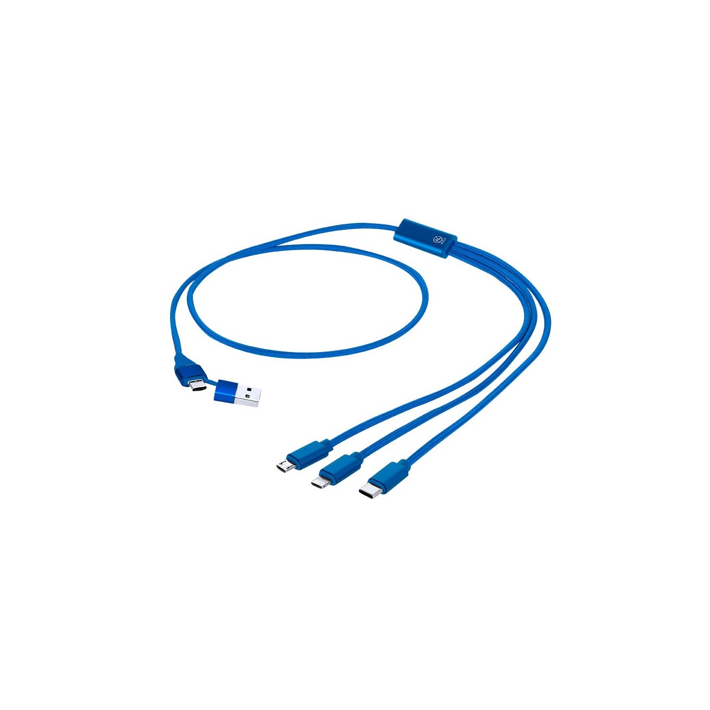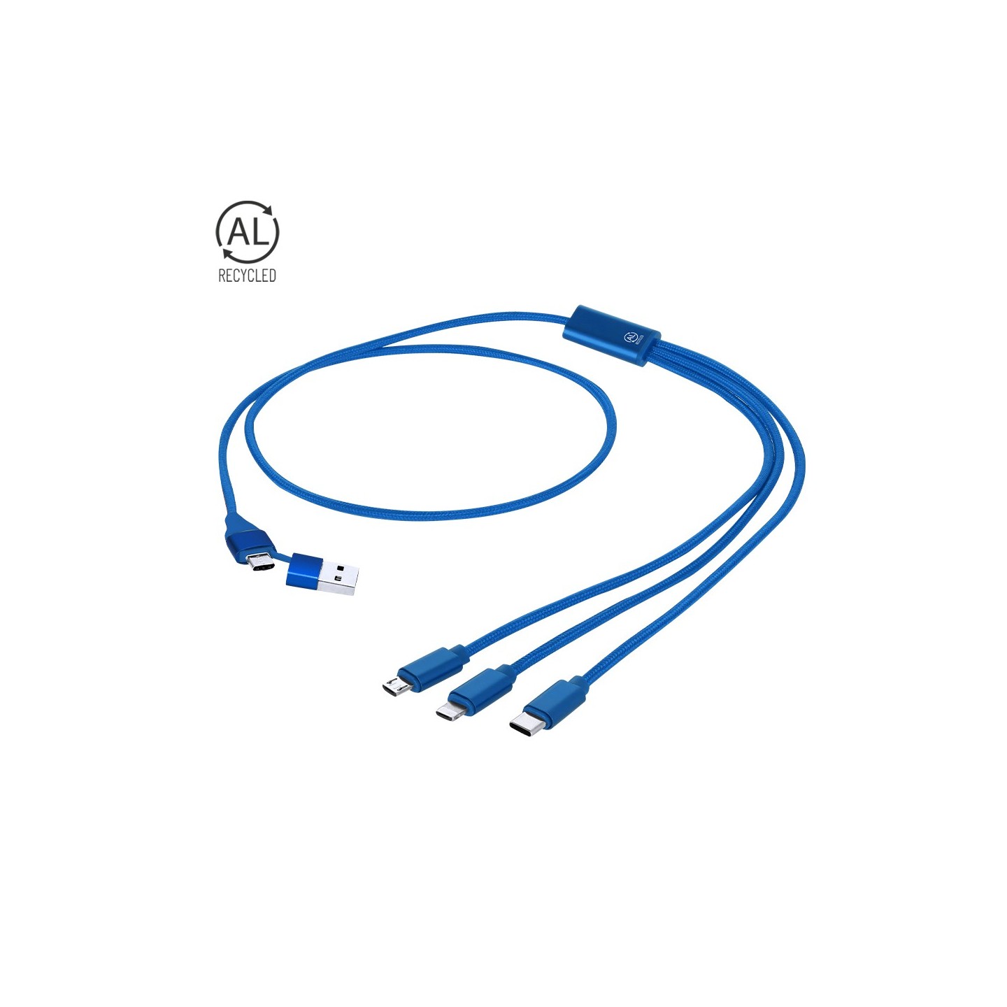 Cable Cargador CLODAN en aluminio reciclado con entrada dual y salidas Tipo C, Lightning y Micro USB. Personalizable con tu logotipo. Ecológico y funcional.