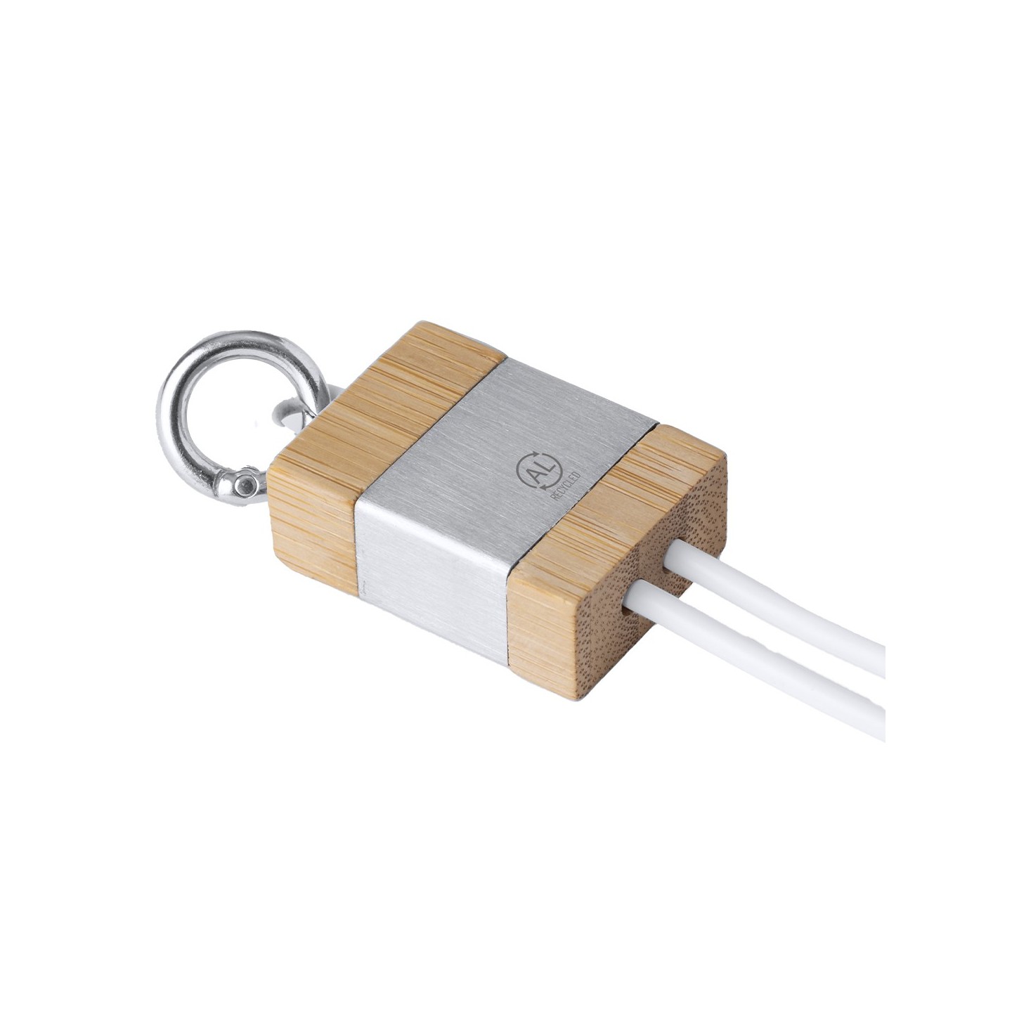 Cable cargador fabricado en bambú y Aluminio Reciclado. De tamaño compacto y con original anilla mosquetón de transporte. Conexiones de entrada Tipo C y USB + salidas Tipo C, Lightning y Micro USB. 5V DC 2.4A. Con logotipo Aluminio Reciclado y presentado en caja individual de diseño kraft.