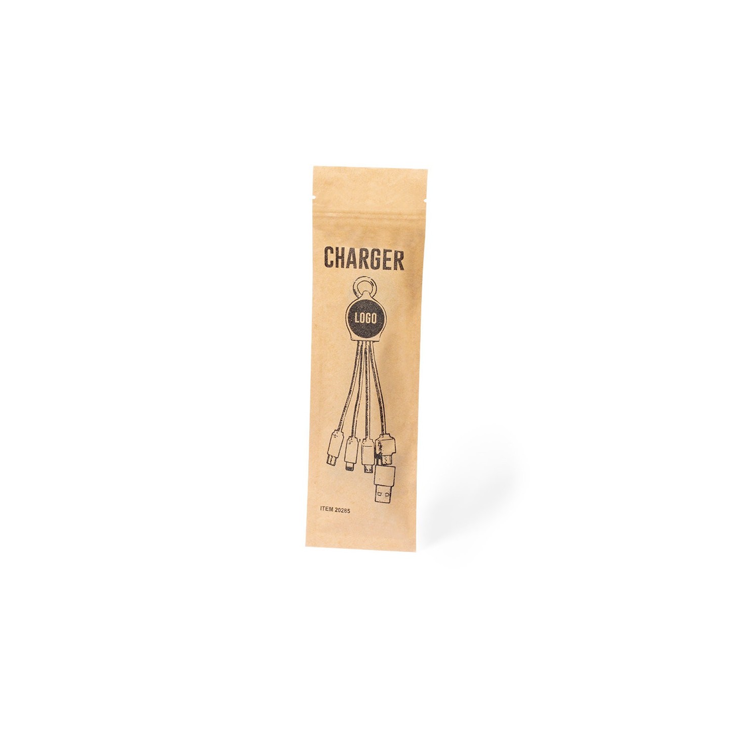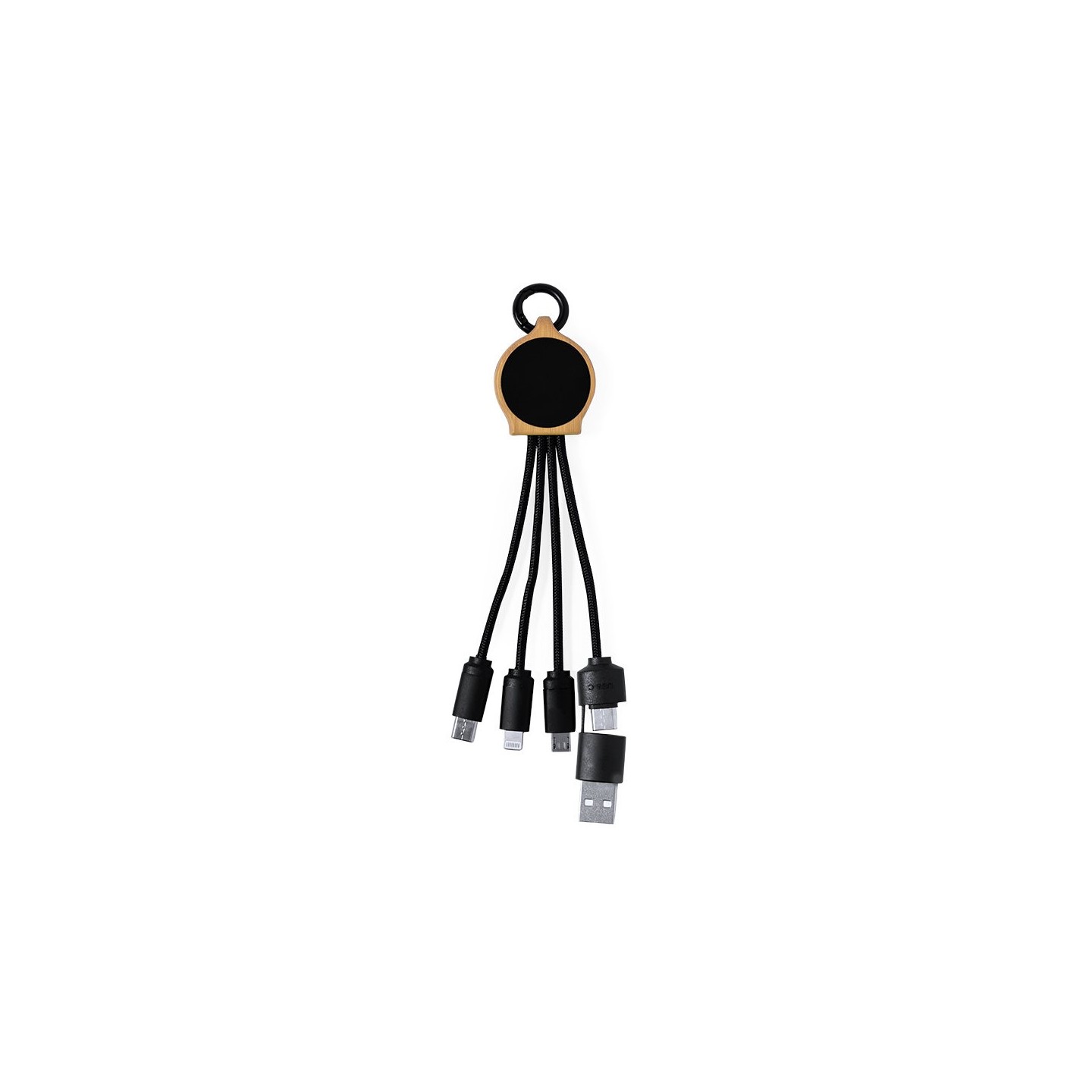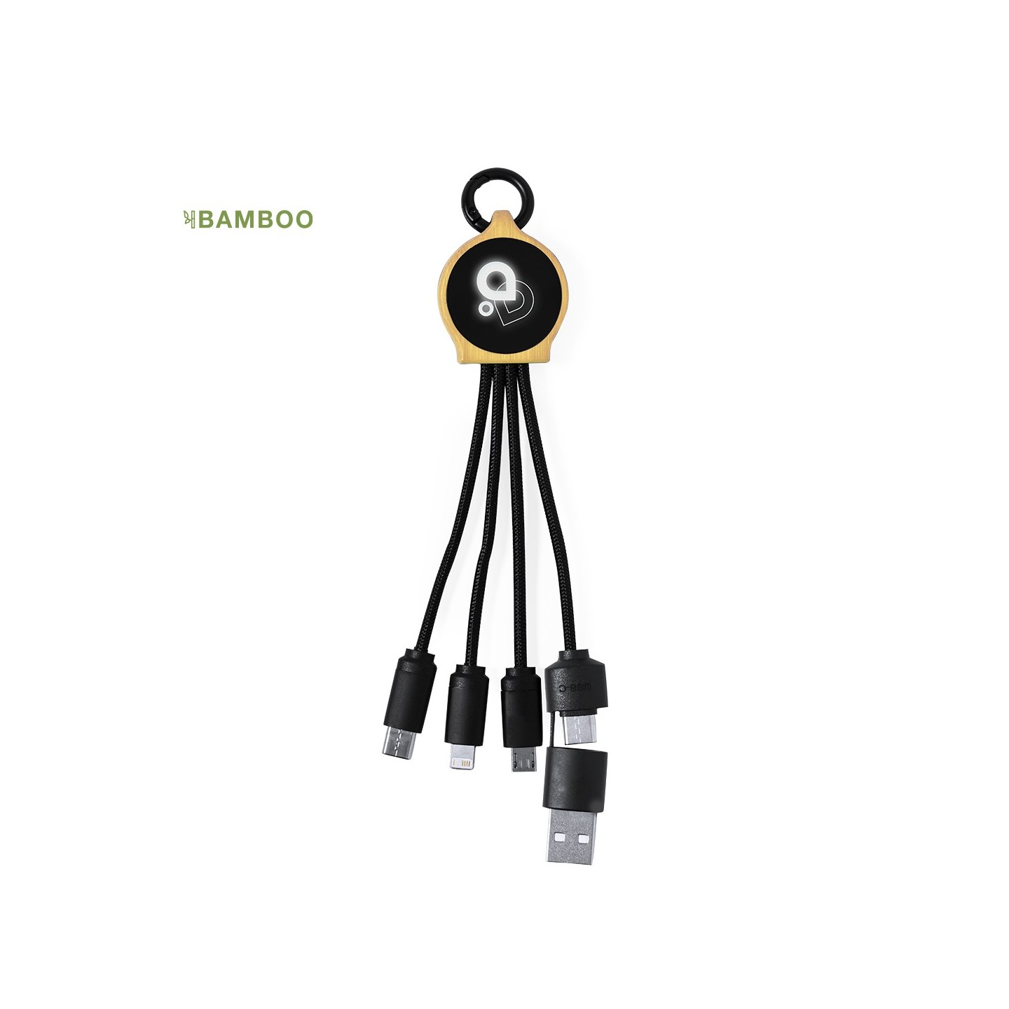 Cable cargador fabricado en bambú con superficie en elegante color negro. Ofrece luz LED interior y un recubrimiento exterior diseñado para marcaje en láser, iluminando el logotipo. Tiene conexiones de entrada Tipo C y USB, y salidas Tipo C, Lightning y Micro USB con 5V DC 2.4A. Se presenta en una bolsa individual de diseño kraft.