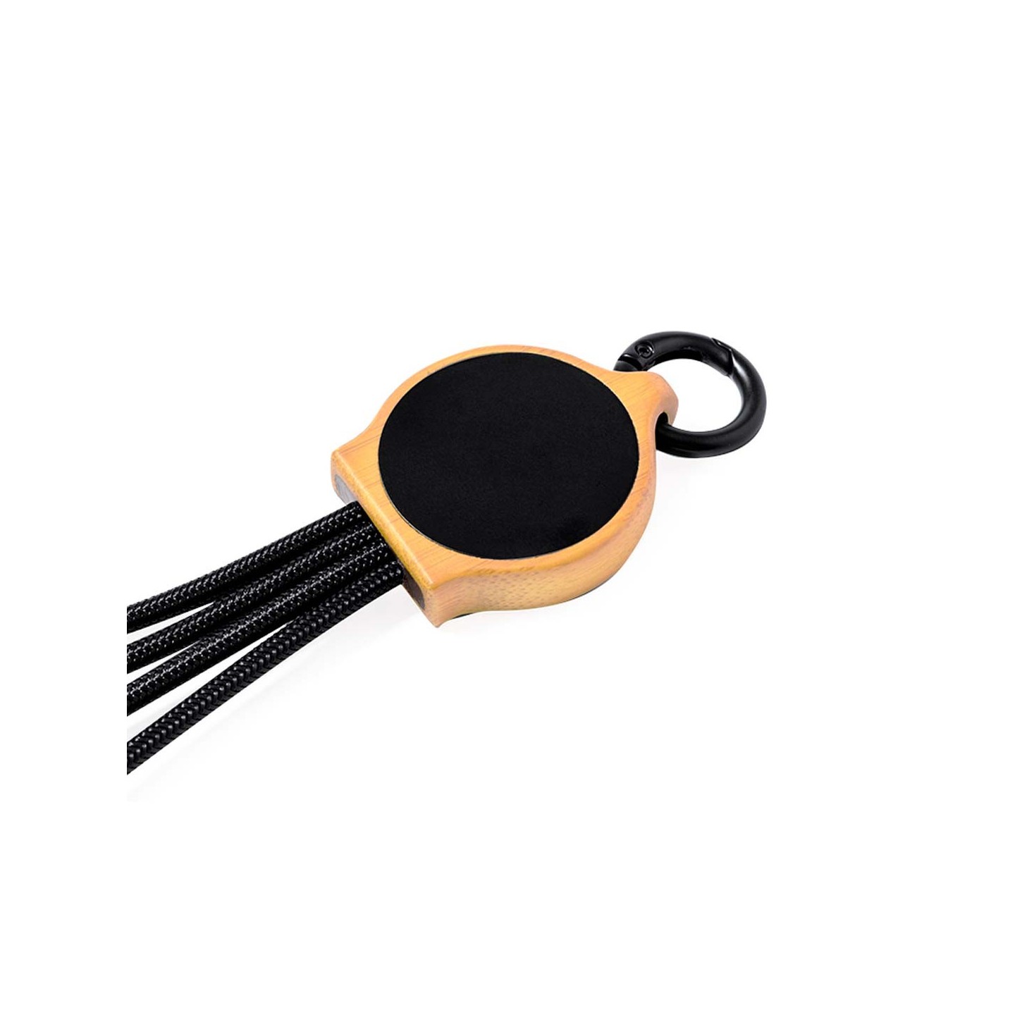 El Cable Cargador Lawrence es de bambú negro, luz LED, múltiples conexiones (Tipo C, Lightning, Micro USB). Perfecto para marcaje láser.