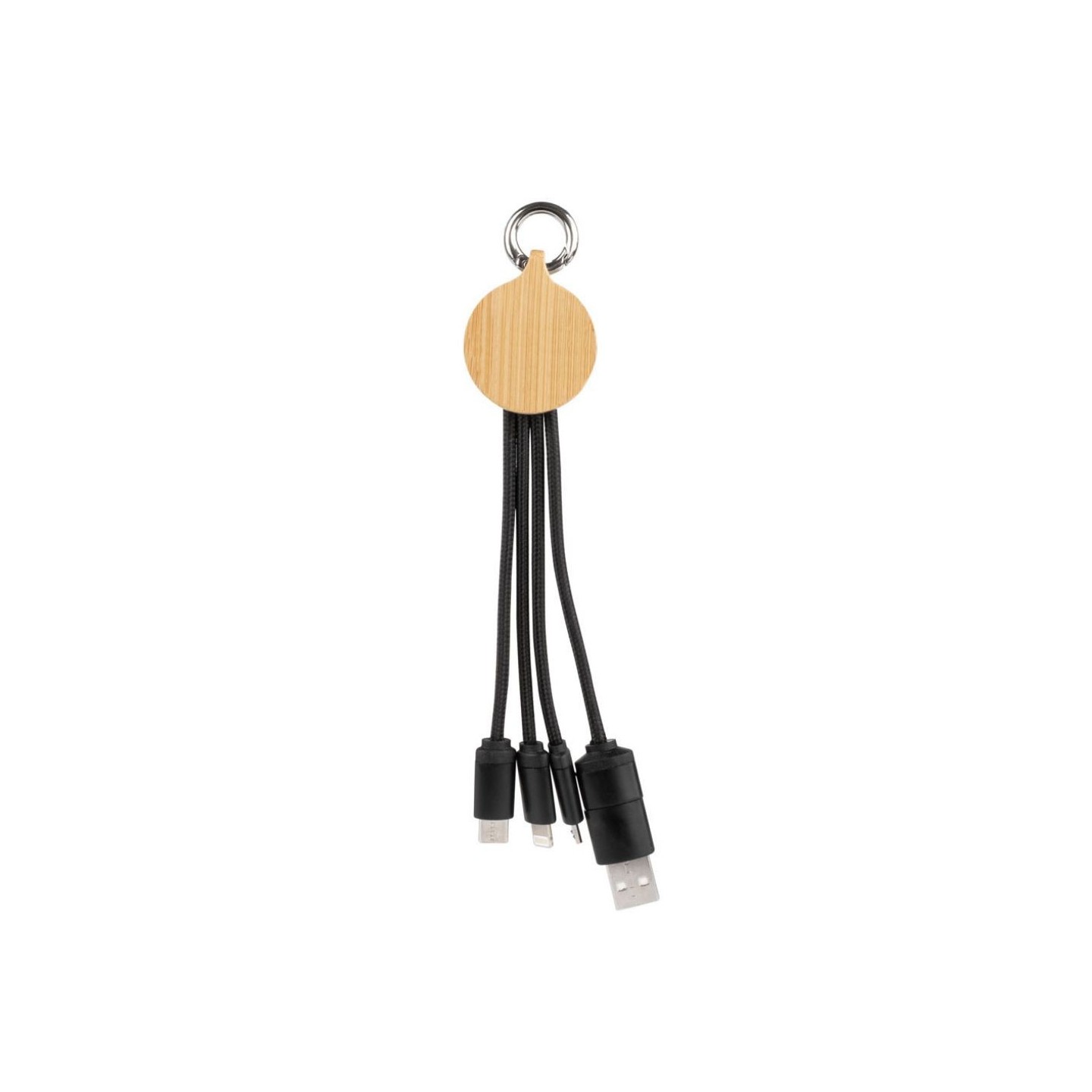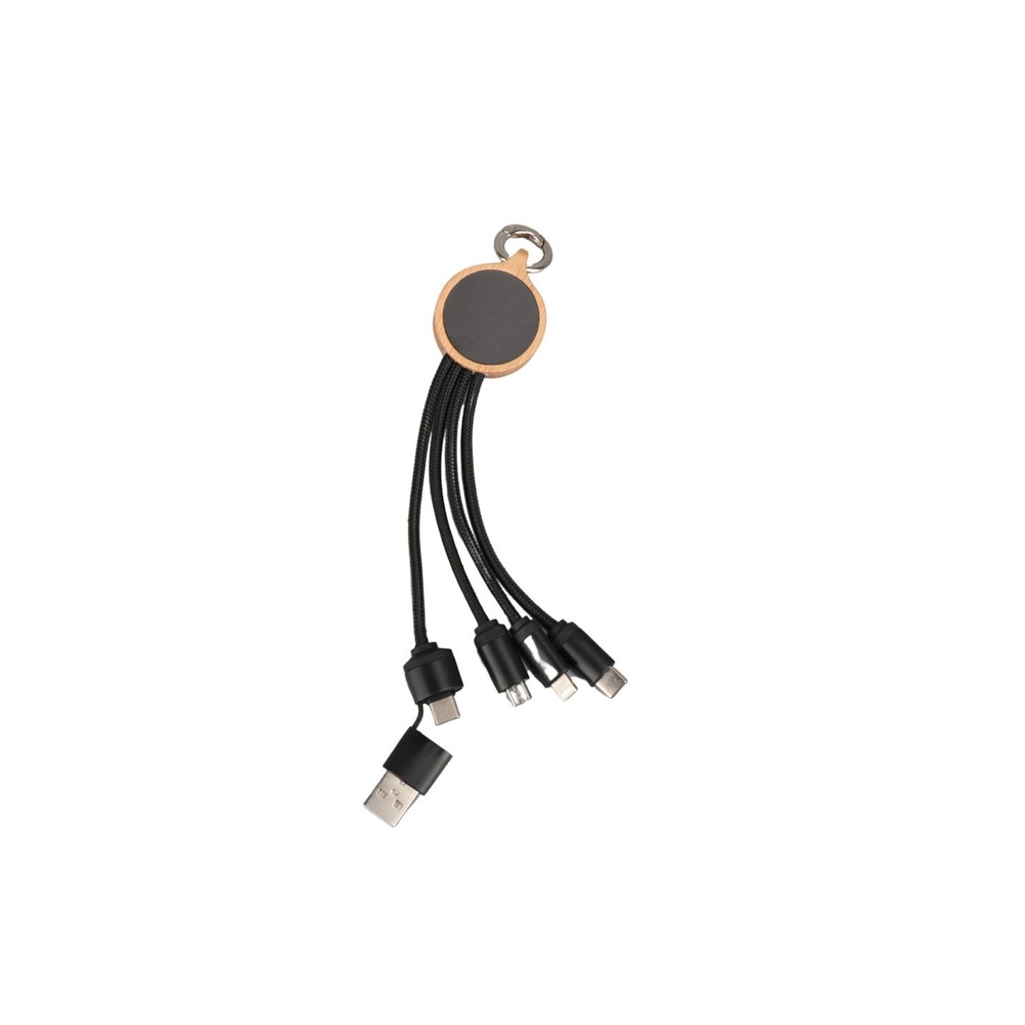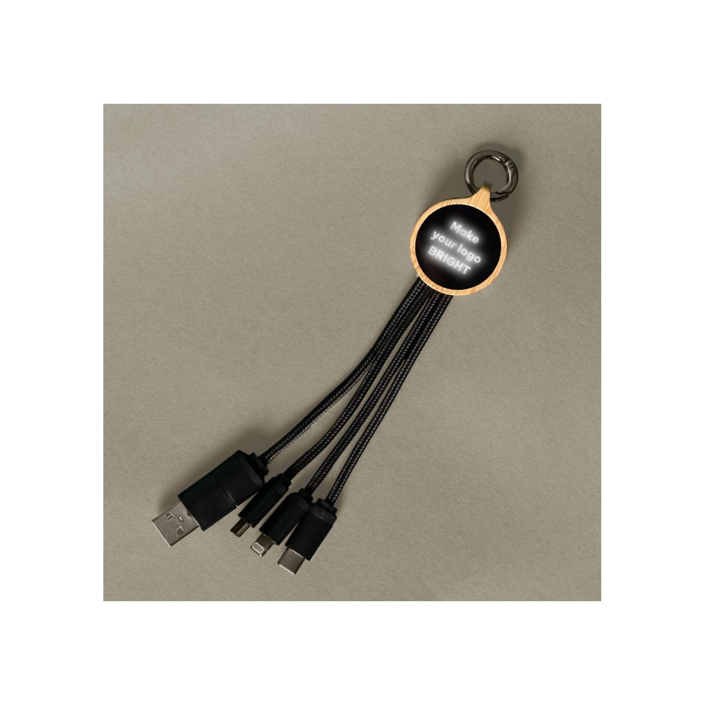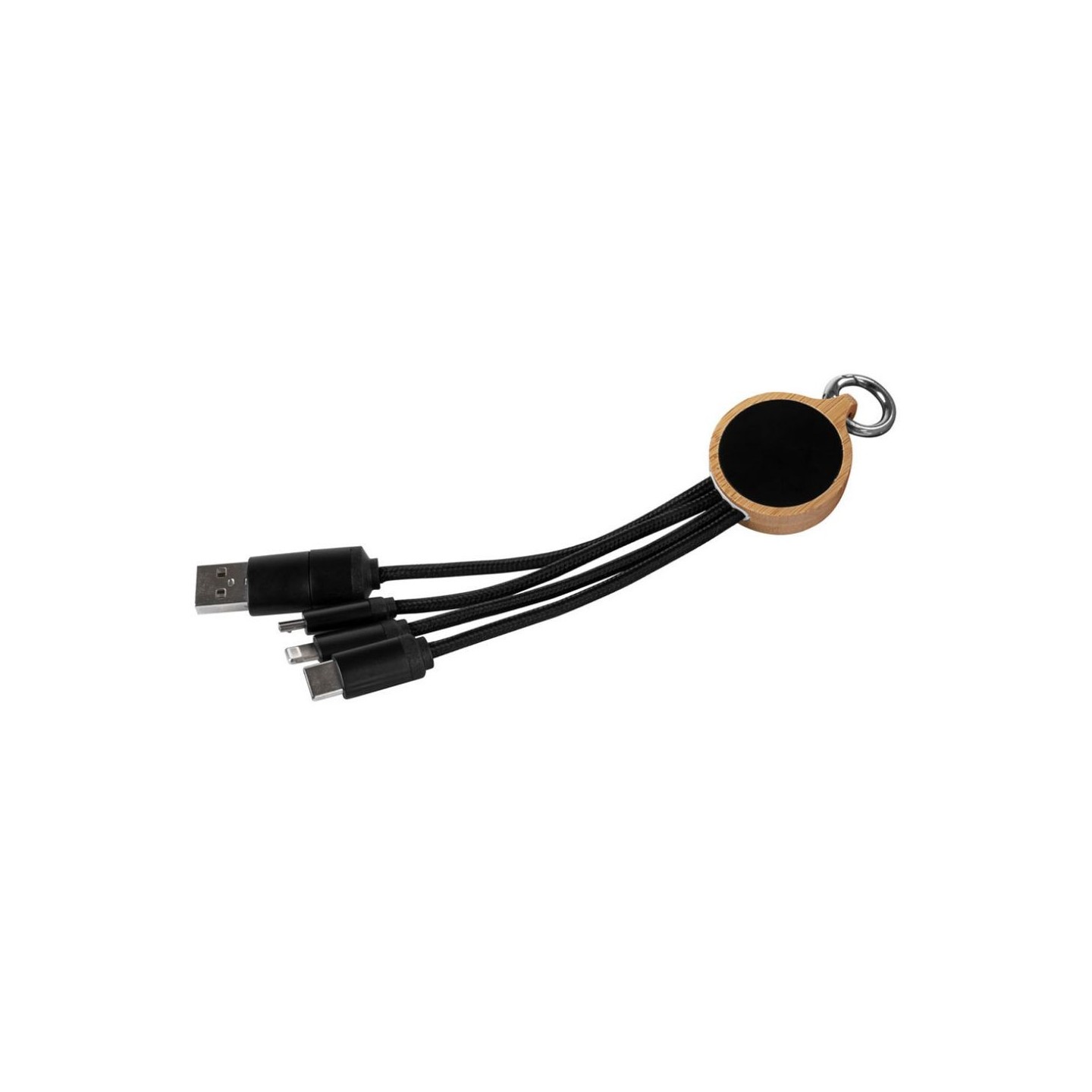 Cable cargador personalizable fabricado en bambú, poliéster y acrílico, con marcaje láser retroiluminado. Con entradas Tipo C y USB, y salidas Tipo C, Lightning y Micro USB. Certificado CE y RoHS.