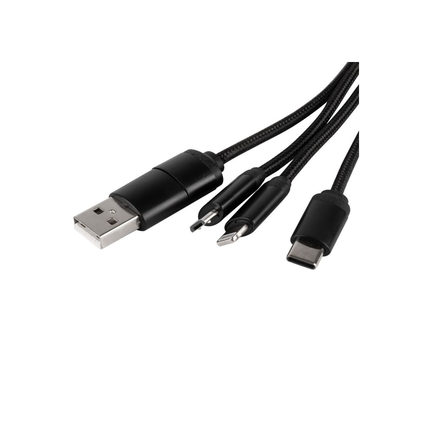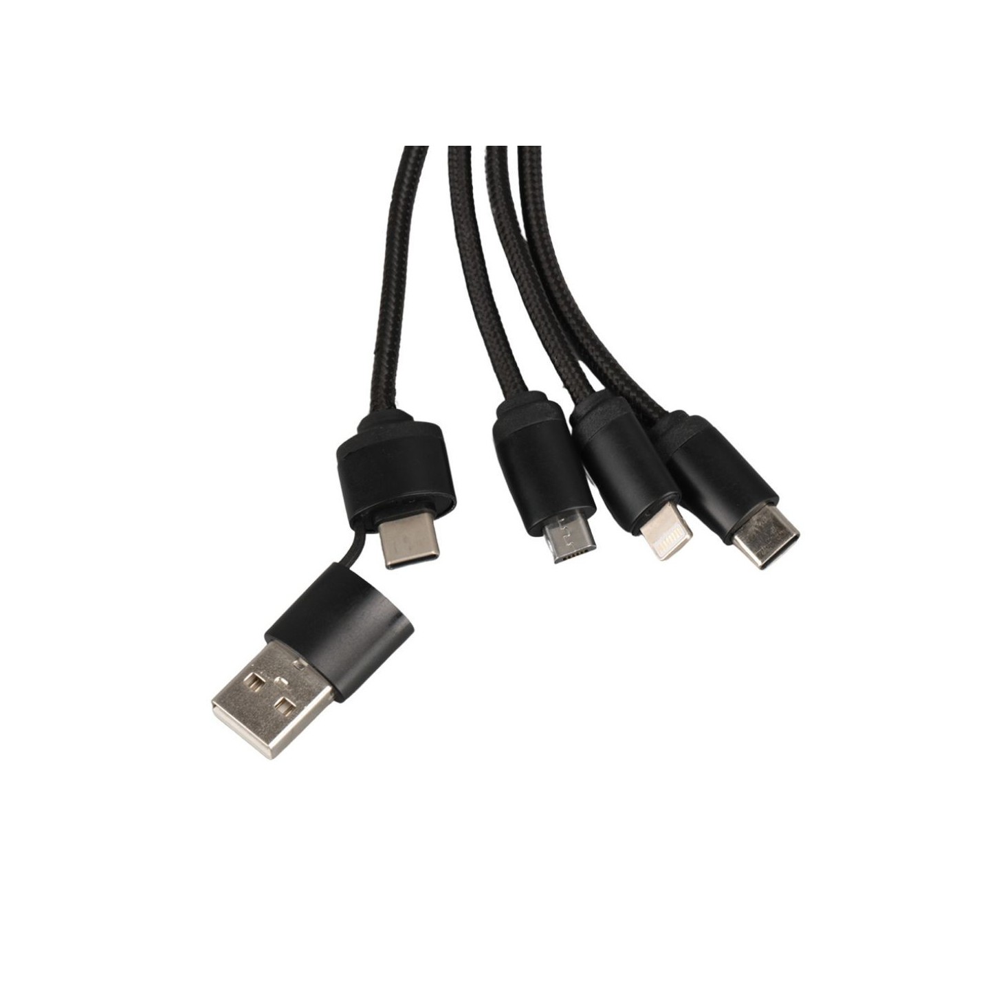 Con un diseño compacto y práctico, el cable ofrece una gran versatilidad al contar con conexiones de entrada Tipo C y USB, así como salidas Tipo C, Lightning y Micro USB. Con una longitud de 17 cm y un diámetro de 3 cm, es lo suficientemente portátil como para llevarlo en cualquier momento, siendo una excelente opción para regalar a clientes o empleados.