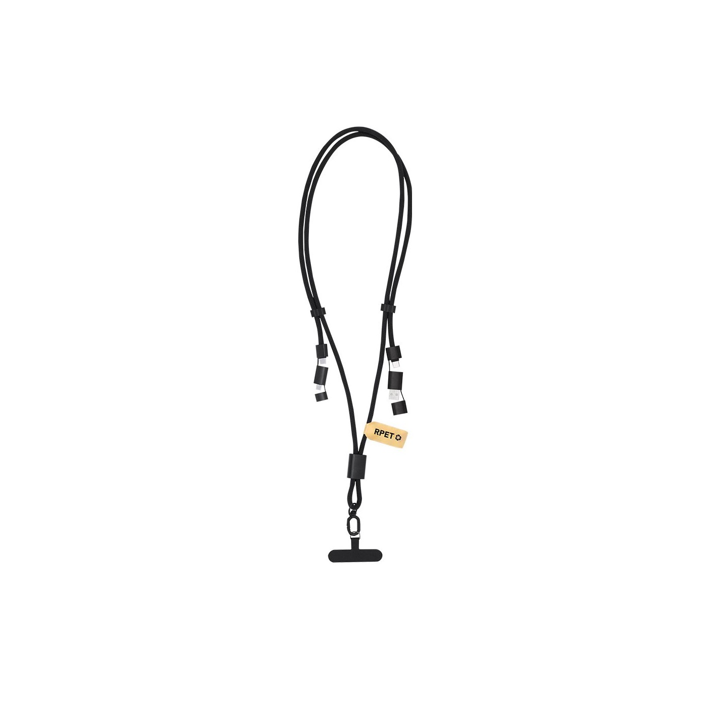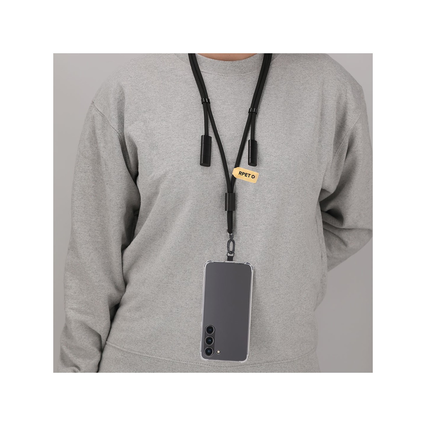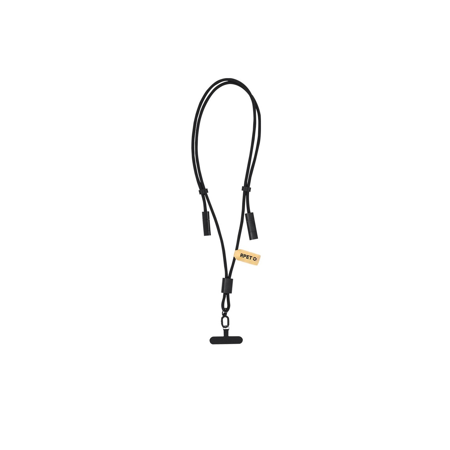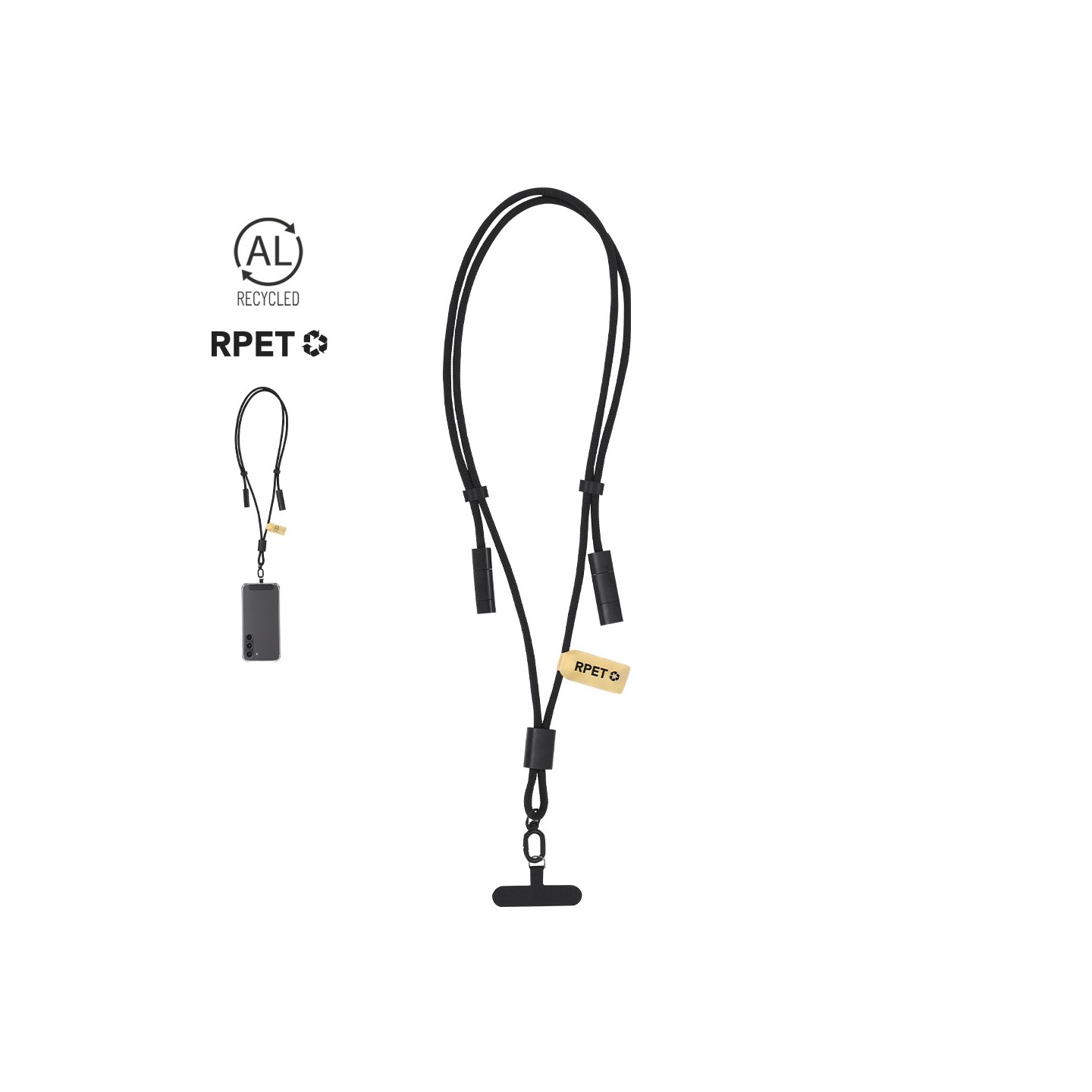Cable Cargador Soporte TEBRER 2 en 1, lanyard con cable cargador en RPET y aluminio reciclado. Entrada USB y Tipo C, salidas Micro USB, Lightning y Tipo C. Personalizable con tu logotipo.