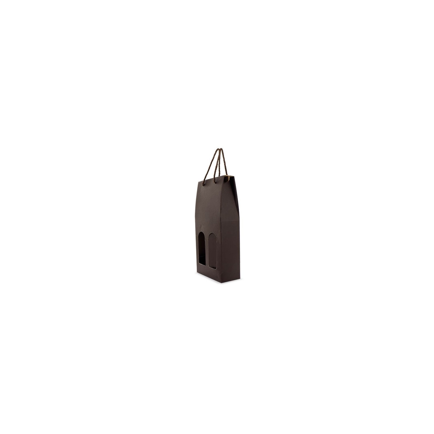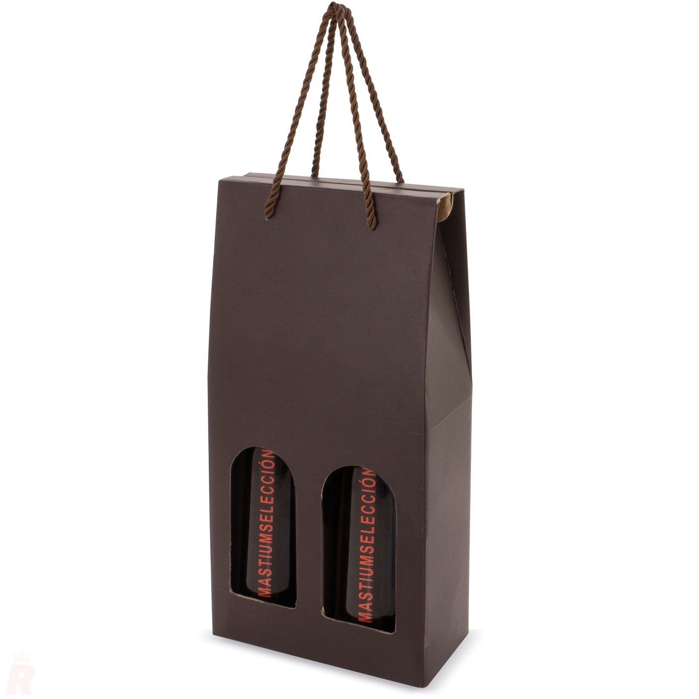 Caja cartón lujo reforzado para dos botellas vino. Con ventanas frontales y asa trenzada para un transporte elegante. Ideal para regalos y presentaciones sofisticadas
