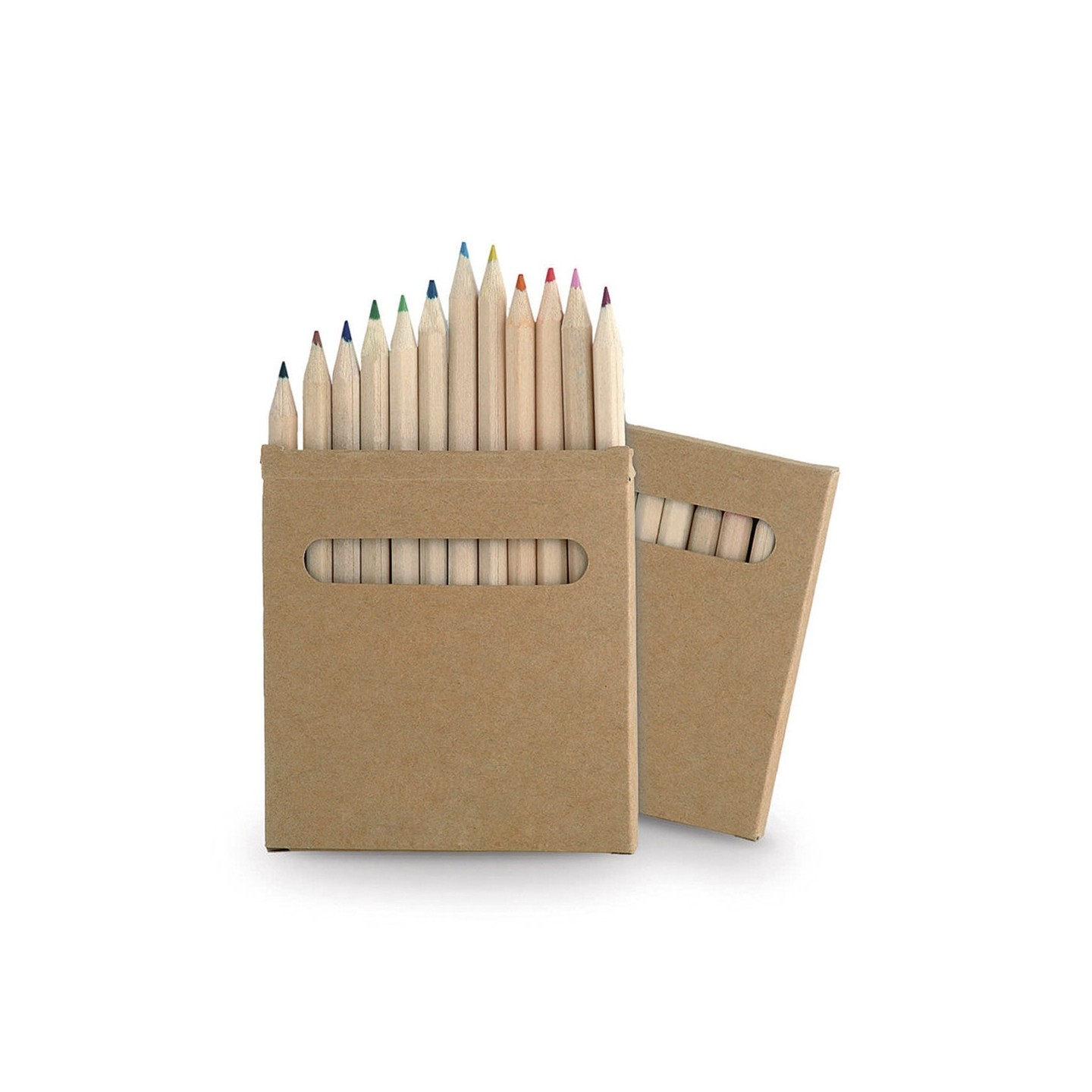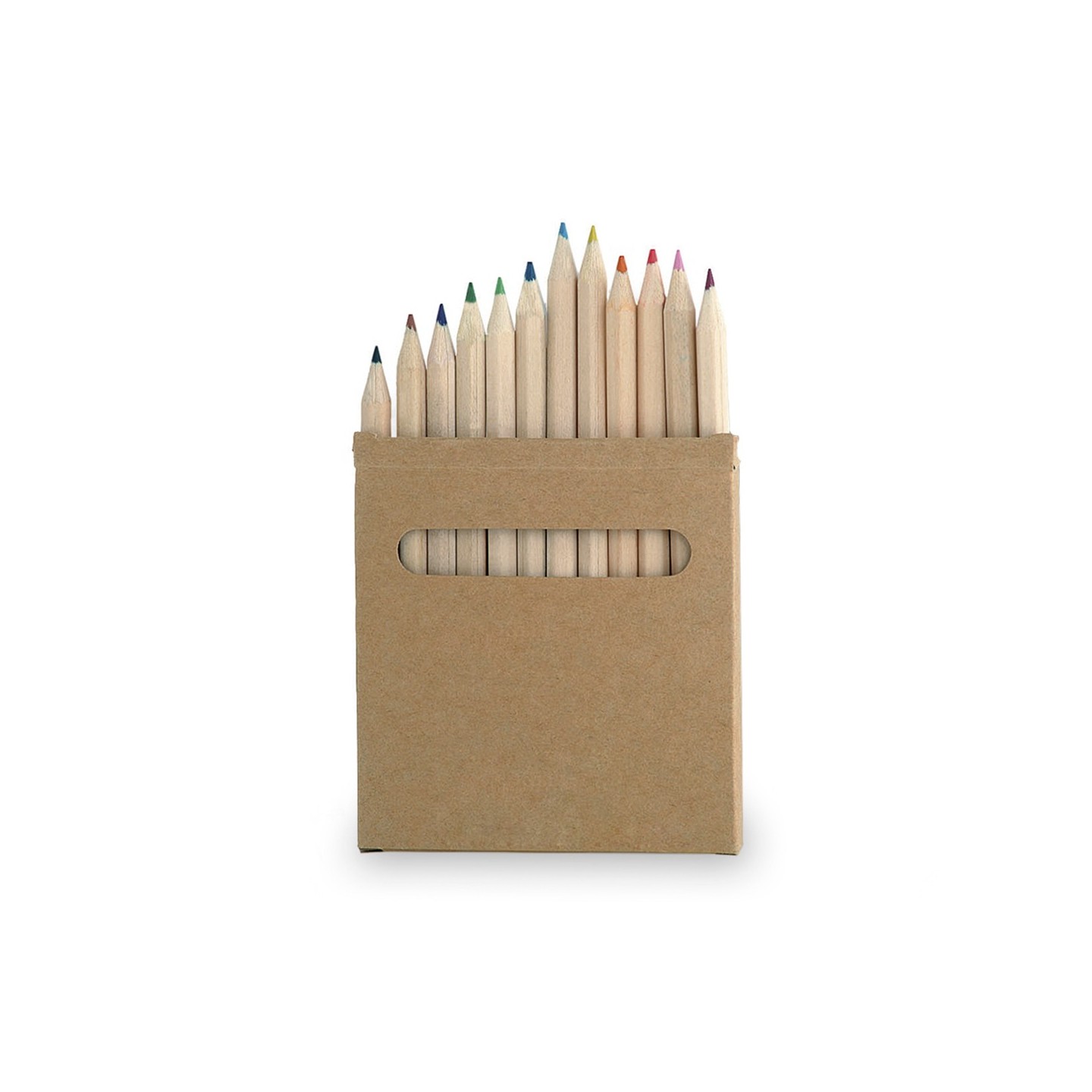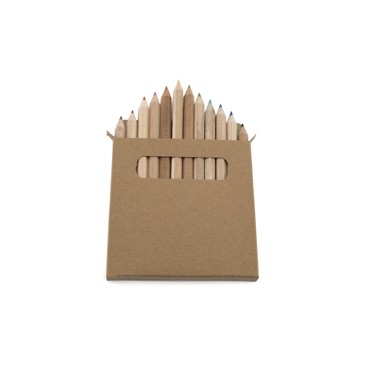 Set de 12 lápices en caja de cartón con ventana. Lápices de madera hexagonales con colores variados. Regalos personalizados y merchandising de calidad para empresas.