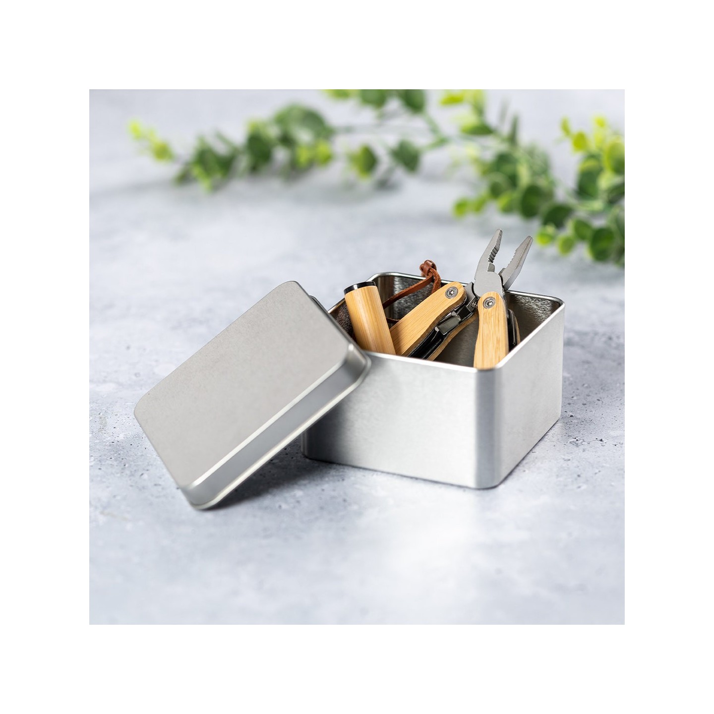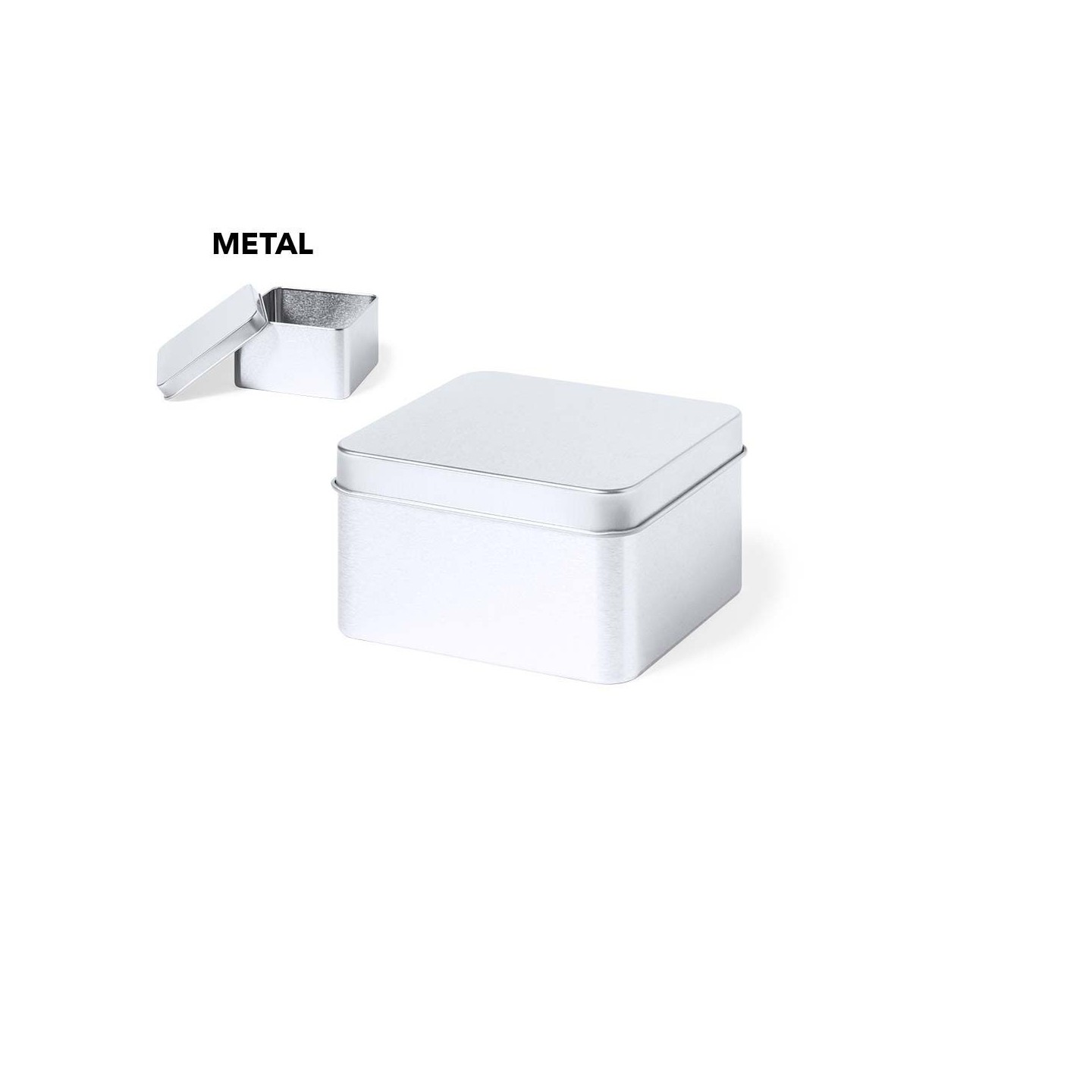 Destaca en presentaciones empresariales con la elegante Caja Presentación Topak, de formato cuadrado, metal plateado y tapa a juego para un impacto duradero.