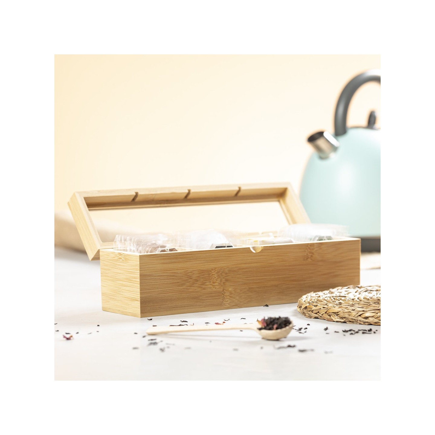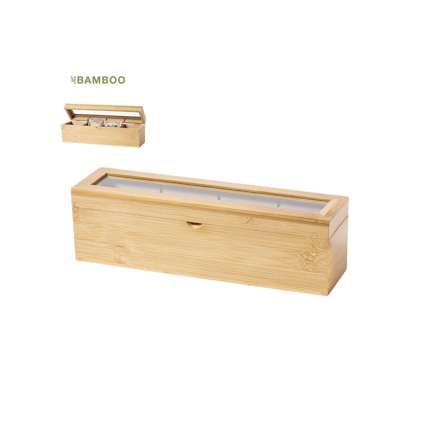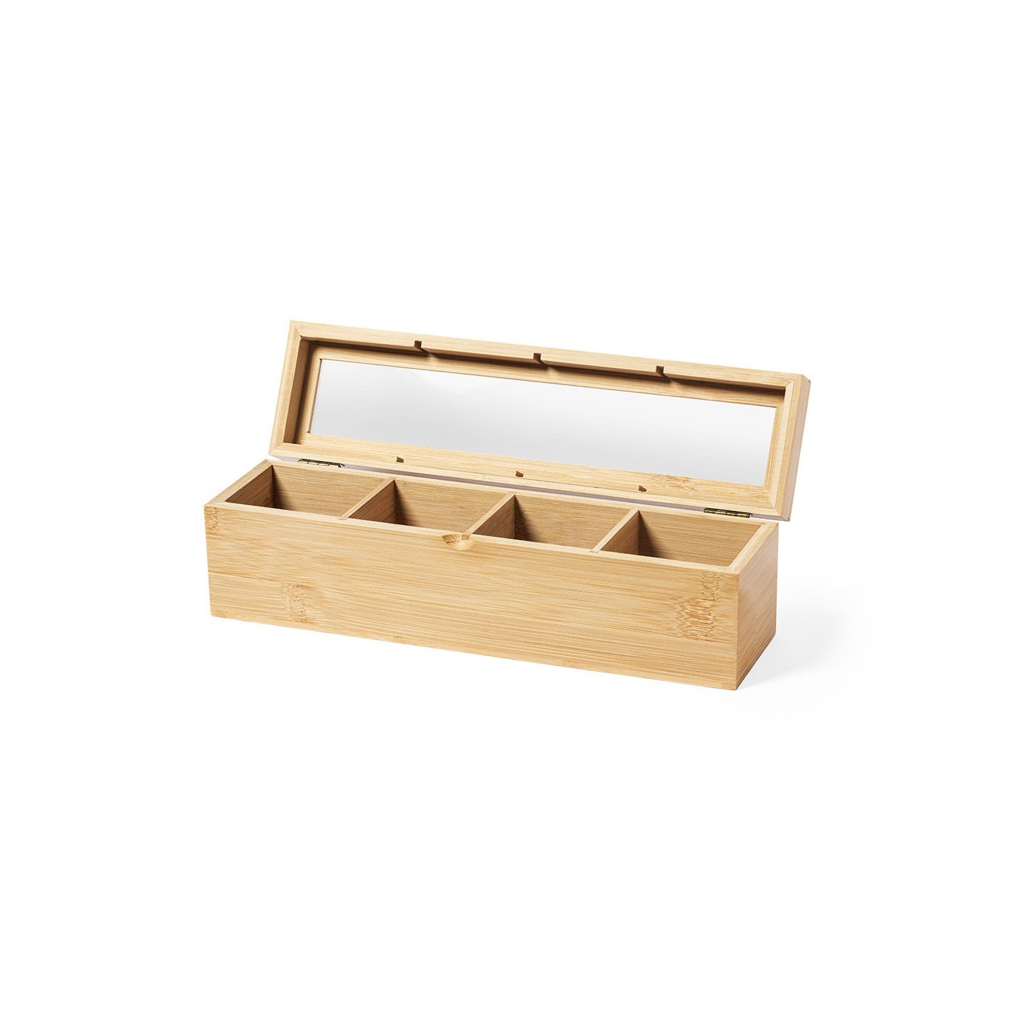 La Caja Té Zirkony es elegante caja de té de bambú con tapa de cristal. Incluye 4 compartimentos y viene en una atractiva caja de diseño eco. ¡Organiza y disfruta de tus tés favoritos!