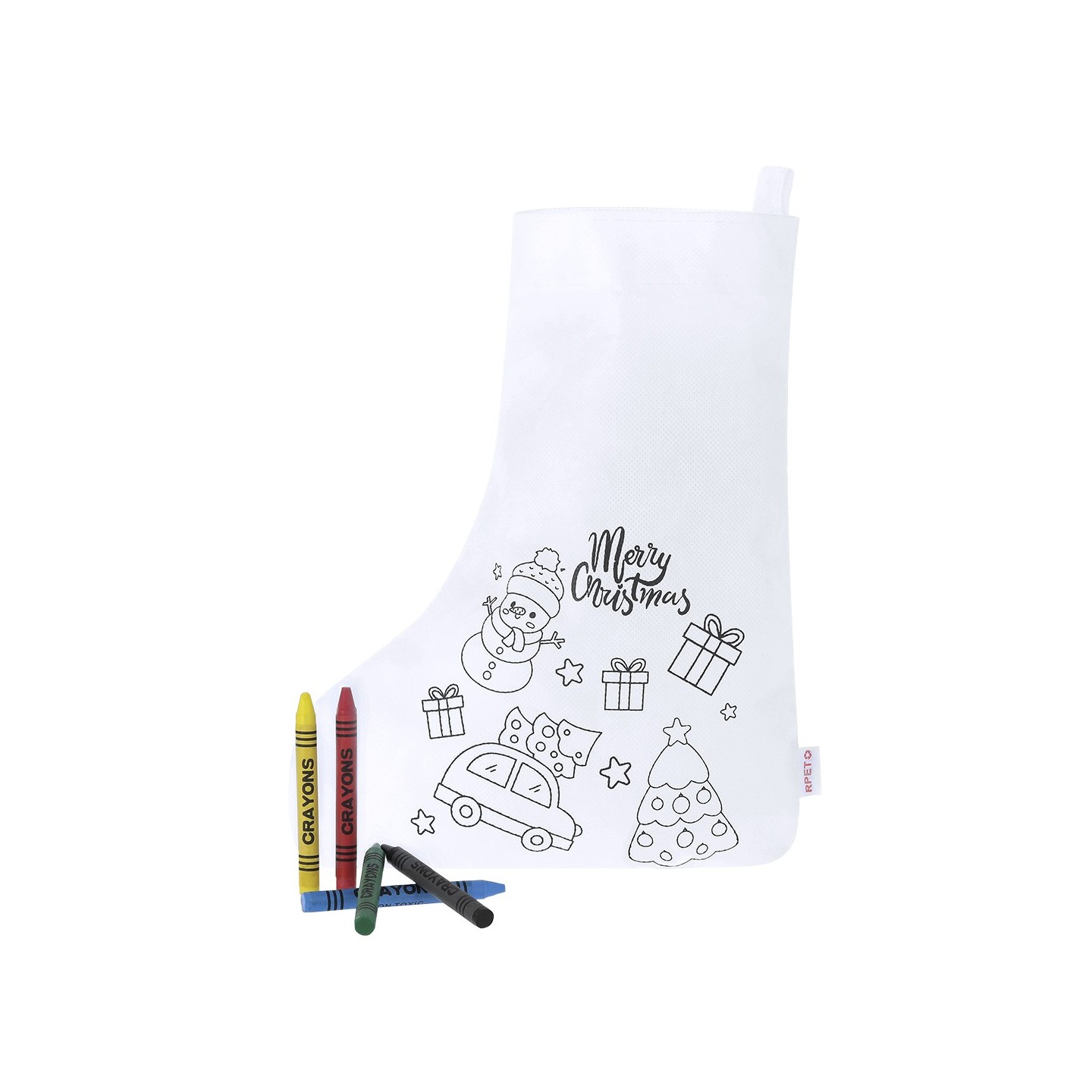 Calcetín Mordy de RPET personalizable con logotipo. Incluye divertidos dibujos navideños para colorear, 5 ceras y cinta para colgar. Hecho con plástico reciclado, ideal para un regalo navideño sostenible.