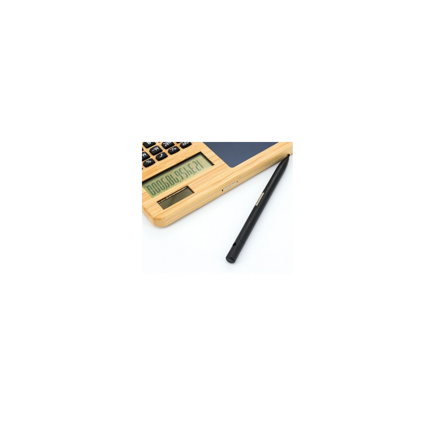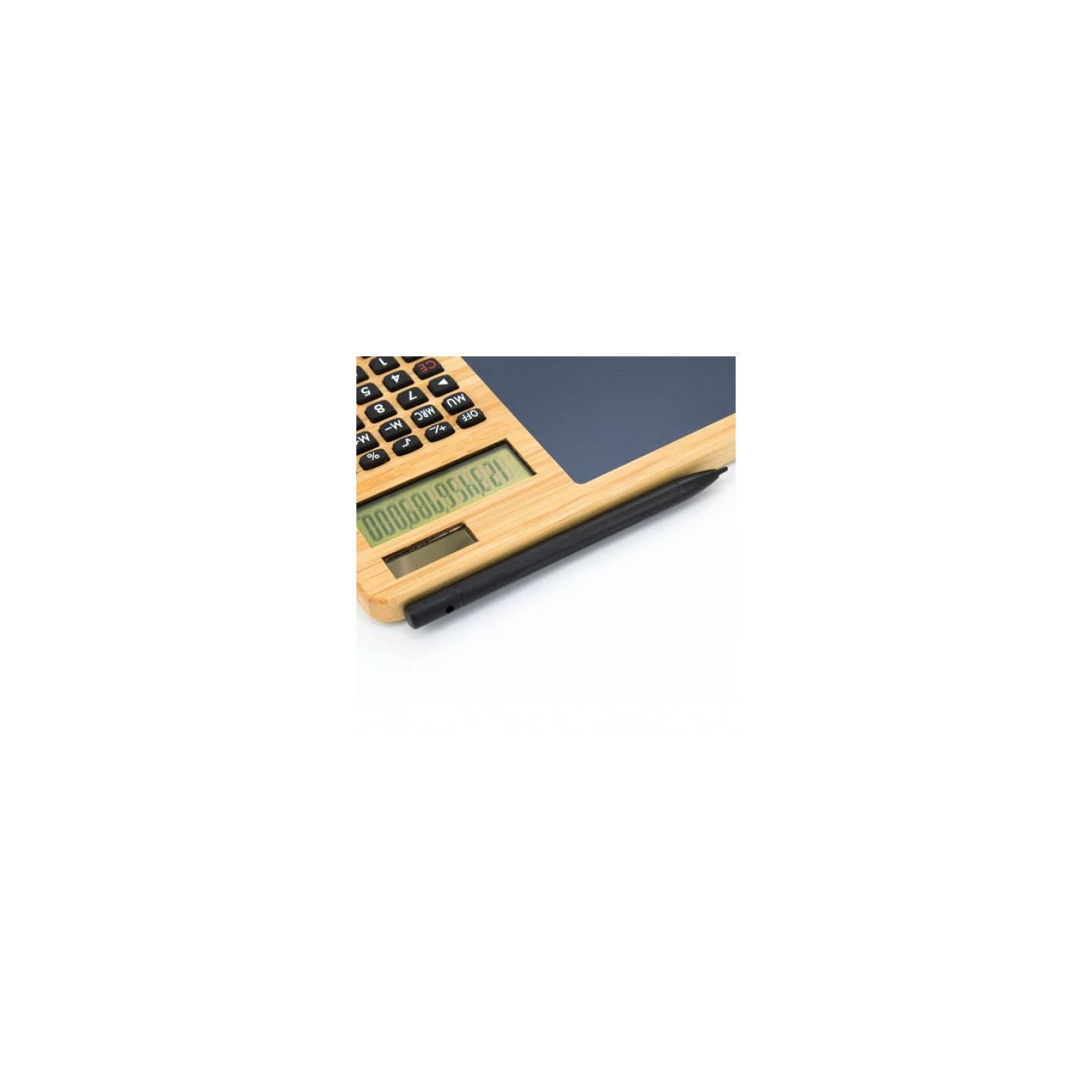 Calculadora ecológica de bambú pizarra automática y borrado al pulsar. Personalizable logotipo. Medidas: 24.30 x 17.50 cm. Carga micro-USB.