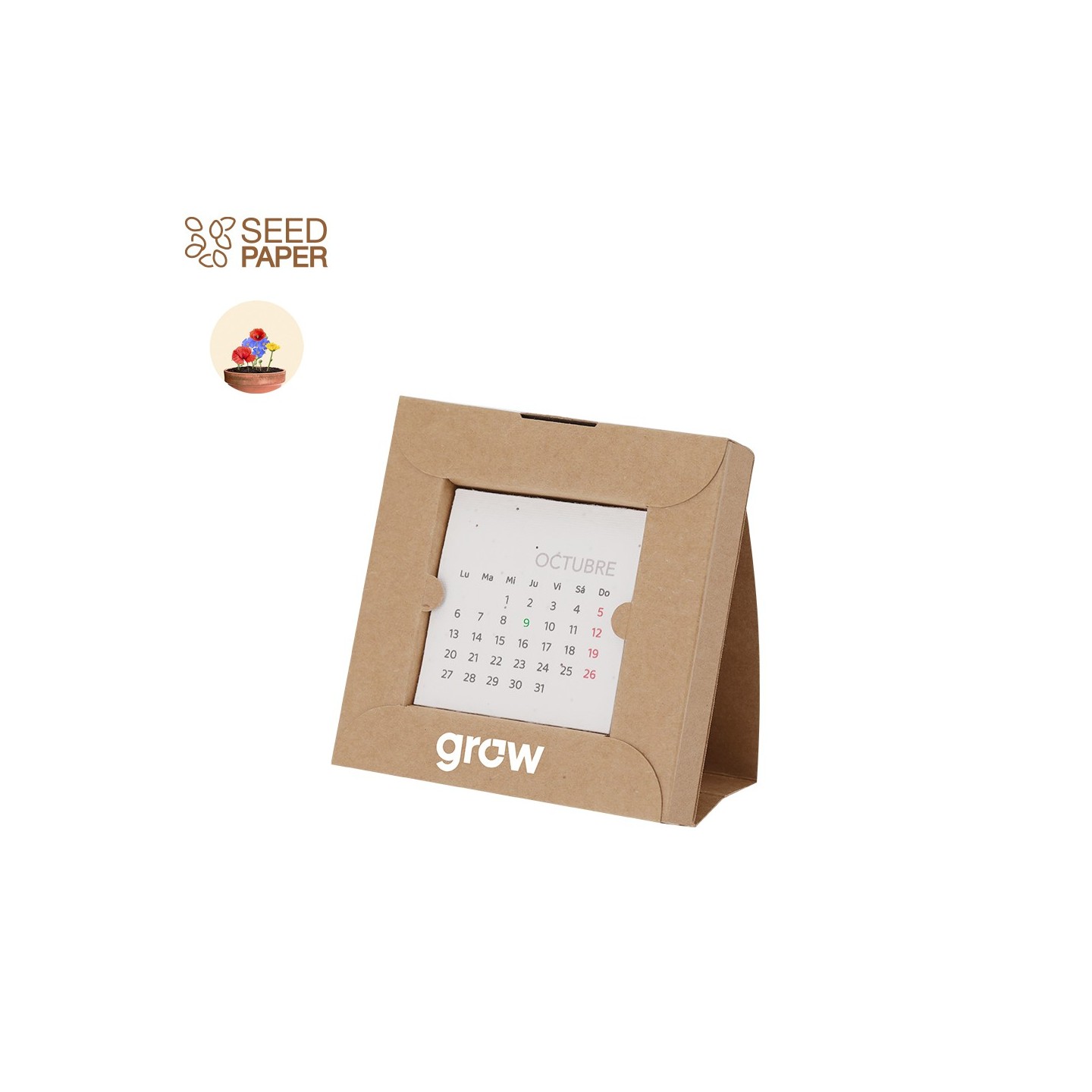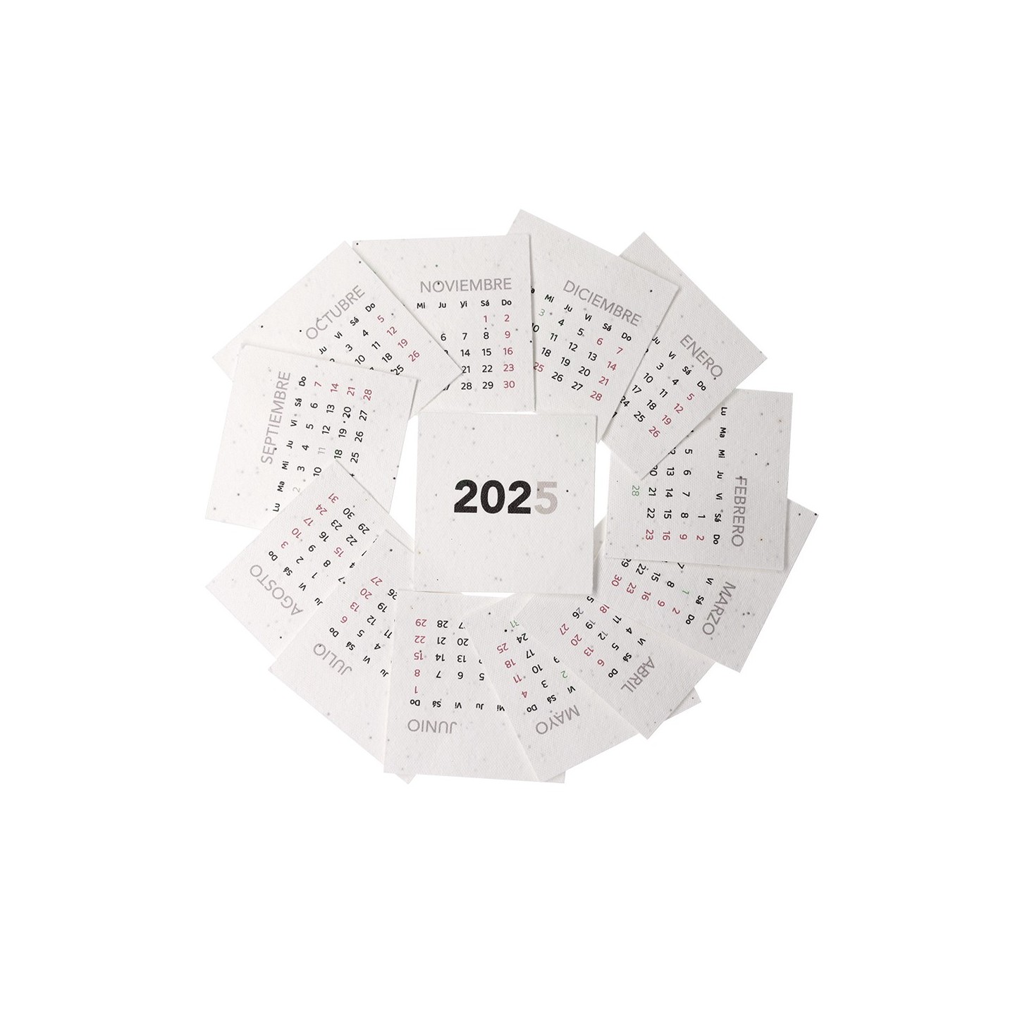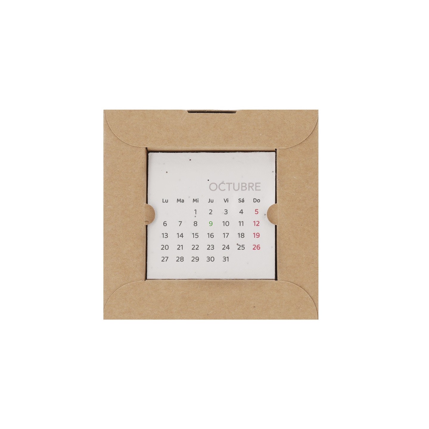 Calendario plantable con 13 hojas de papel semilla de petunia. Diseño con festividades marcadas, presentado en caja de cartón. Personalizable con logotipo.
