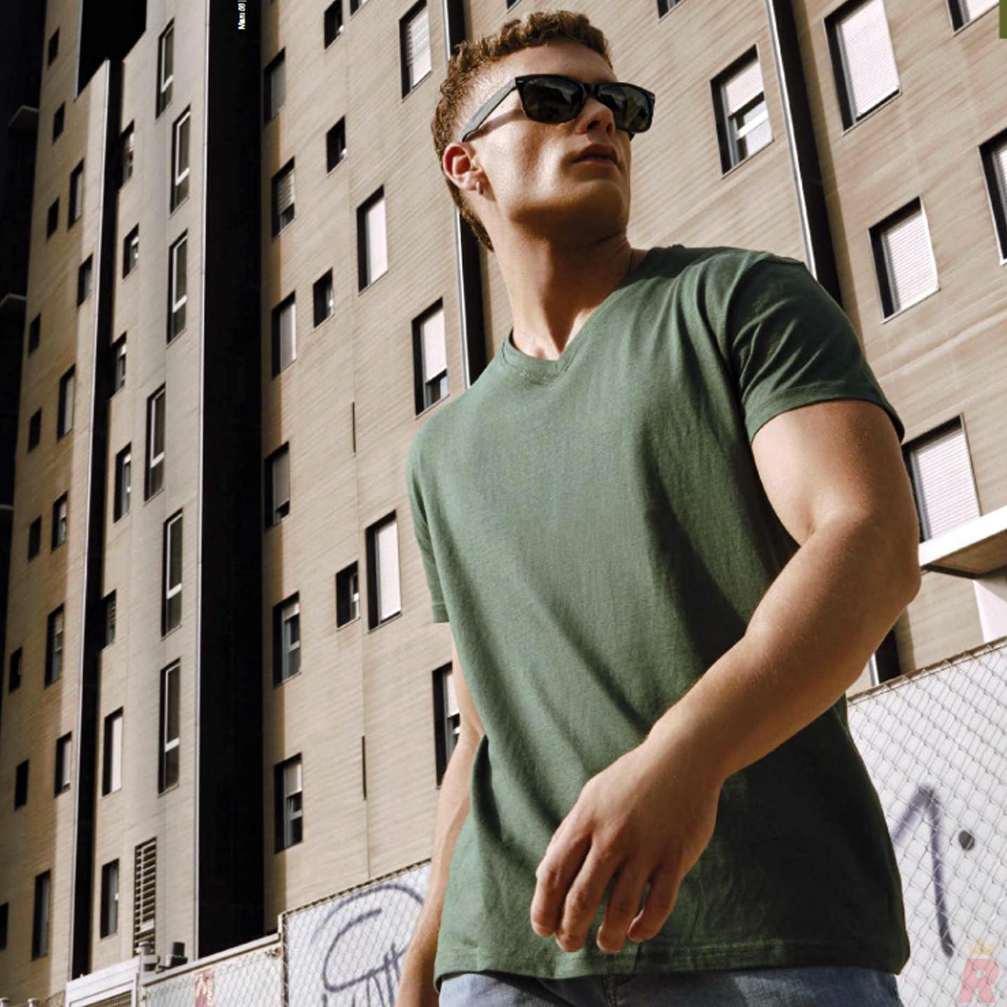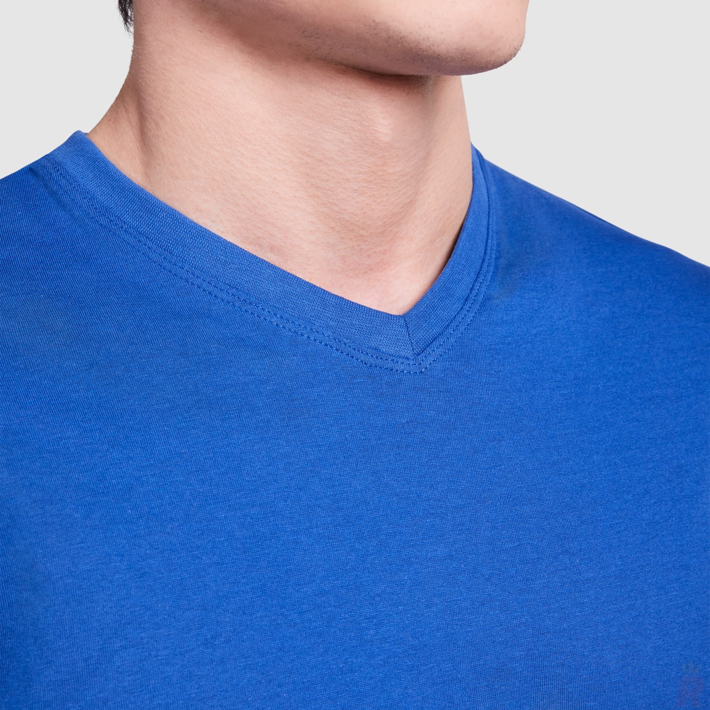 Camiseta básica de hombre con escote en pico, 100% algodón, diseño tubular y etiqueta removible. Ideal para personalizar con logotipo en campañas promocionales