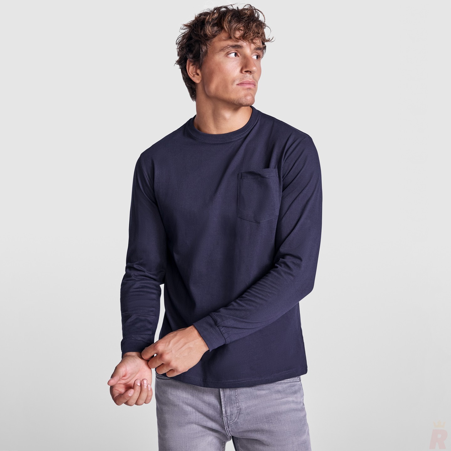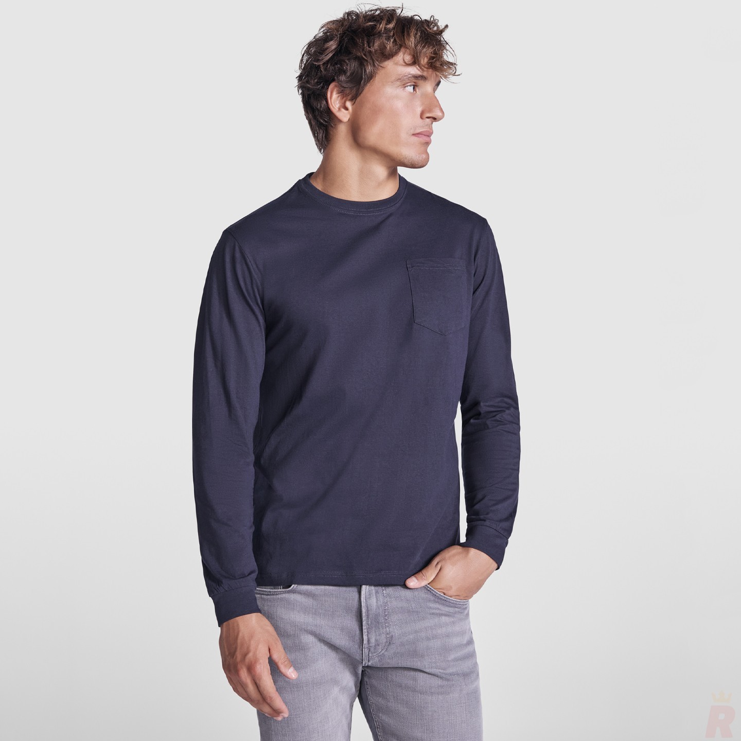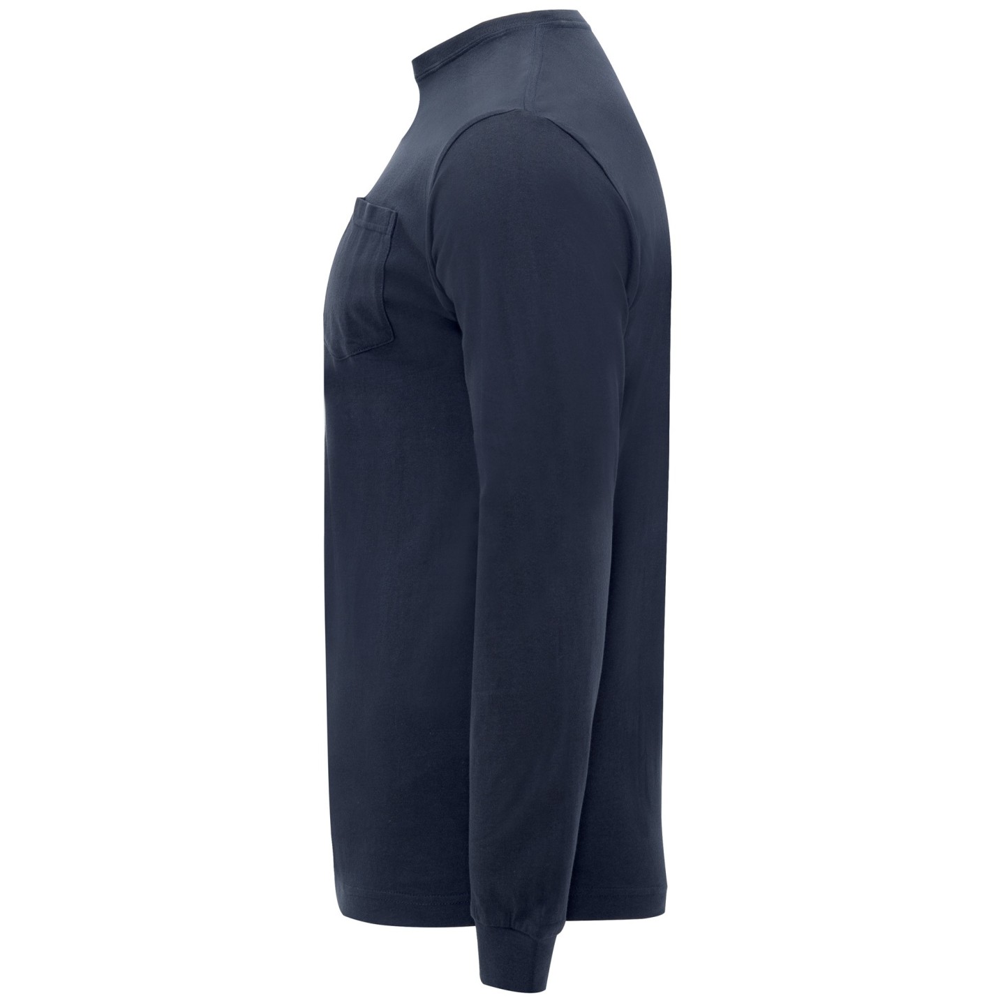 Camiseta de manga larga para hombre, 100% algodón, con cuello redondo y puños en canalé. Diseño cómodo y resistente con bolsillo en el pecho y cubrecosturas reforzado. Perfecta para personalizar con logotipo y merchandising empresarial