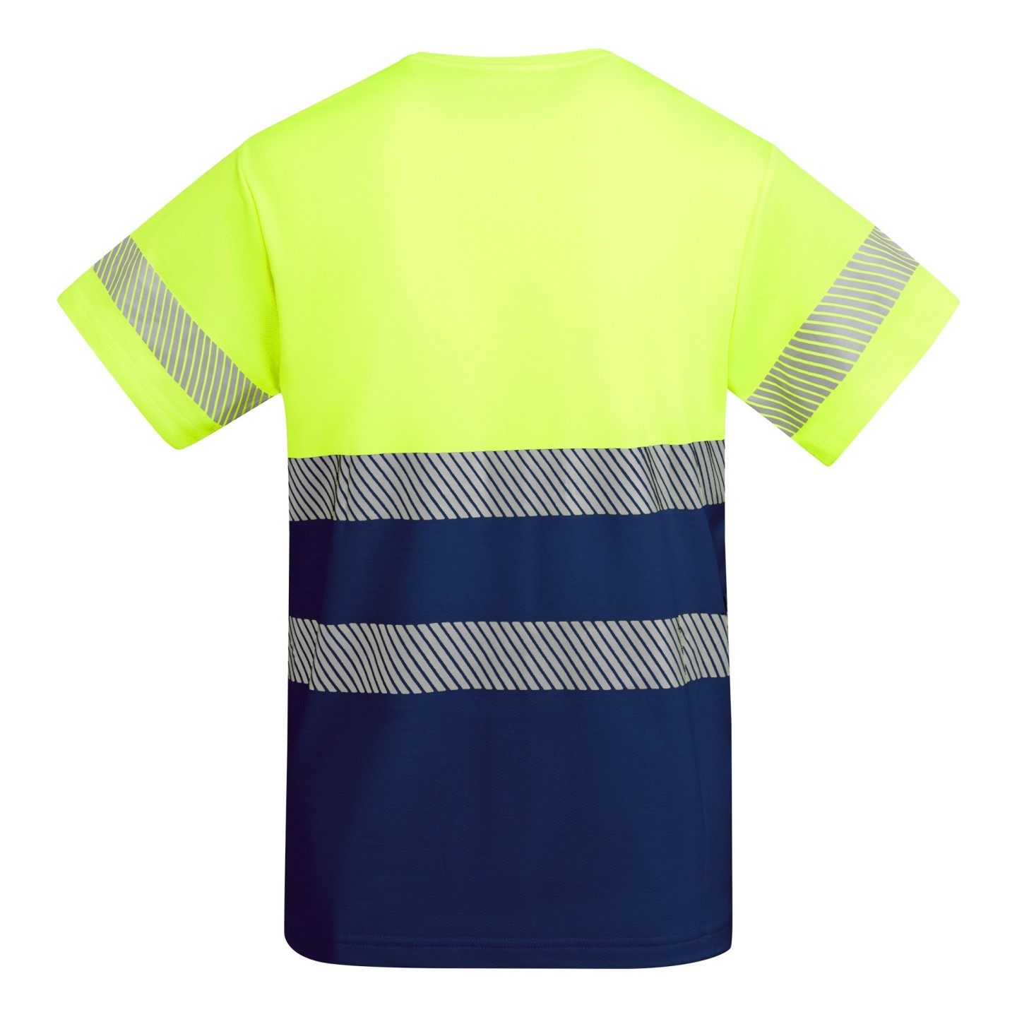 El diseño presenta un cuello redondo en el mismo tejido, que se adapta cómodamente al cuerpo. Destaca su patrón de alta visibilidad, con la parte superior en color fluorescente y la inferior en contraste, dividida por cintas reflectantes segmentadas que se sitúan estratégicamente en el torso y mangas, reforzando la visibilidad desde todos los ángulos. Estas cintas reflejan la luz con un diseño de franjas diagonales que añade un toque moderno y profesional a la prenda.