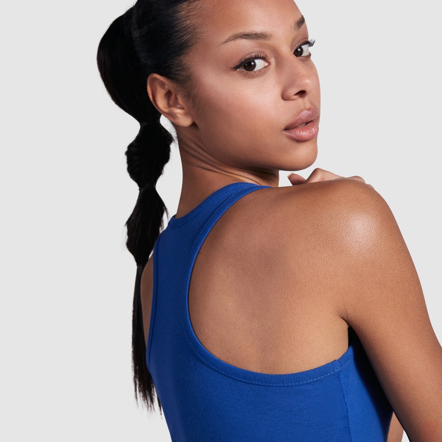 El diseño de espalda estilo nadadora le aporta un aire deportivo y dinámico, ideal para actividades físicas o looks casual. Las sisas y escote ribeteado, anchos y enrollados, no solo aumentan la resistencia de la prenda, sino que le confieren un acabado moderno y de calidad.