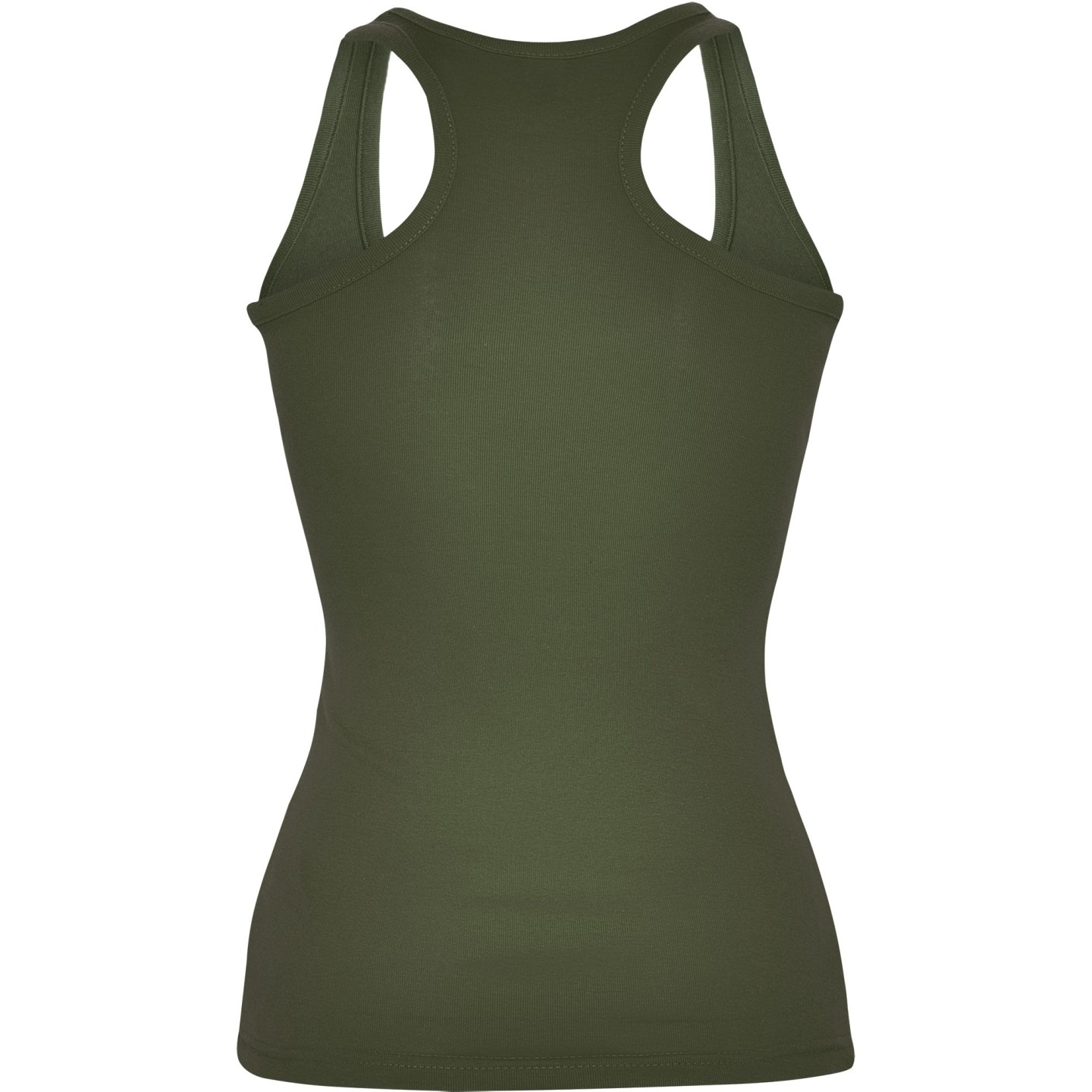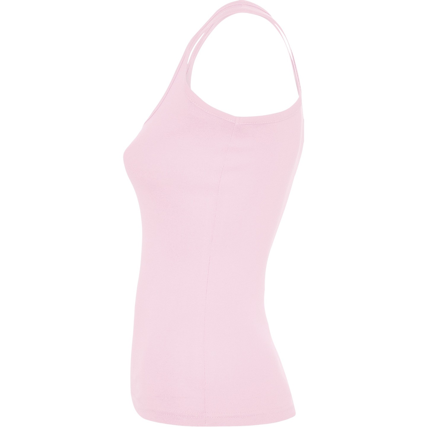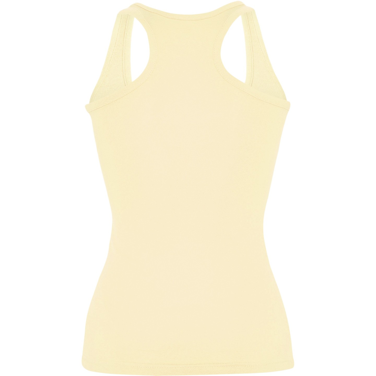 Camiseta de tirantes entallada para mujer con espalda nadadora, costuras laterales y etiqueta removible. Fabricada en algodón canalé 1x1 de 220 g/m² para máximo confort y durabilidad