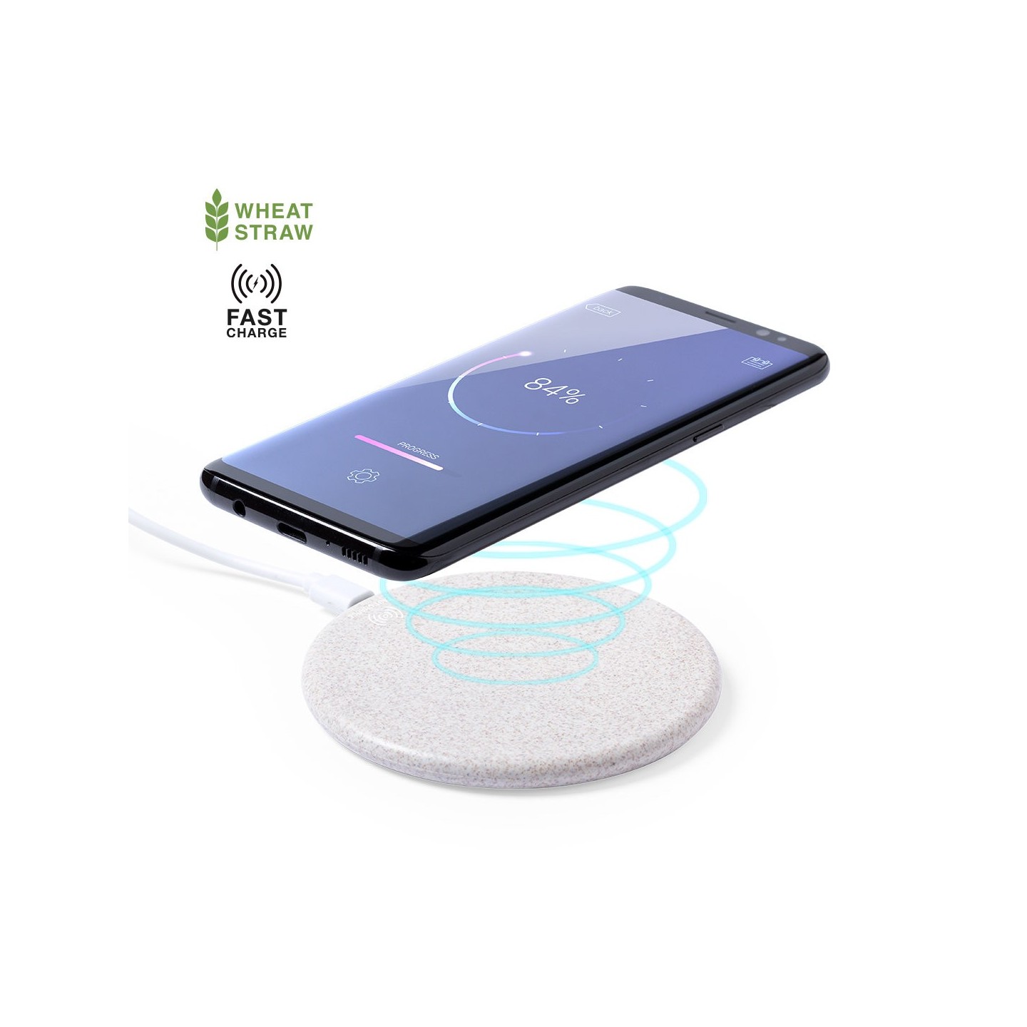 ¡Carga tus dispositivos con conciencia ambiental gracias a nuestro Cargador Aleix! Este cargador inalámbrico de diseño circular está fabricado en caña de trigo, promoviendo el uso de materias primas naturales y reduciendo las emisiones contaminantes.