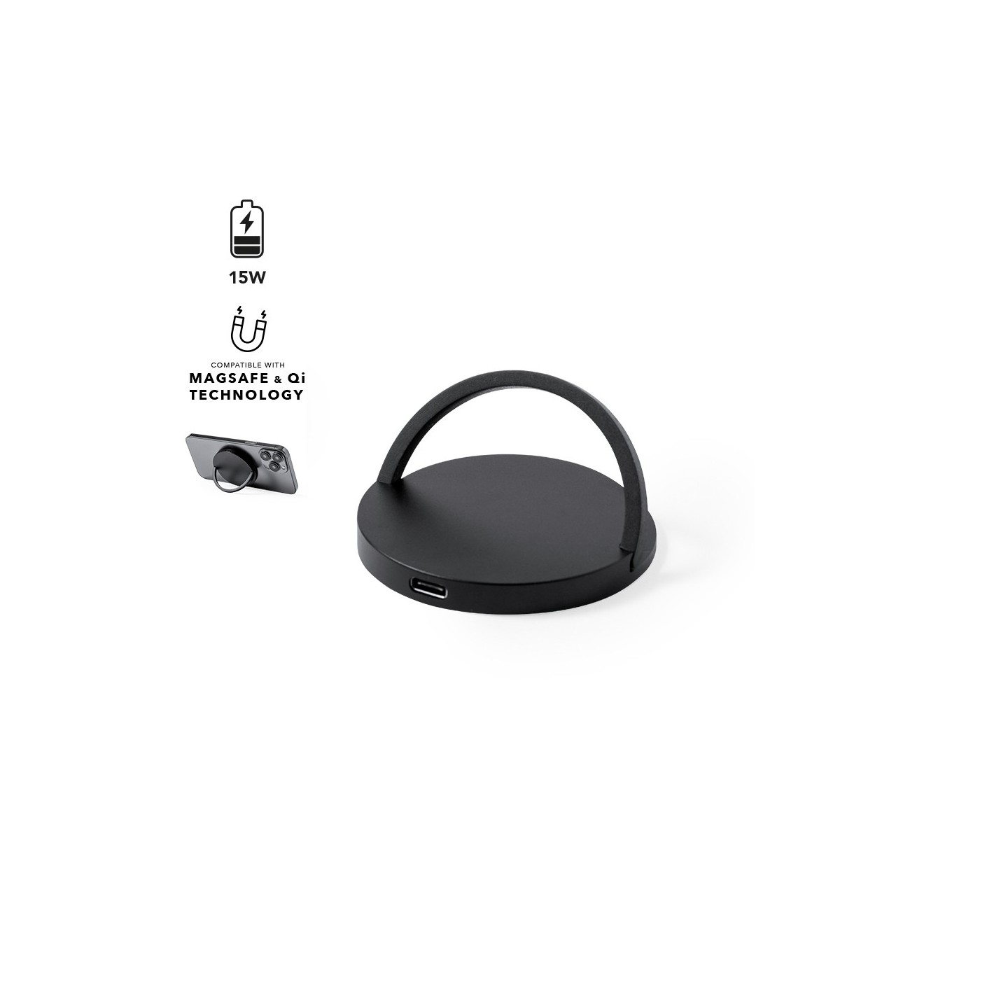 El Cargador Bellmer es inalámbrico magnético 15W en aluminio. Con soporte regulable y indicador de carga. Personalizable con tu logo