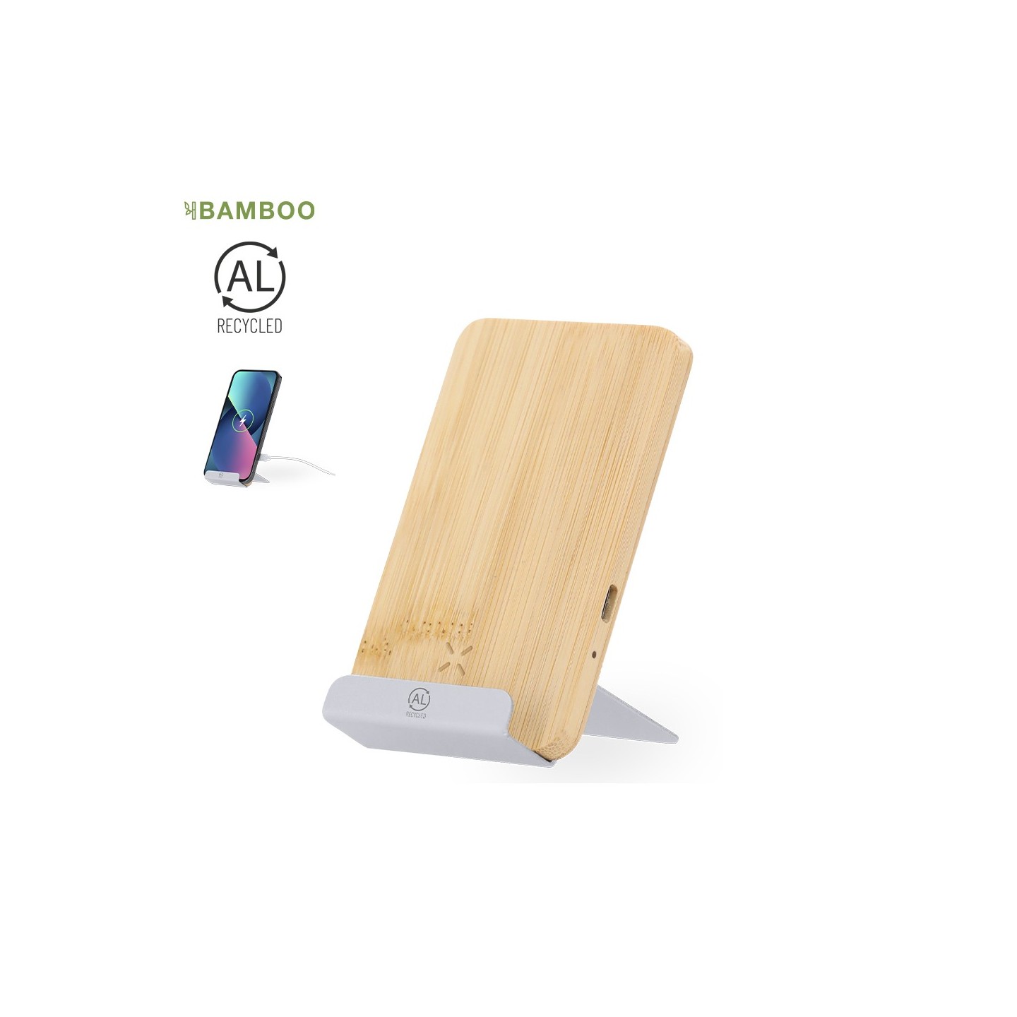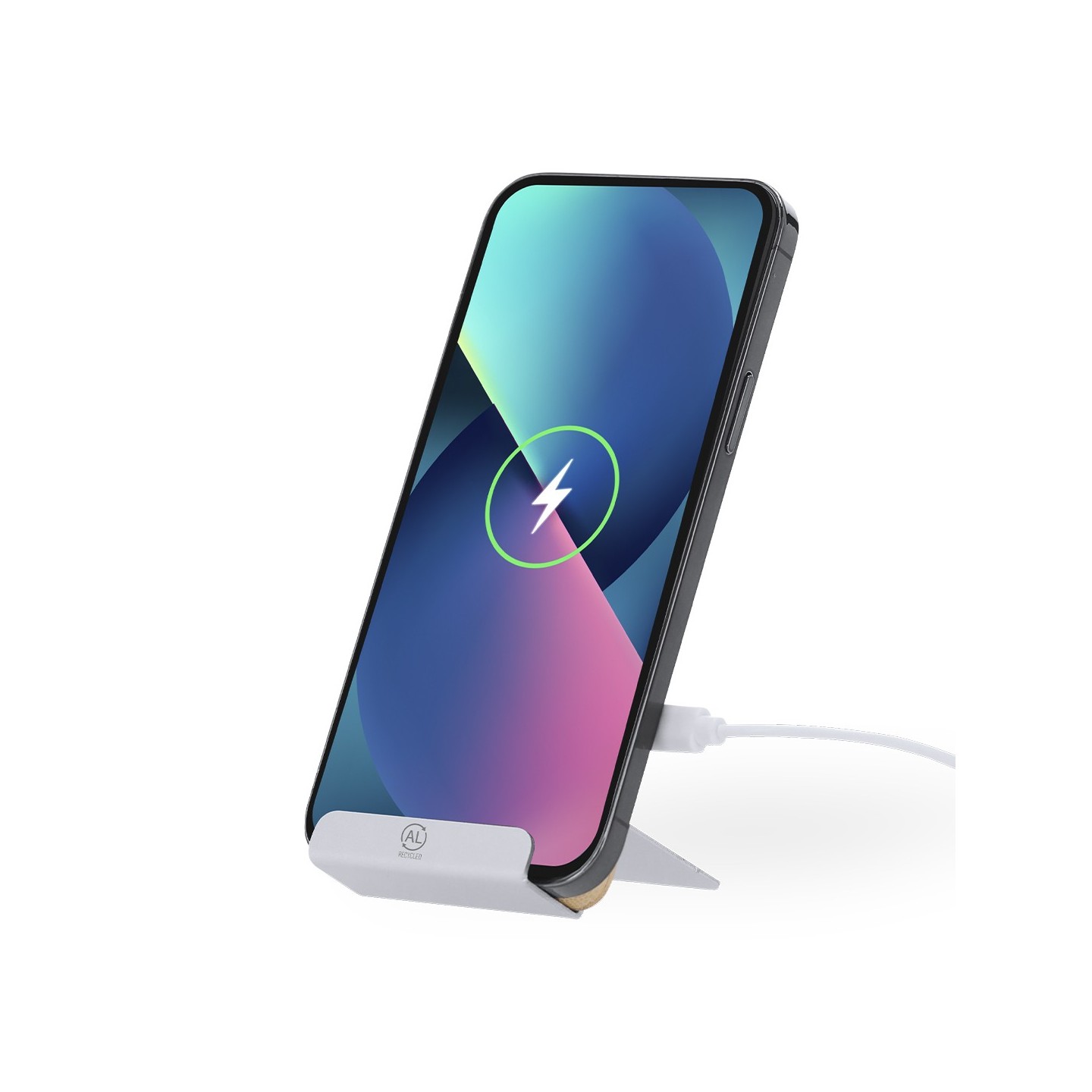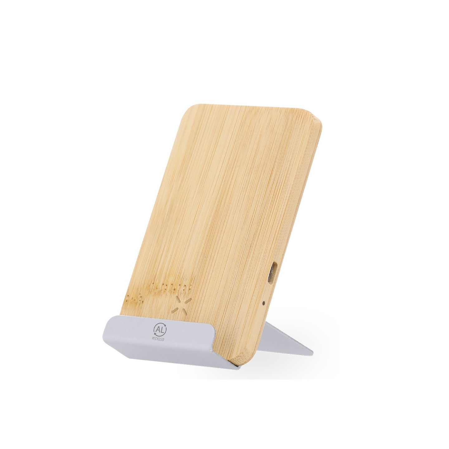 Cargador inalámbrico 15W con soporte para smartphone, fabricado en bambú y aluminio reciclado. Incluye cable Tipo C. Personalizable con logotipo. Ideal para regalos sostenibles y tecnológicos.
