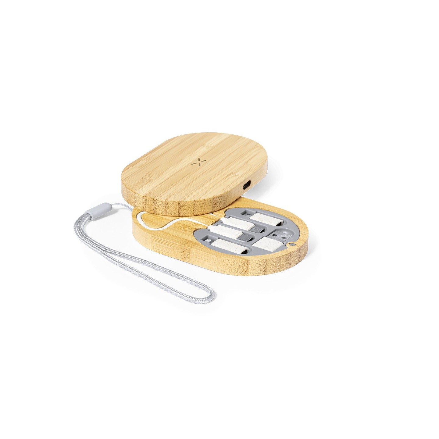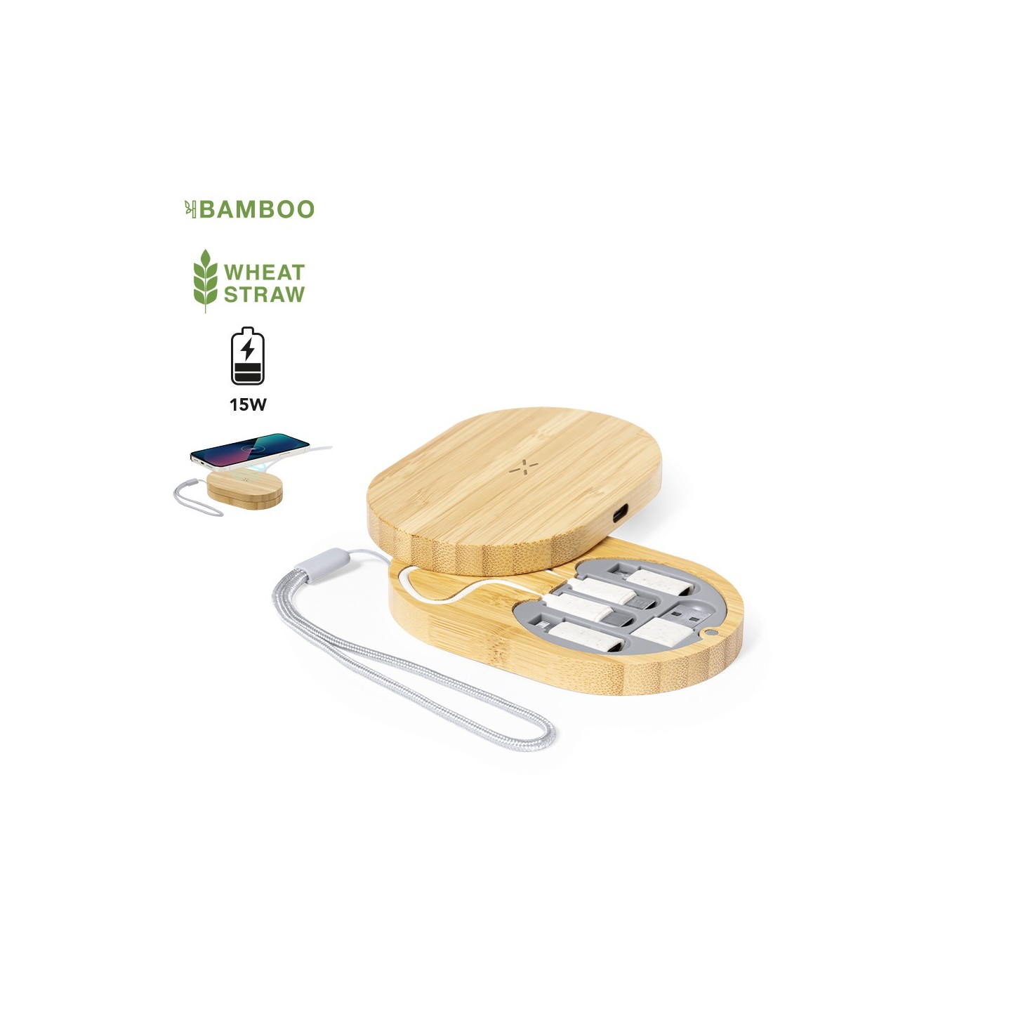 Completo conjunto de cargador inalámbrico 15W y cables cargadores. Fabricado en bambú pulido, en un original diseño de estuche con cargador inalámbrico integrado en la tapa y una base troquelada, que incluye un completo set de cables y adaptadores. Cargador compatible con dispositivos equipados con tecnología Qi. Set cables de carga con capacidad de transferencia de datos y múltiples conexiones: Micro USB, Tipo C y Lightning. 5V DC 3A. Presentado en caja diseño kraft.