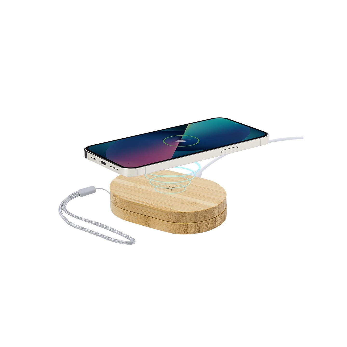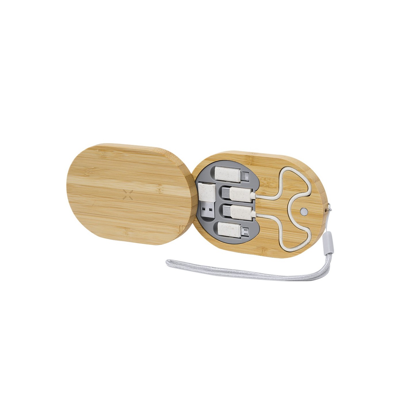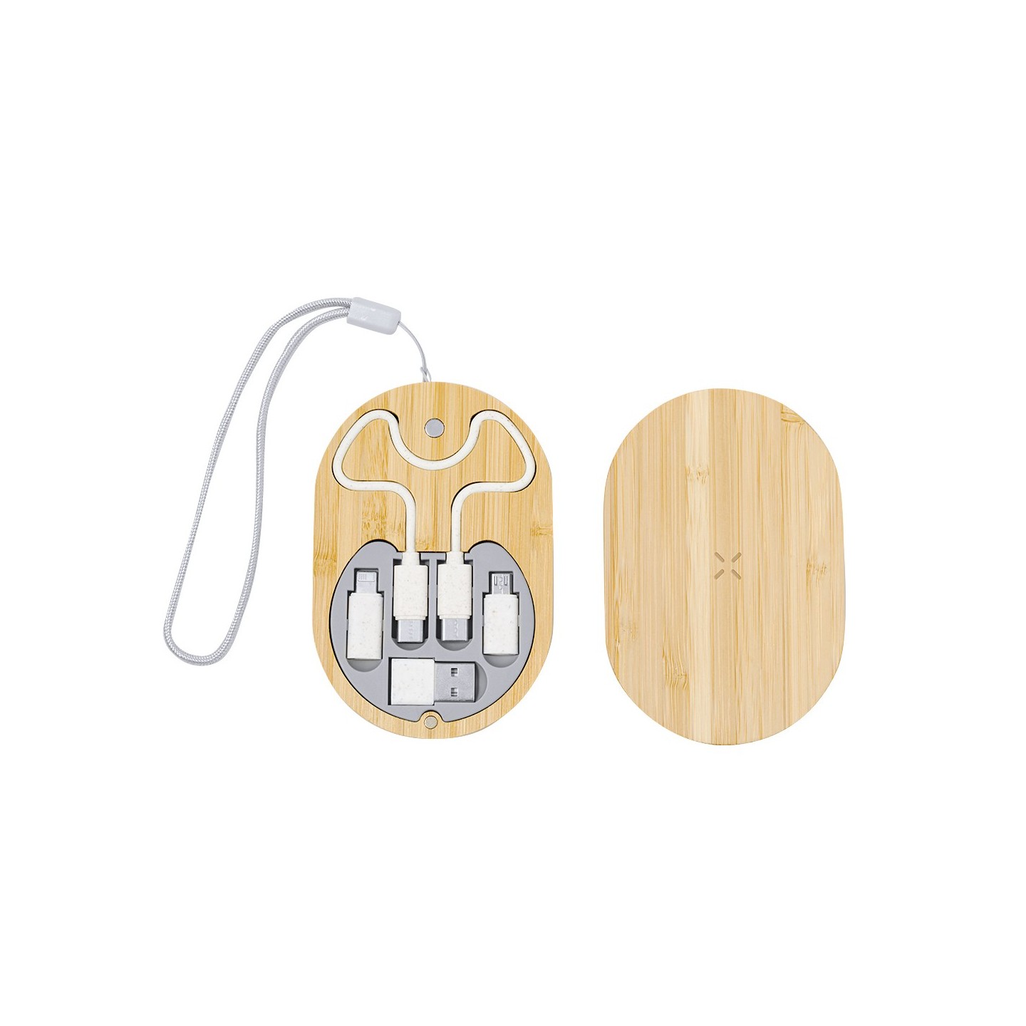 Conjunto cargador inalámbrico y cables Eliot en bambú pulido. Ideal para regalos personalizados. ¡Haz tu marca única!