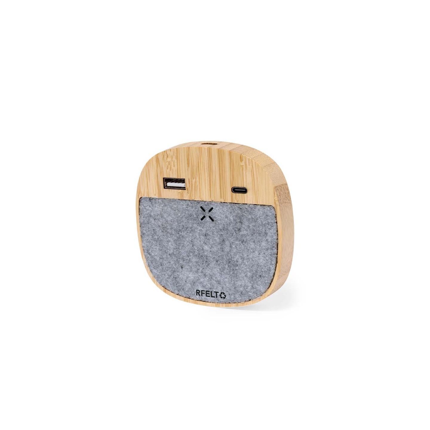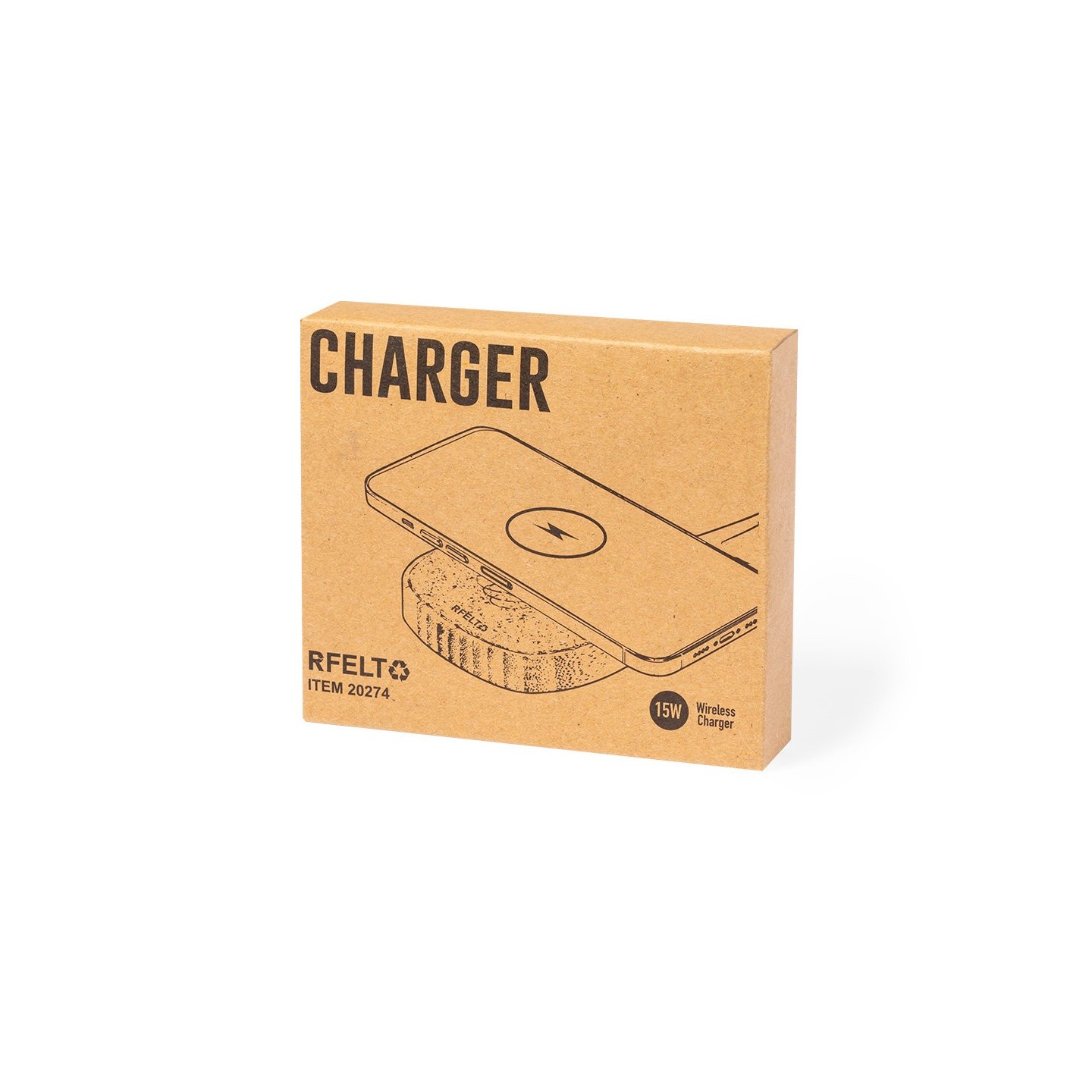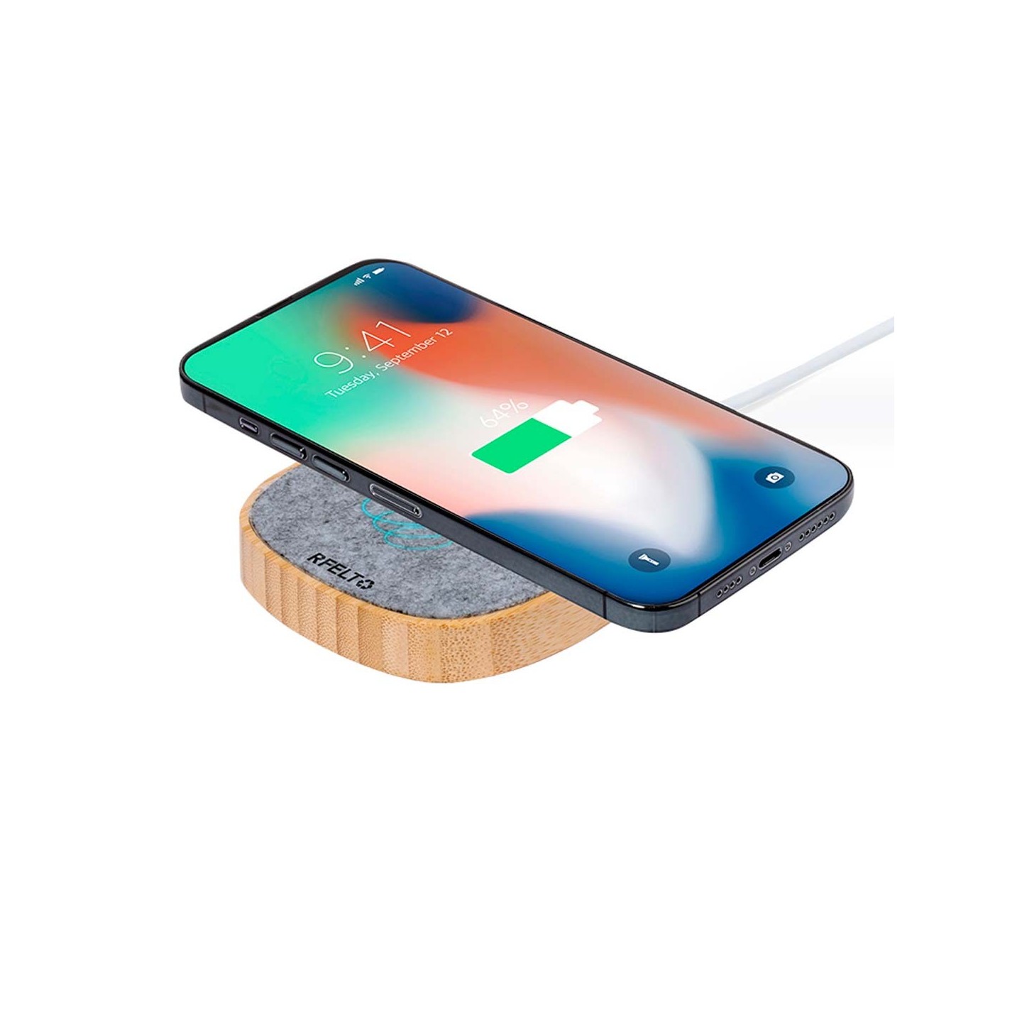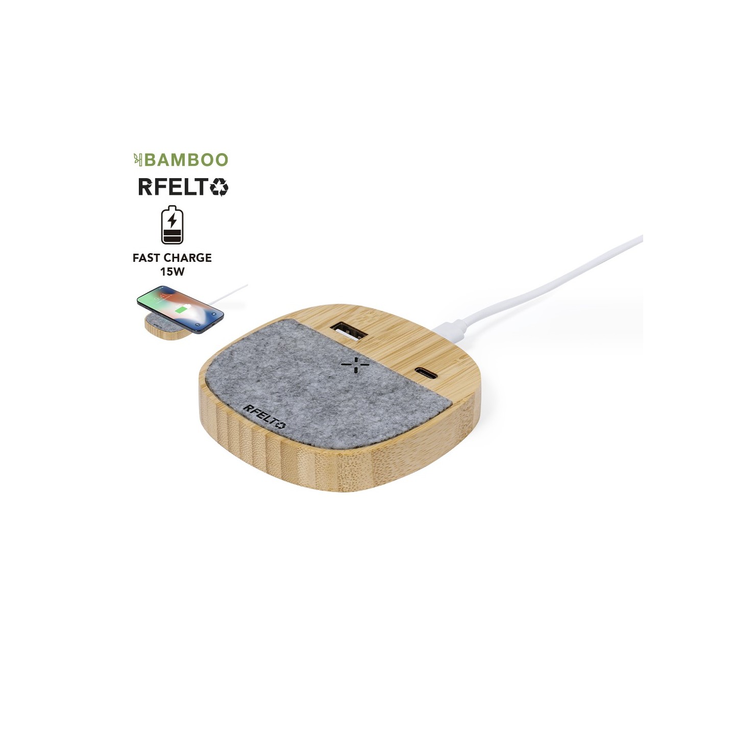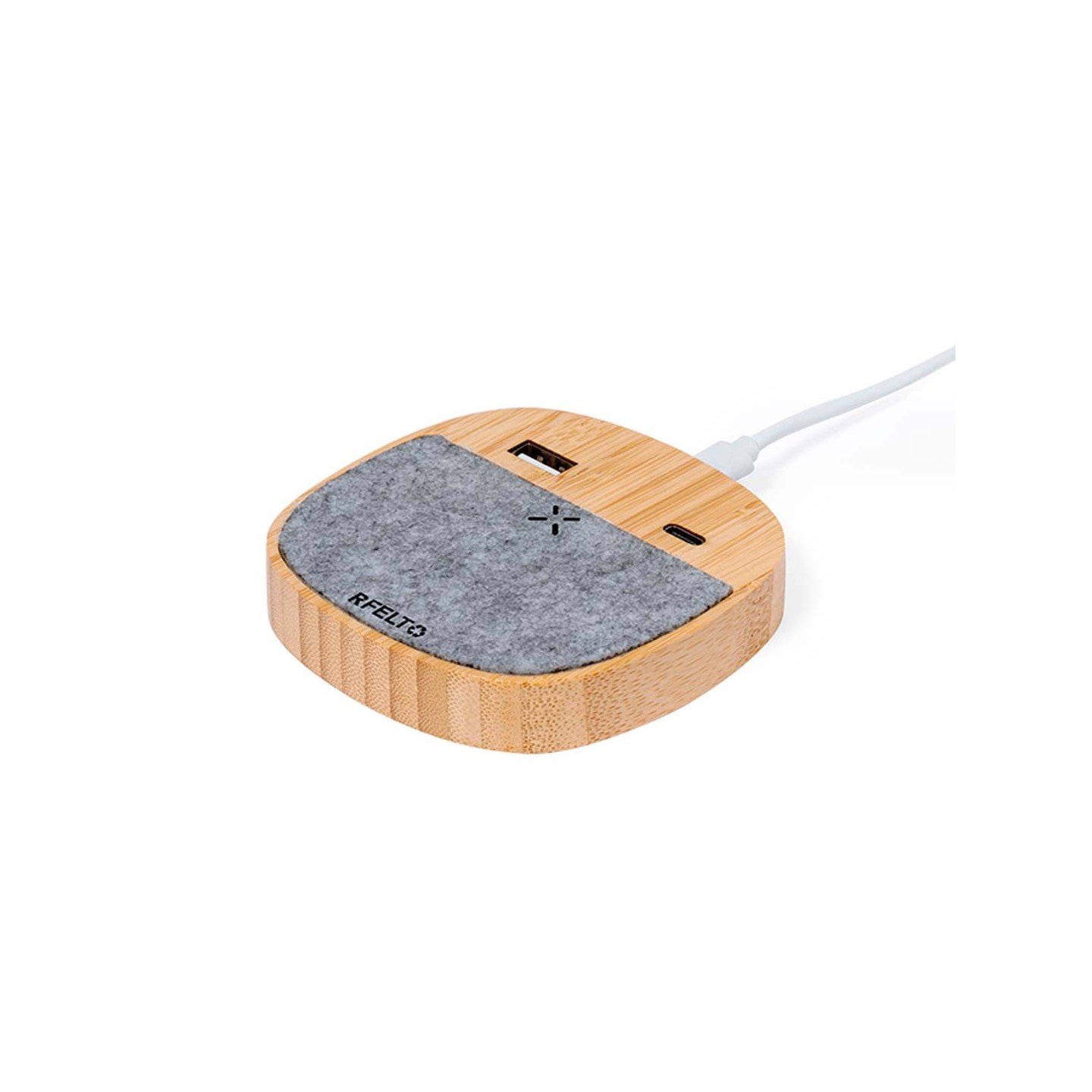 El Cargador Emerson es inalámbrico de bambú y fieltro RPET, carga 15W, múltiples salidas, sostenible. Ideal para tecnología Qi