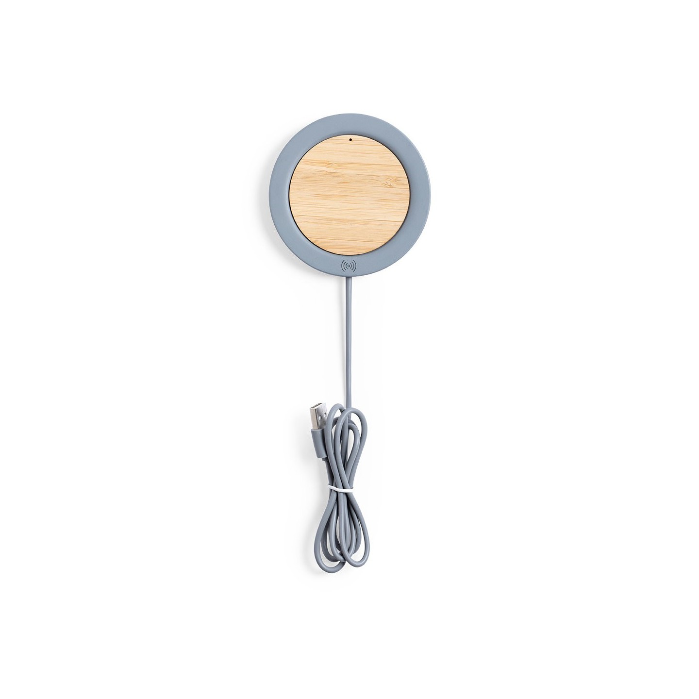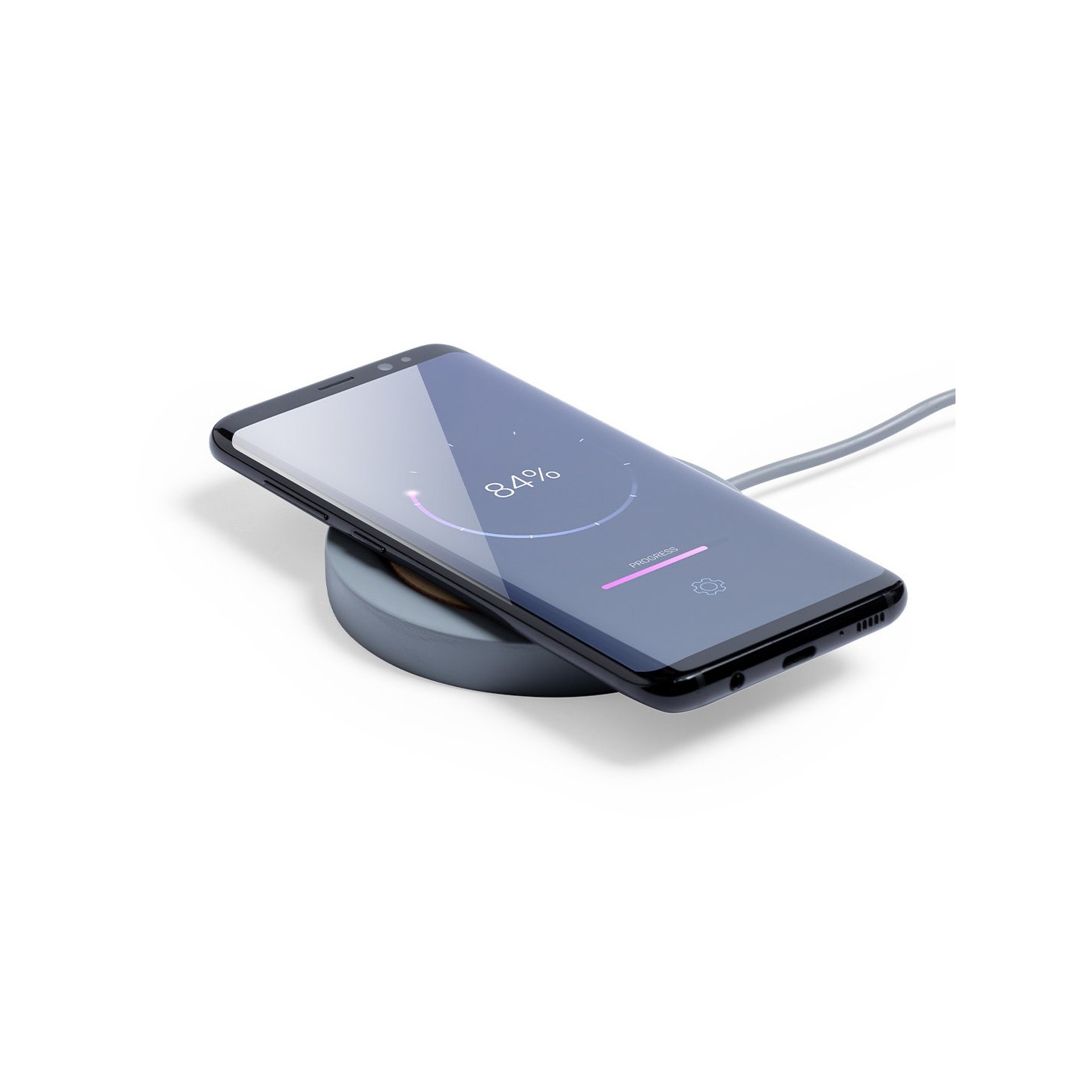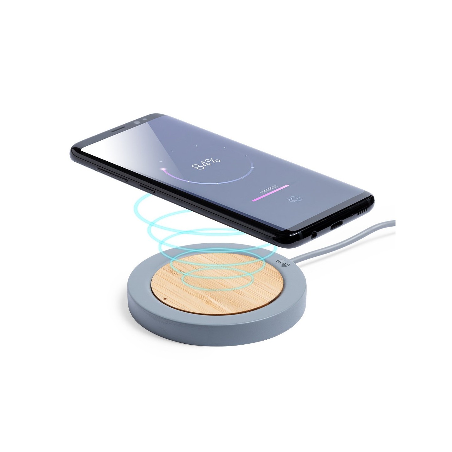 El Cargador Feskon es de diseño circular de bambú y cemento de piedra caliza. Carga inalámbrica, indicador LED y seguridad avanzada.